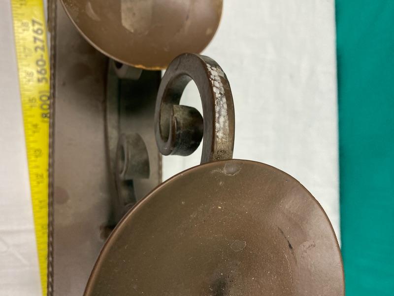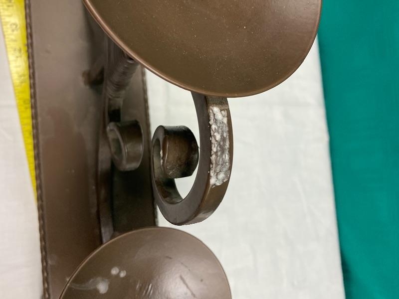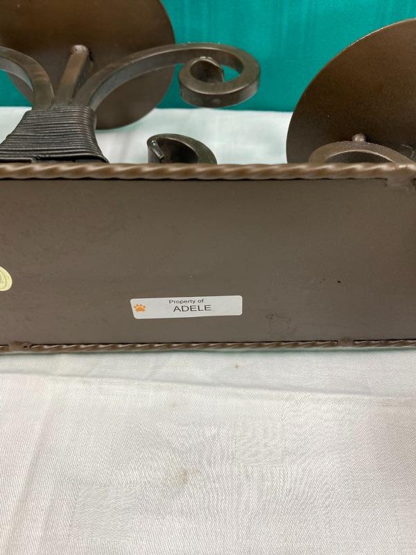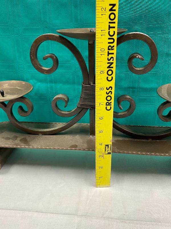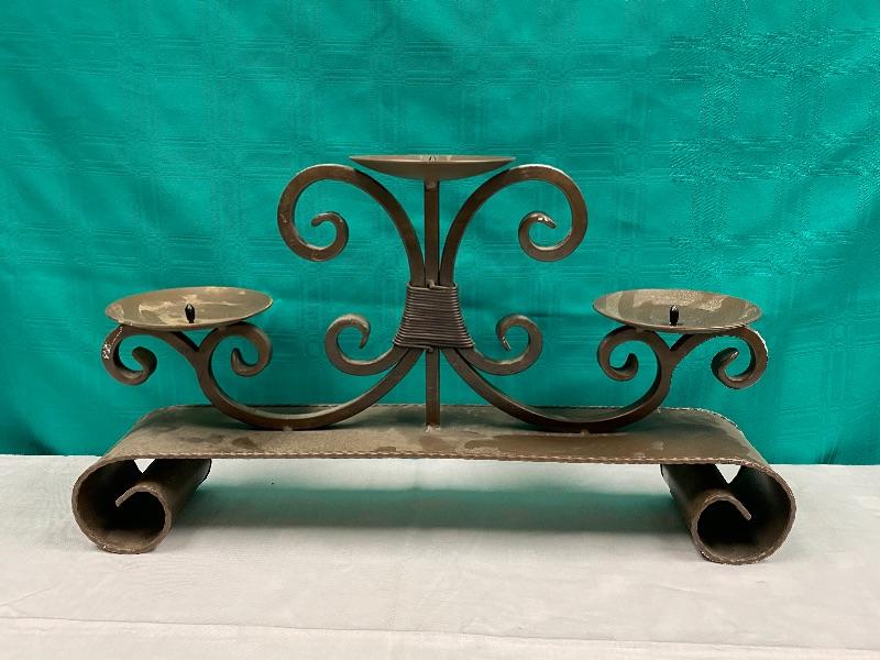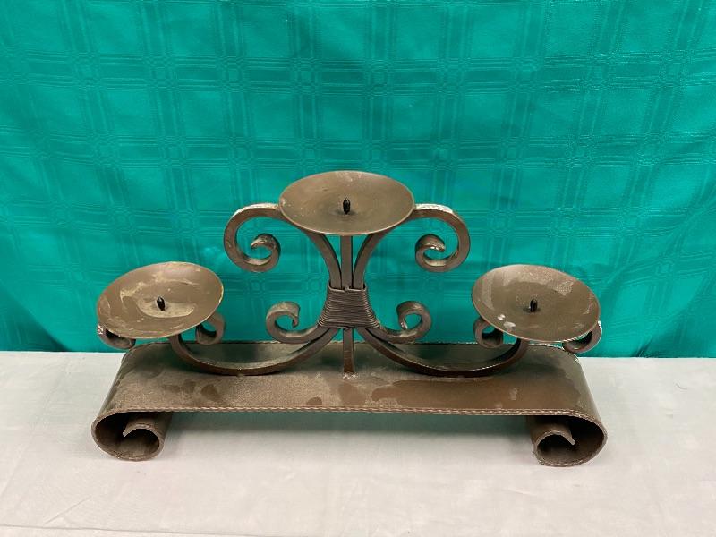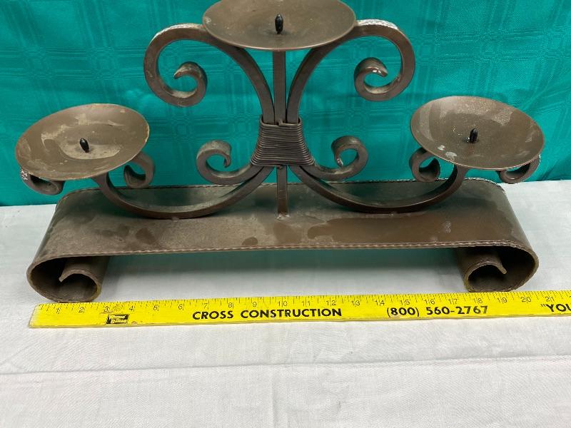Large and heavy meatal candle holder. About 20" wide, and almost 12" tall, holds 3 pillar candles. It needs to be cleaned, it has what looks like foam residue stuck on it in spots from being stored.