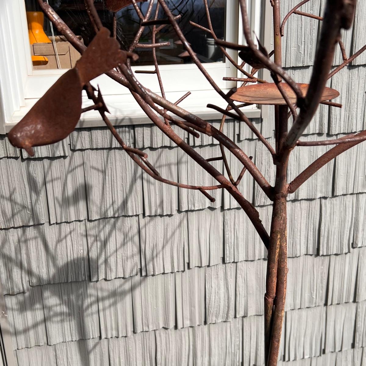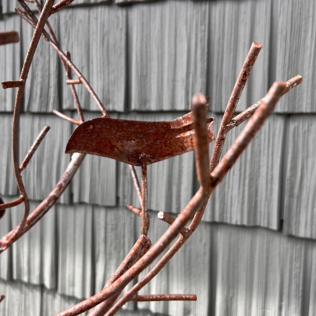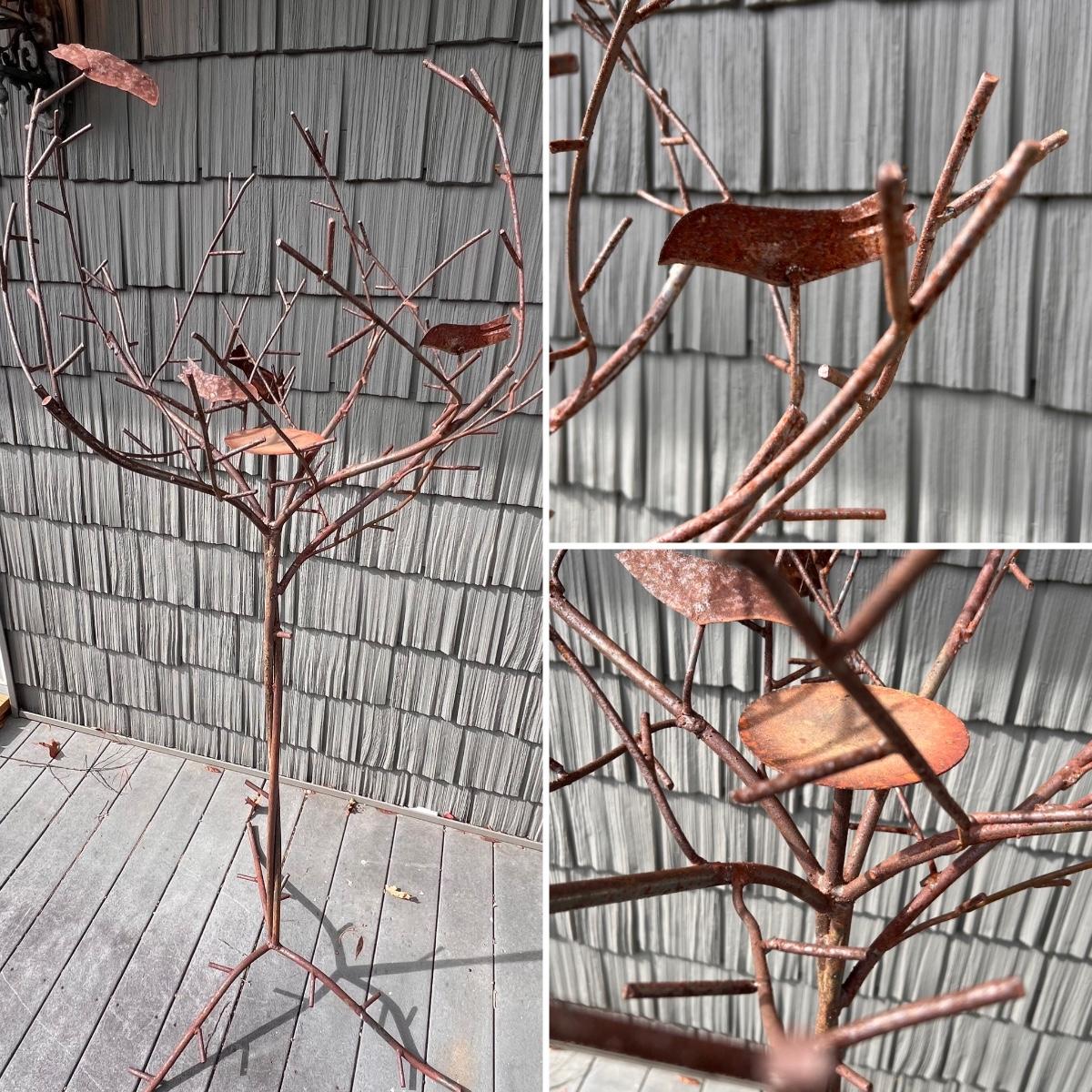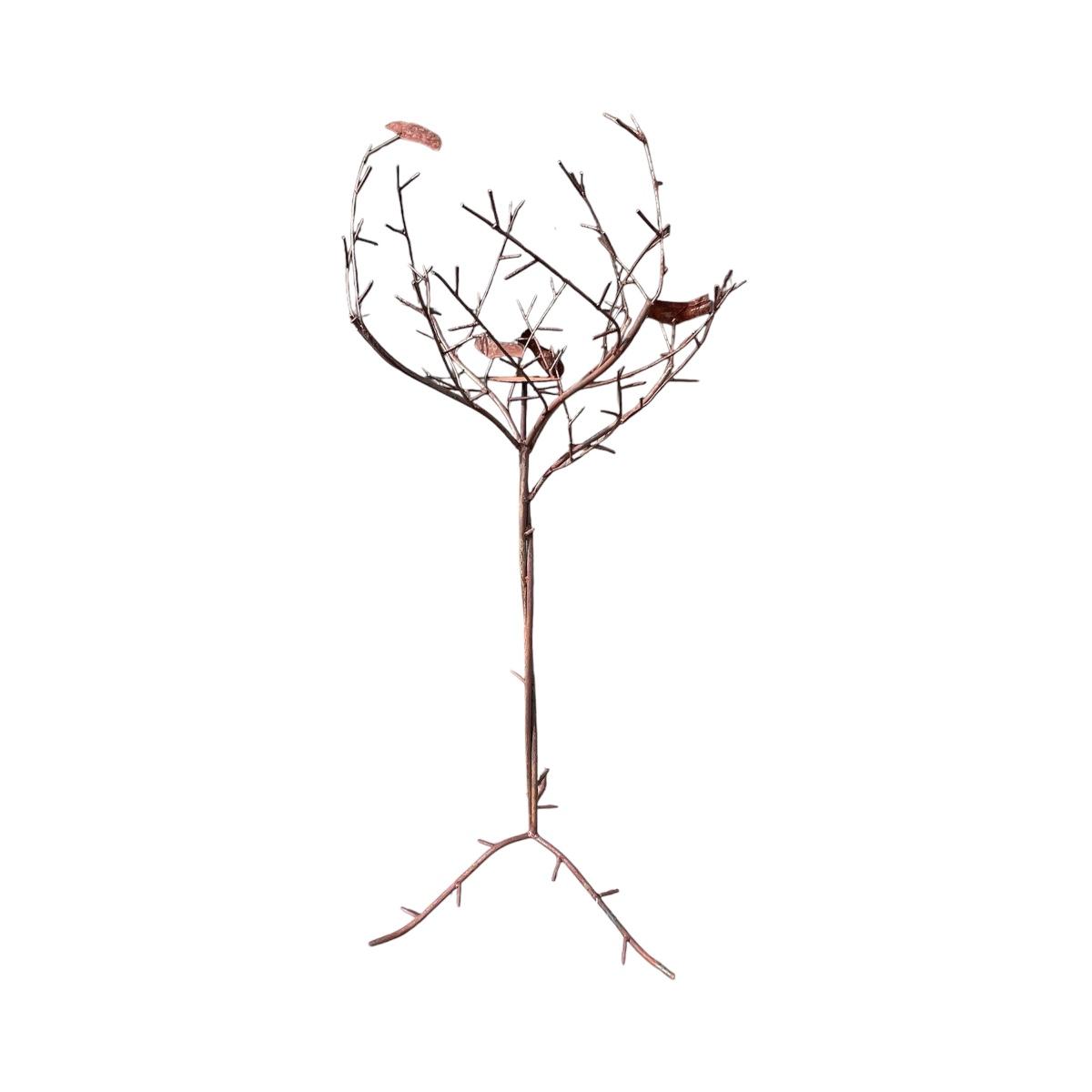 This lovely metal sculpture is shaped like a tree complete with birds in its branches. It has a rust-colored patina.