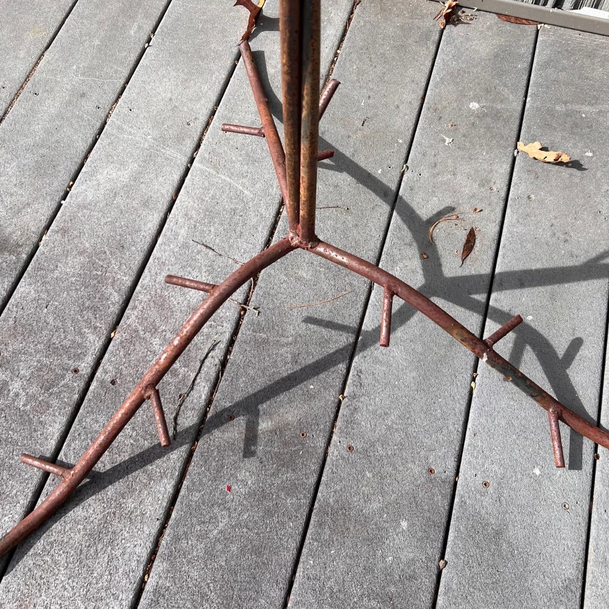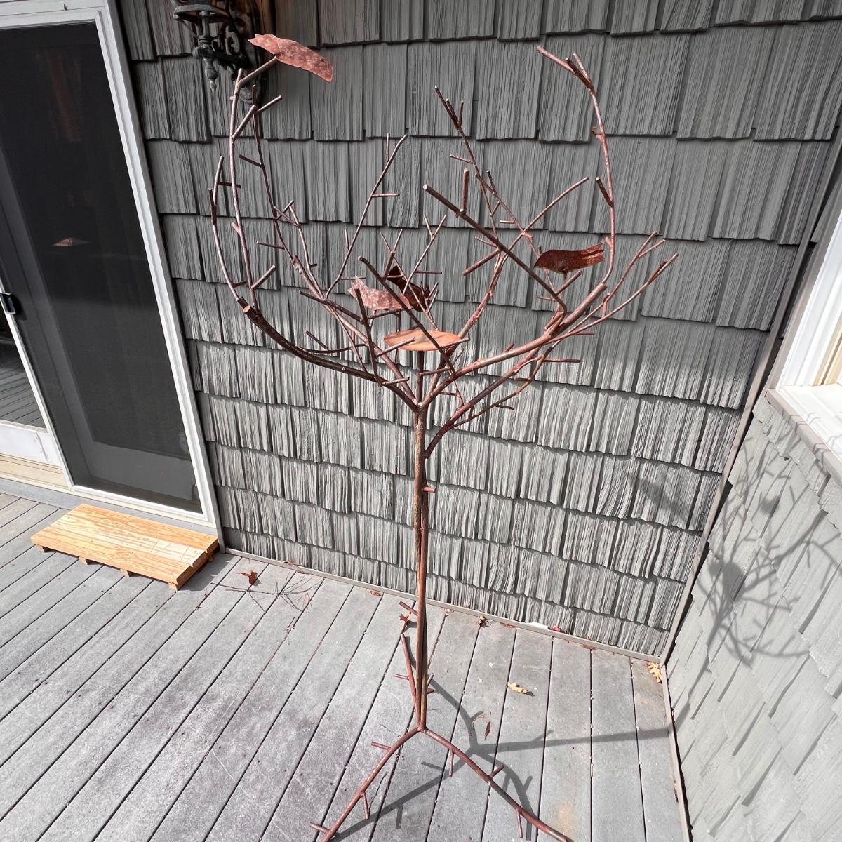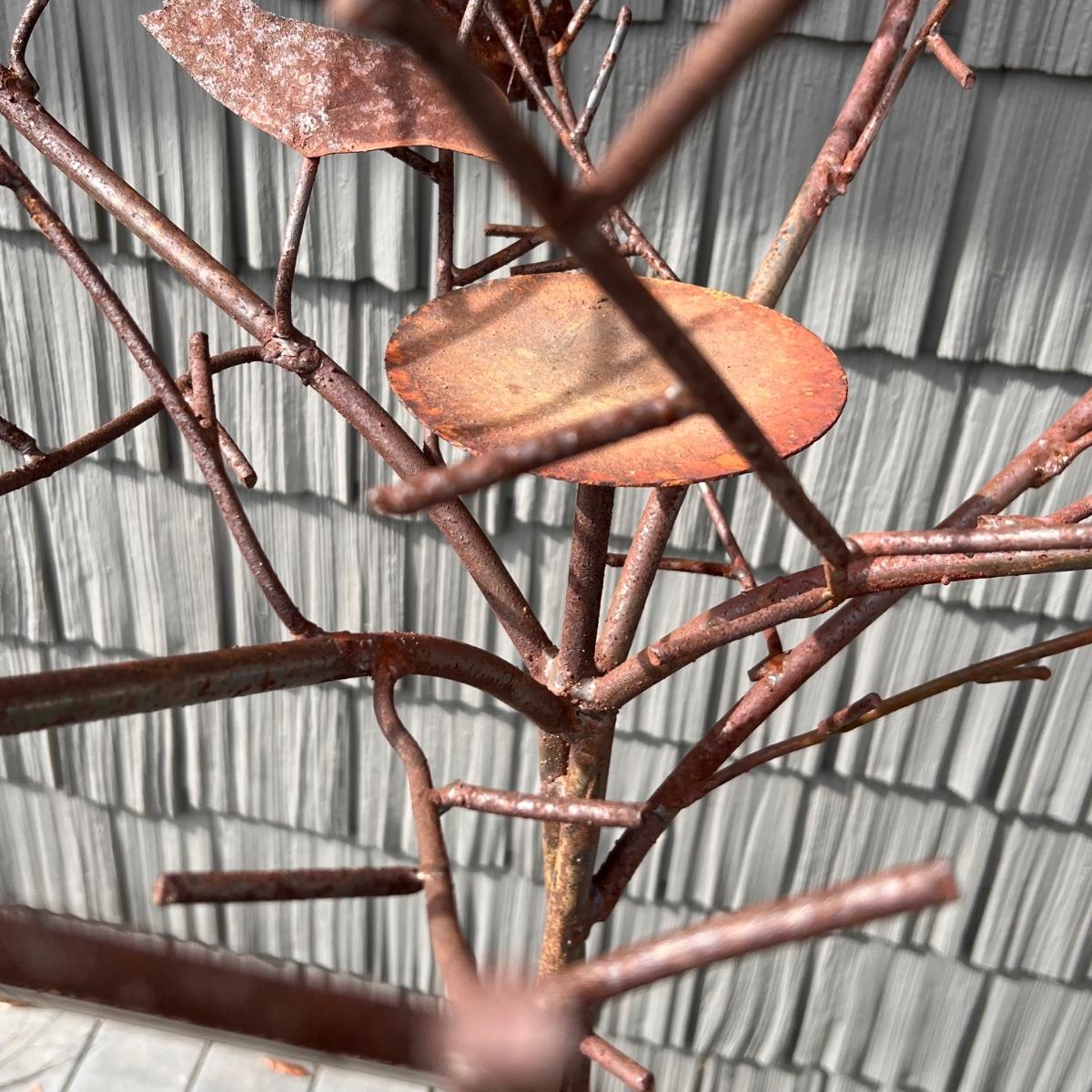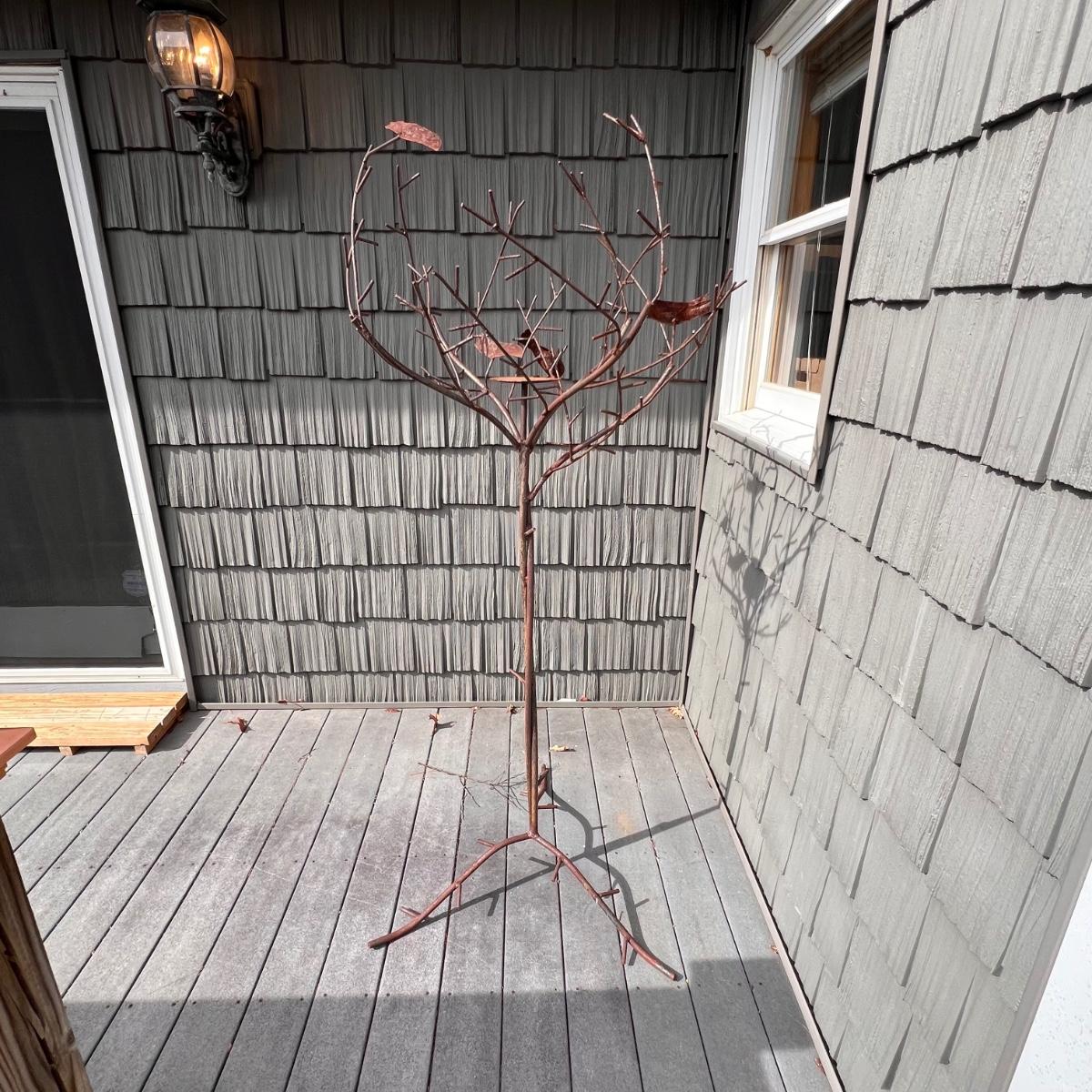 This lovely metal sculpture is shaped like a tree complete with birds in its branches. It has a rust-colored patina.
