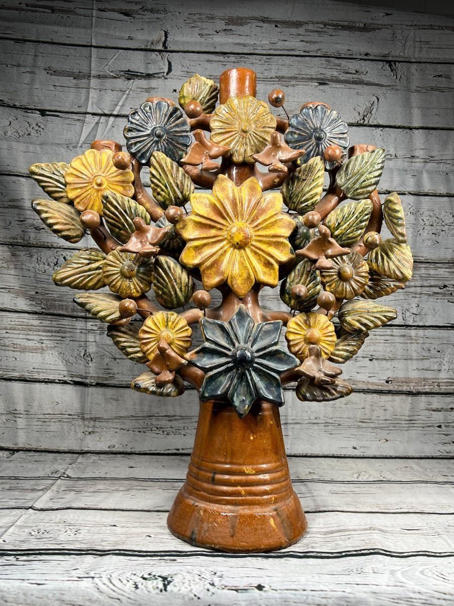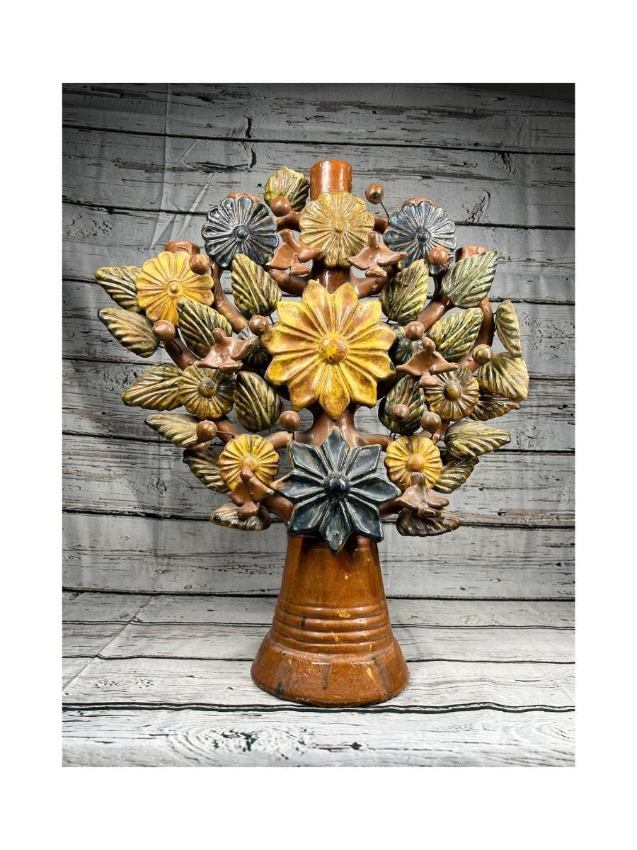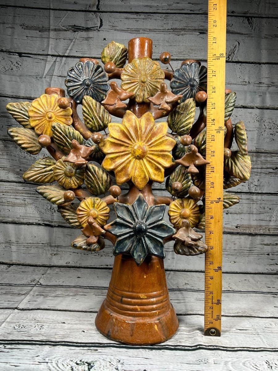 Large Mexican Folk Art Floral Pottery Tree of Life Statue Candle Holder Candelabra