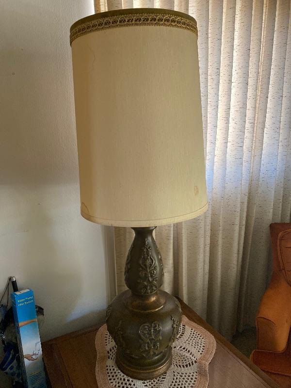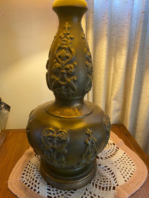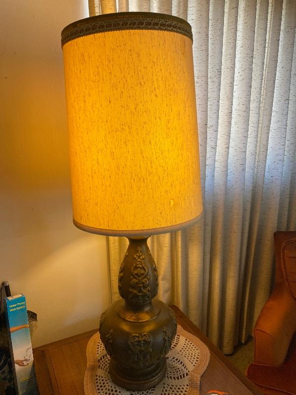 Large Mid Century Table Lamp. Stands about 46” with shade. Pottery ceramic base. Works. No chips in lamp. A couple spots on shade.