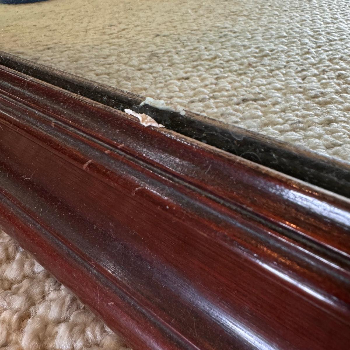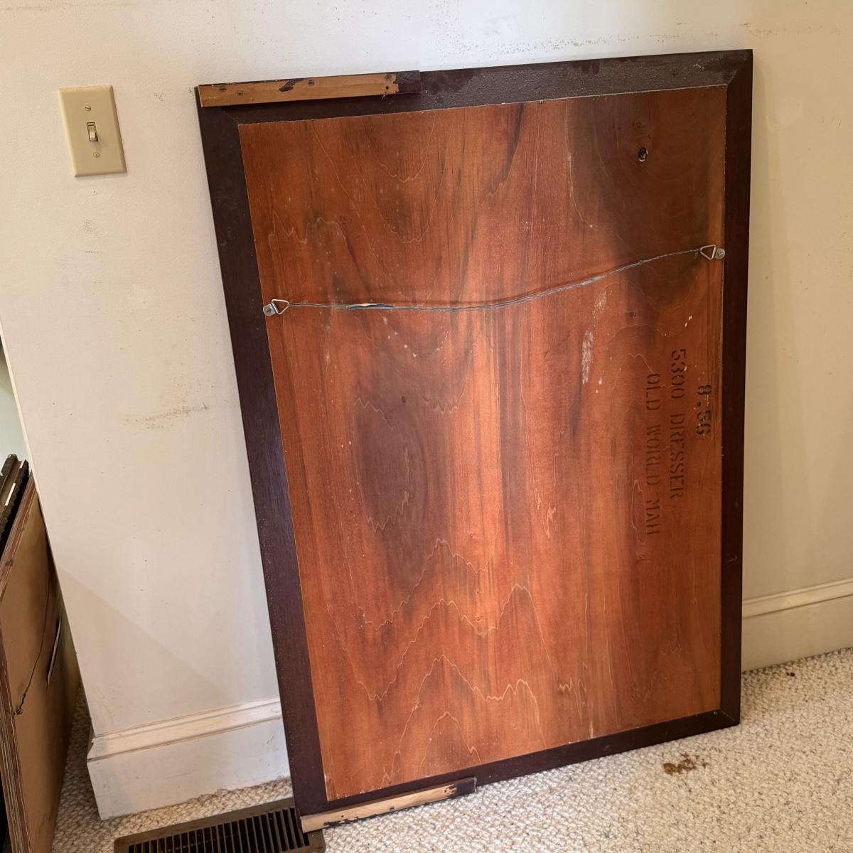 This lot includes one large mirror that measures 33.5” x 47”H. It is framed in a sturdy, wooden frame. There are a few scratch marks on the frame - see pictures included. Local pickup only.