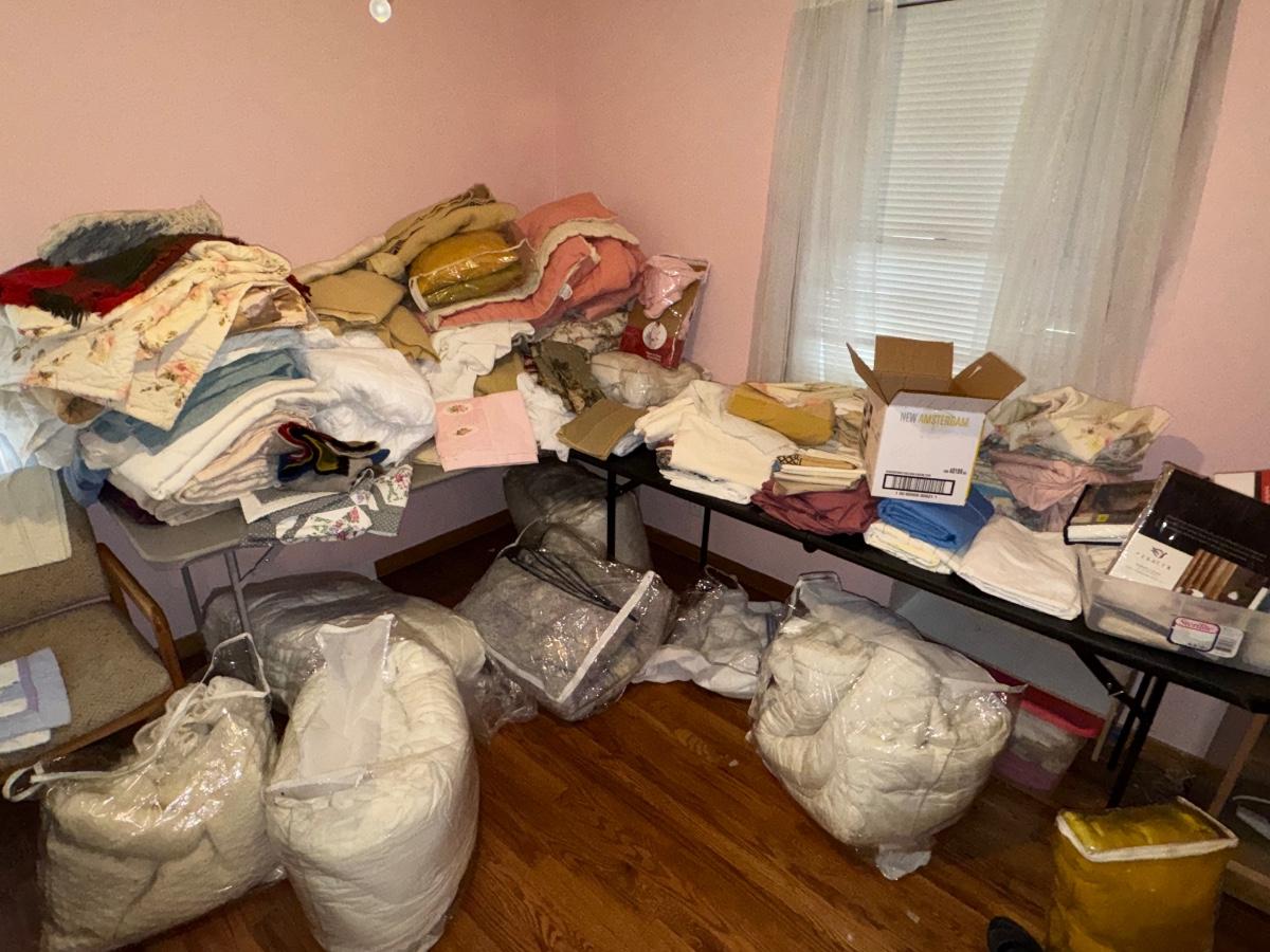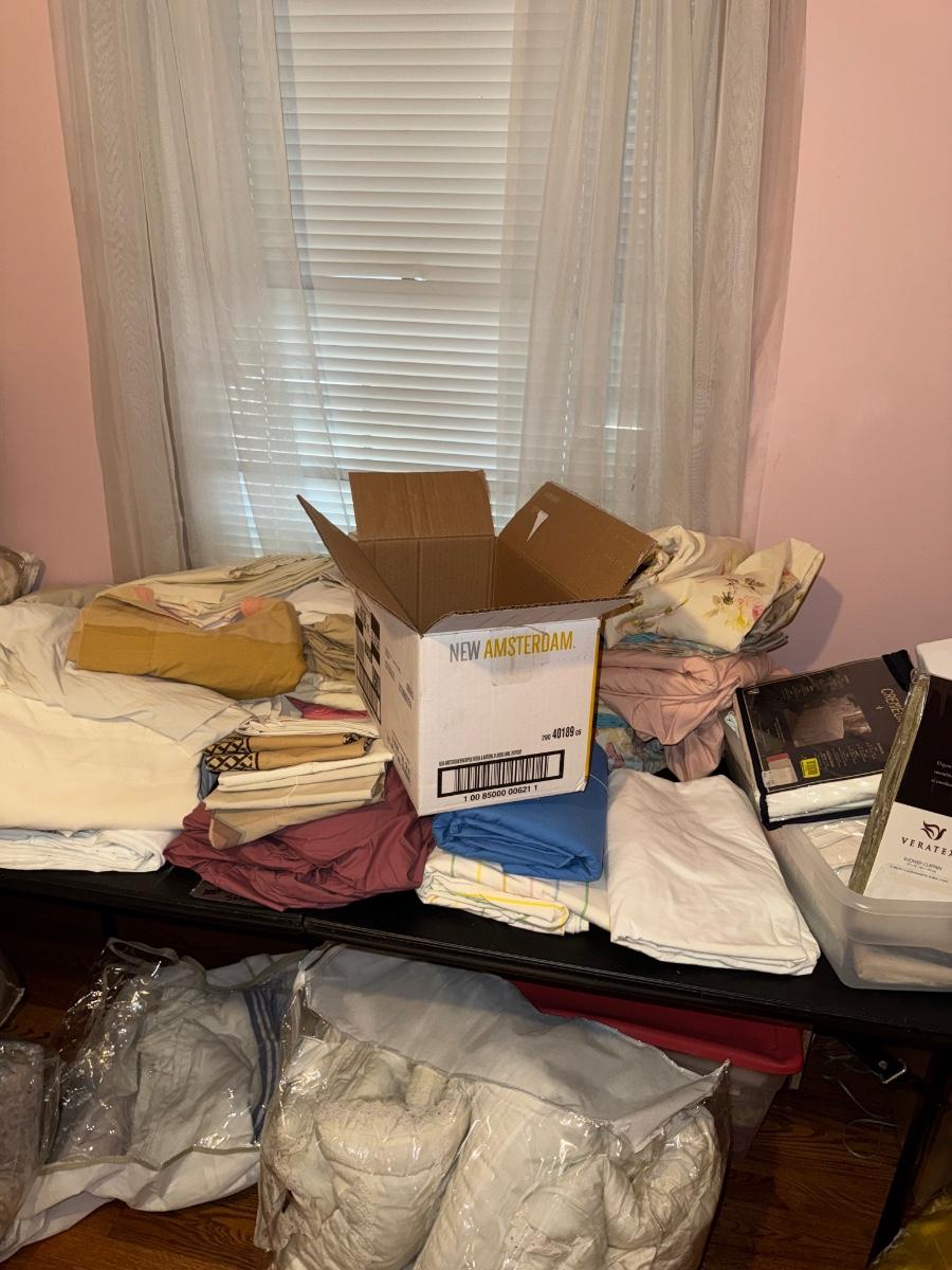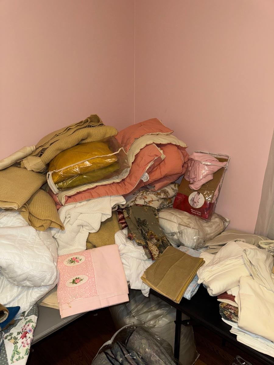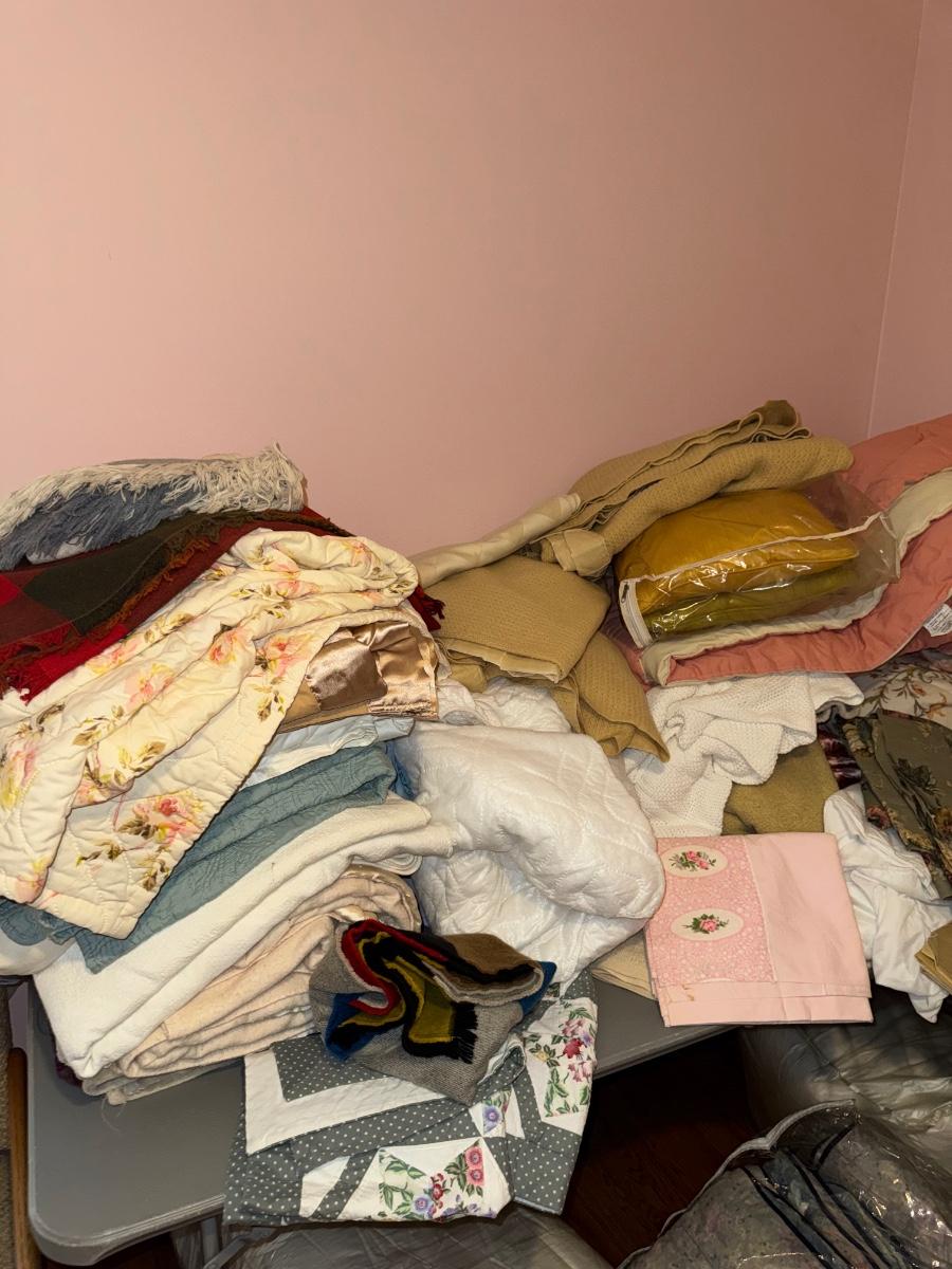 LARGE MISCELLANEOUS BEDDING, SHEET, LINEN LOT - BLACK TABLES NOT INCLUDED