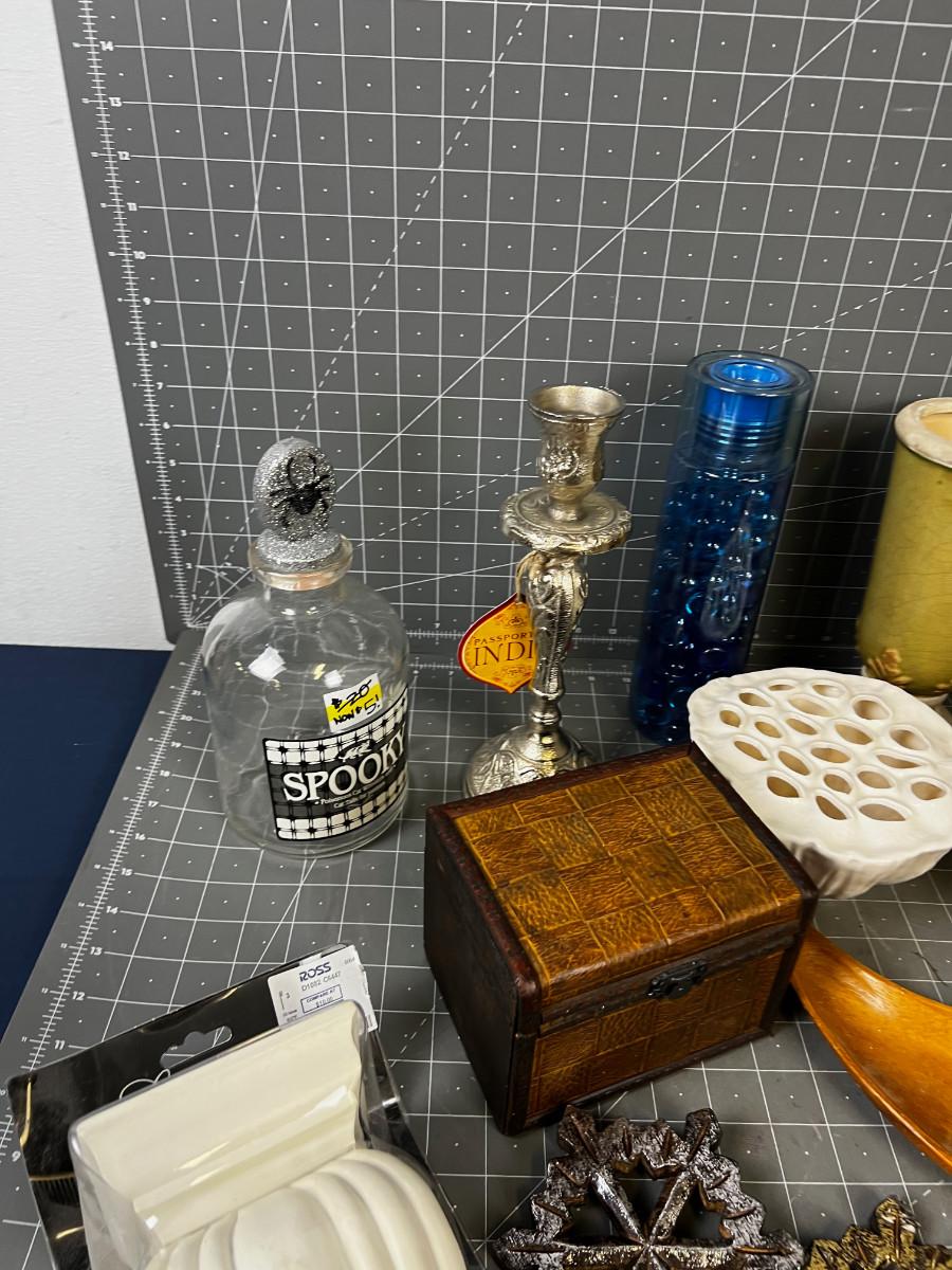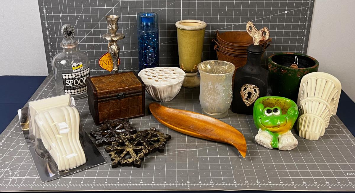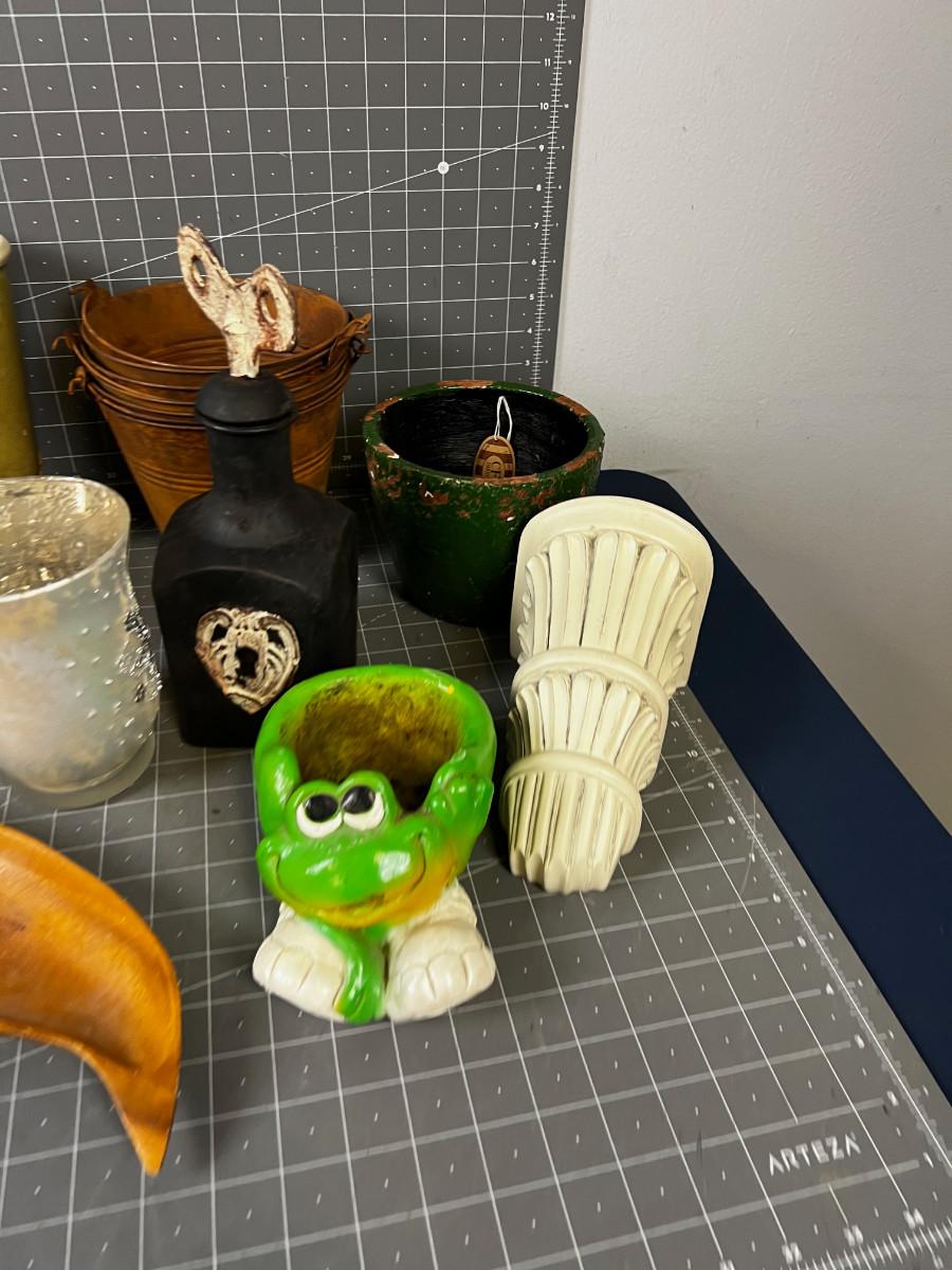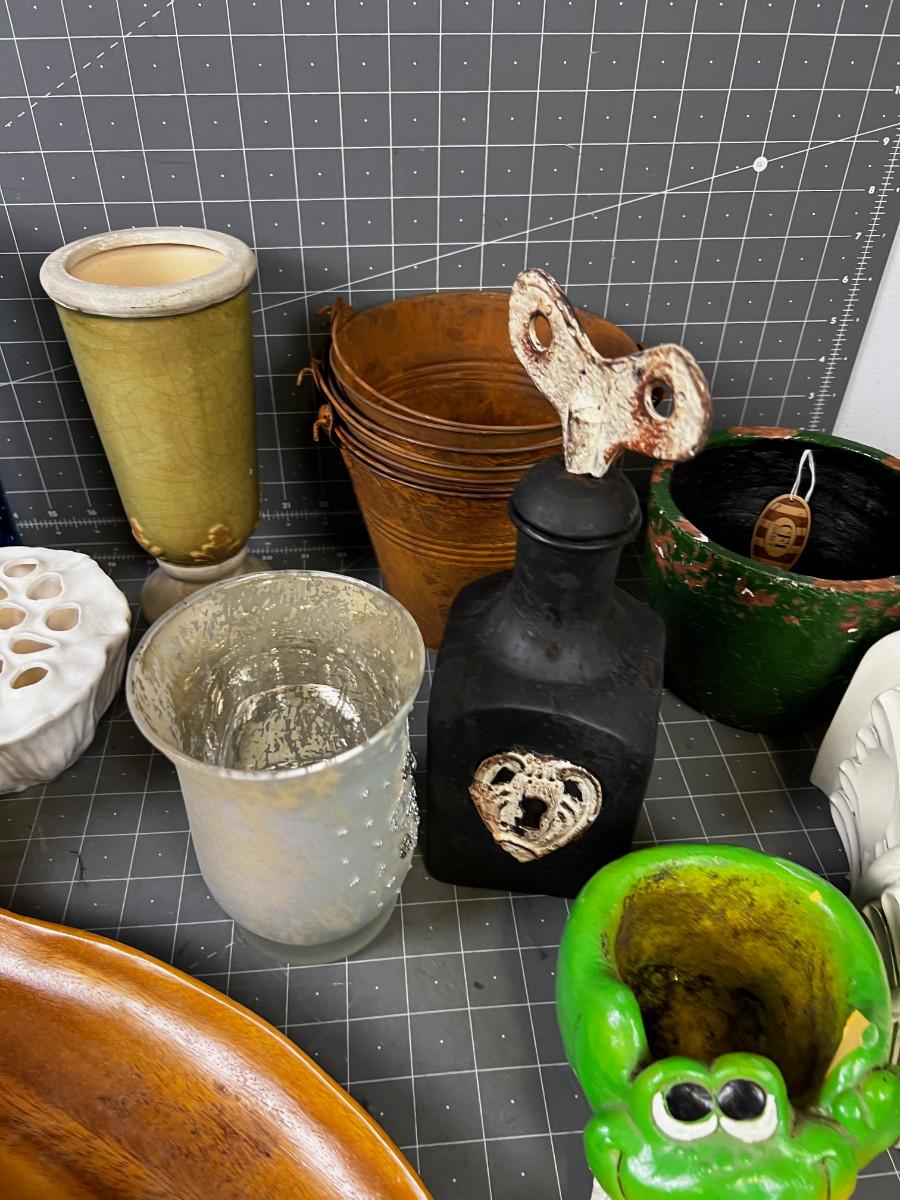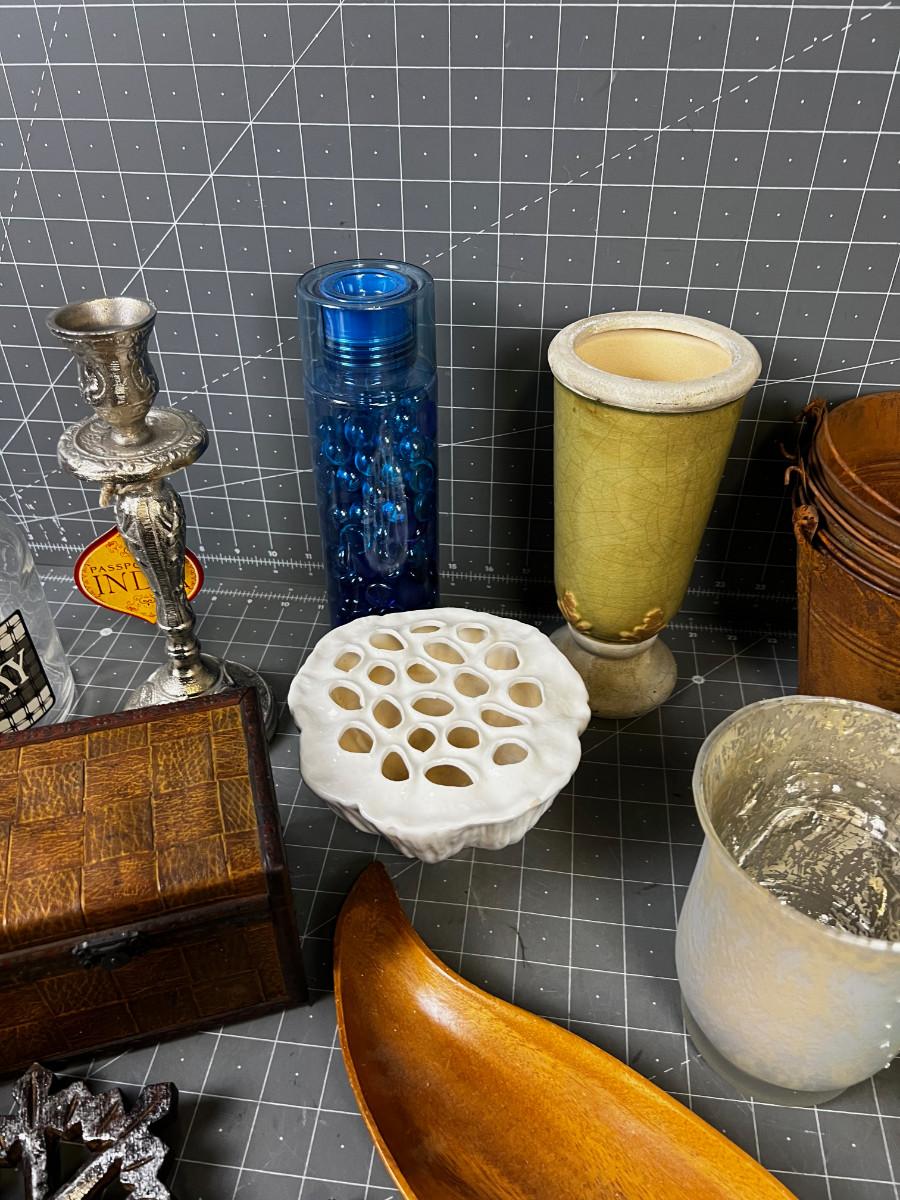 Large Mixed Lot of Decorative Items: Vases, Tin Buckets, Blue Glass Marbles