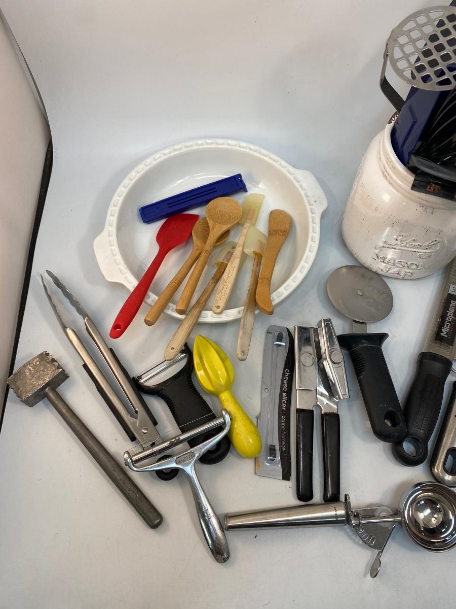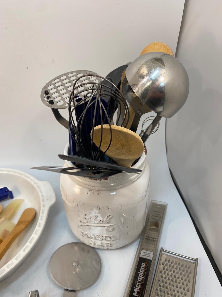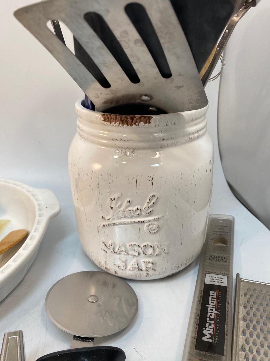 Large Mixed Lot of Kitchen Gadgets Cooking Utensils Pie Plate. Everything photo'd included. Pieces are in good condition. The mason jar caddy is ceramic not glass.