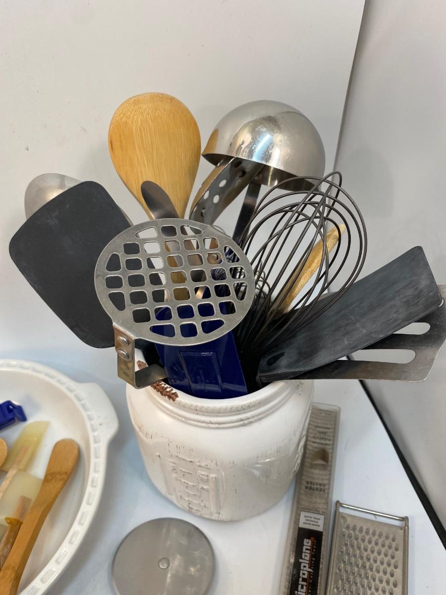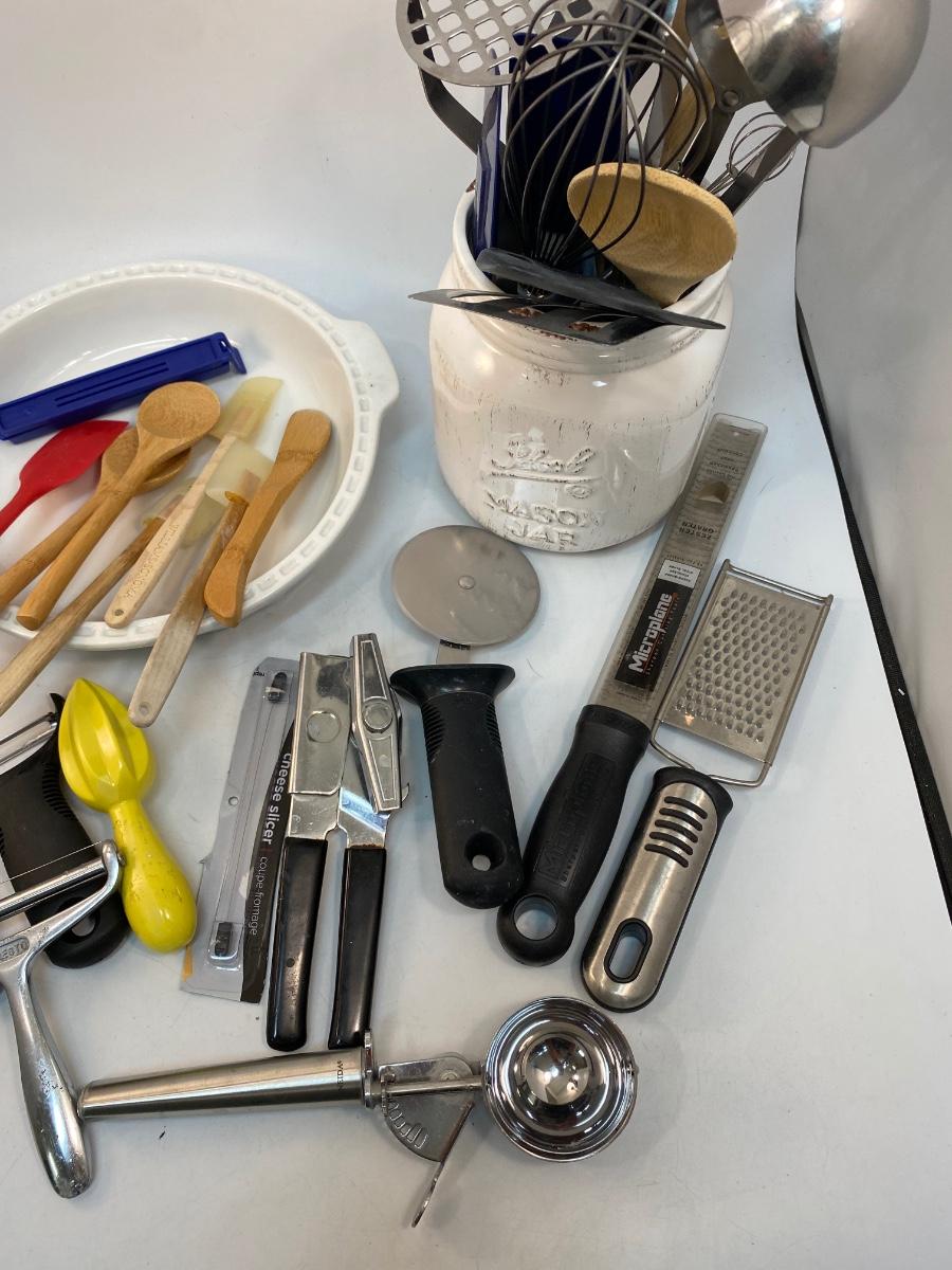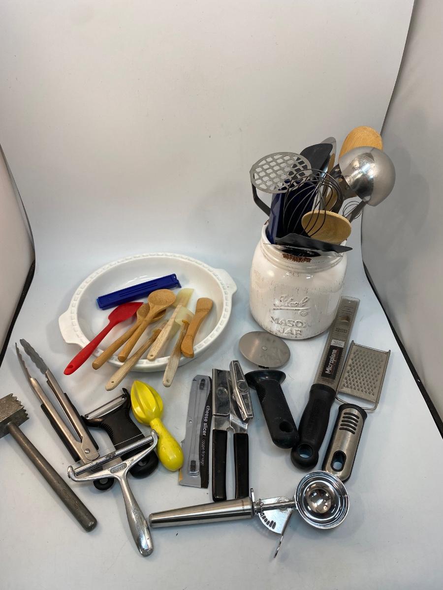Large Mixed Lot of Kitchen Gadgets Cooking Utensils Pie Plate. Everything photo'd included. Pieces are in good condition. The mason jar caddy is ceramic not glass.