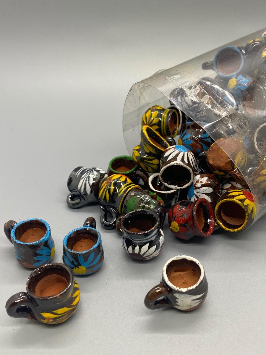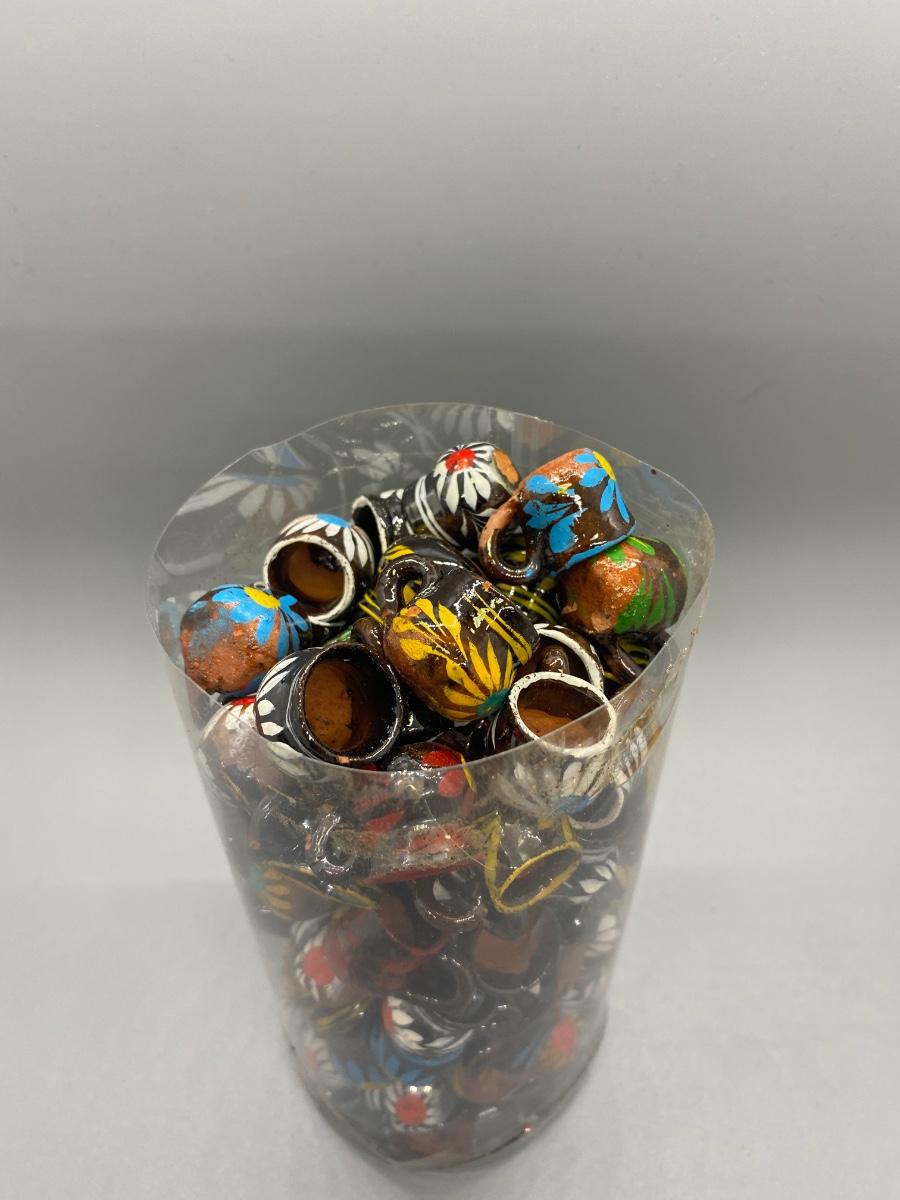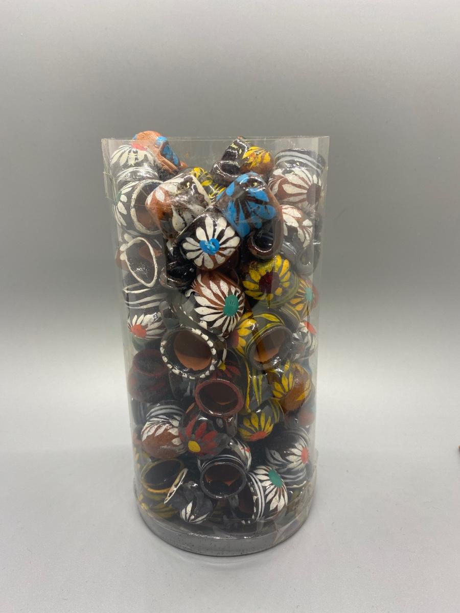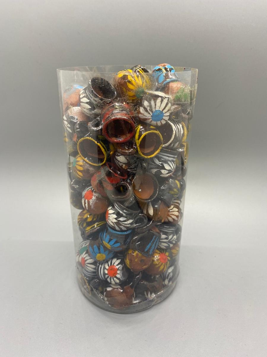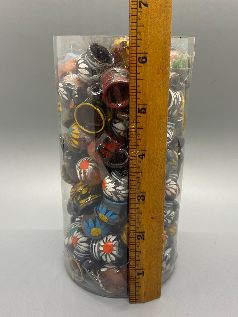 Large mixed lot of painted pottery miniature cups. Hand painted floral patterns in different colors. Just under 1" size. In a plastic tube that is about 7" tall. Tube is full to the top.