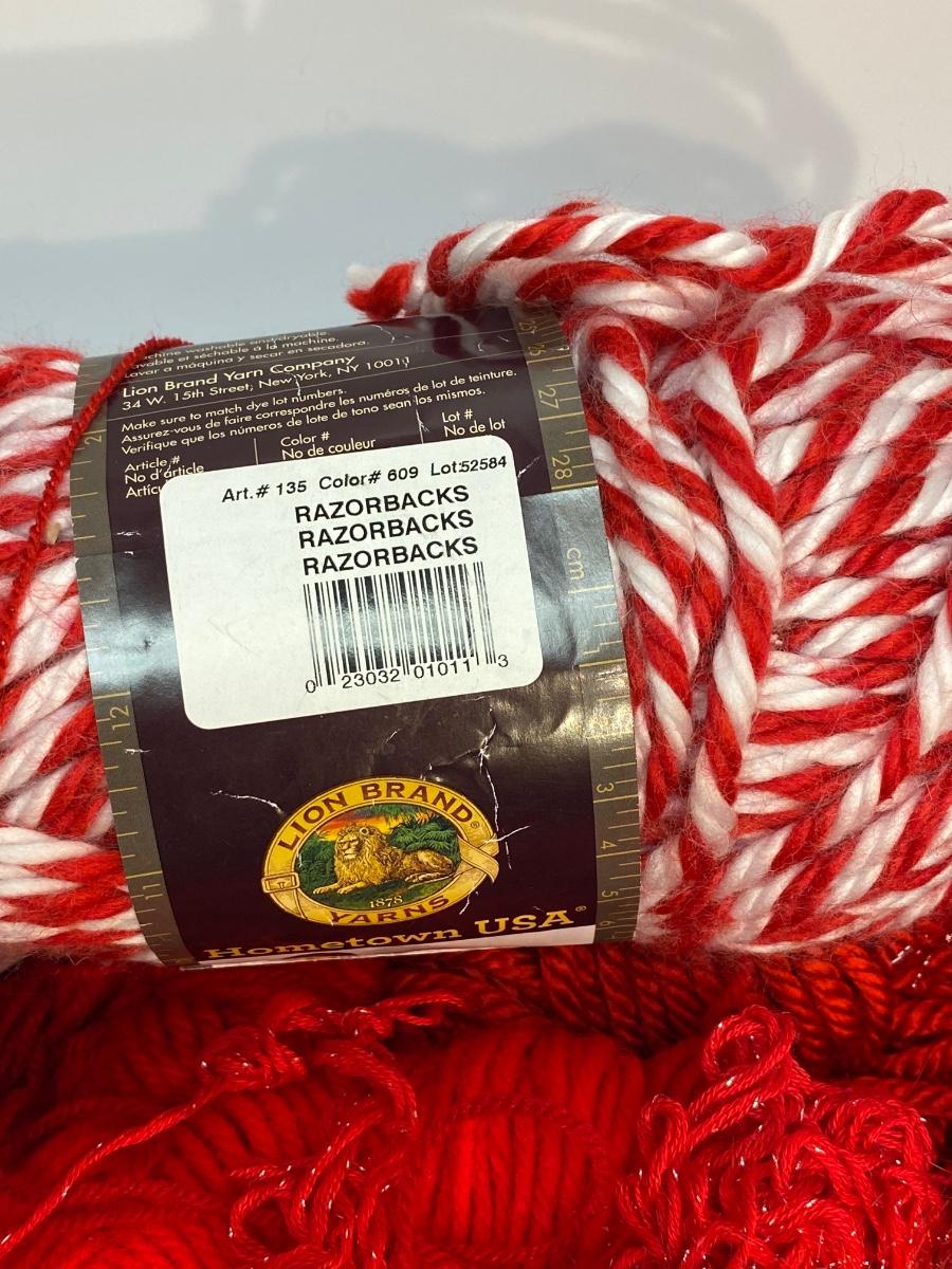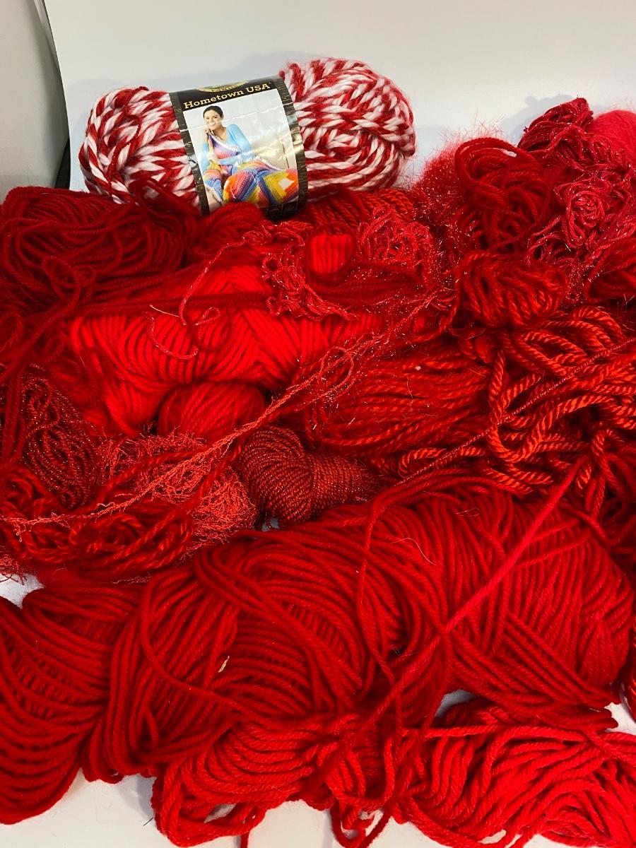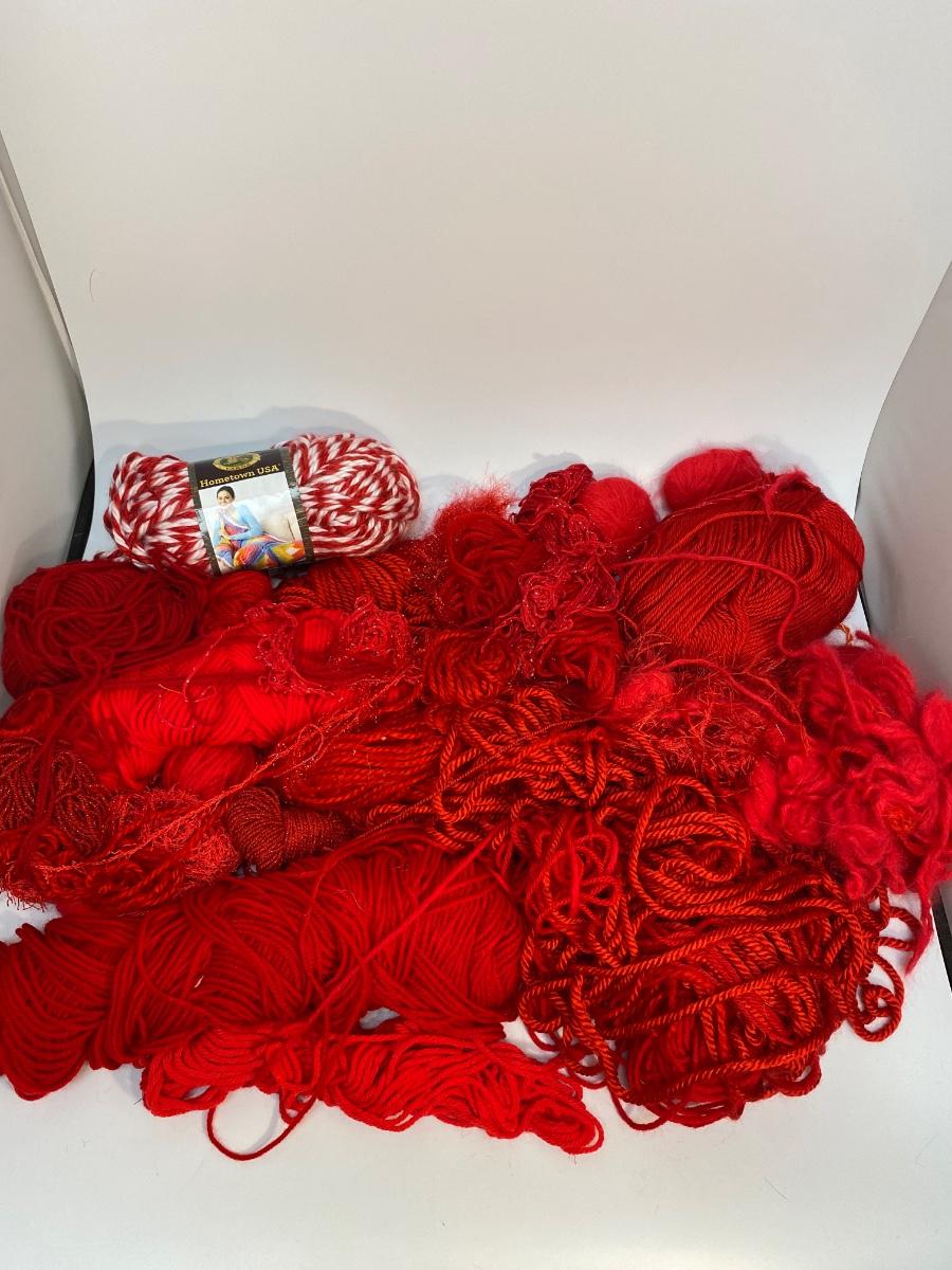 Mixed lot of red yarn. Different styles and lengths. One roll still has a paper label but not sure if the roll is complete.