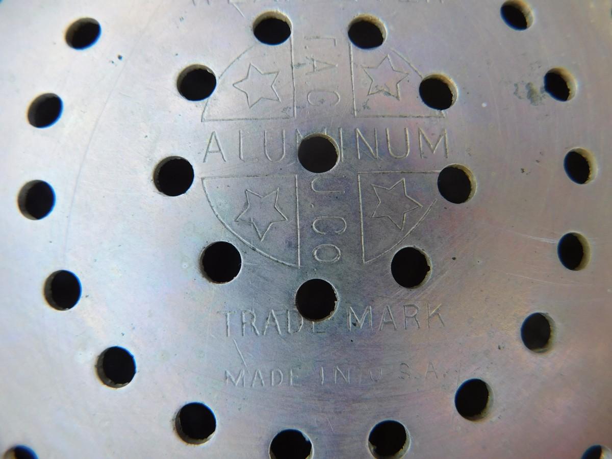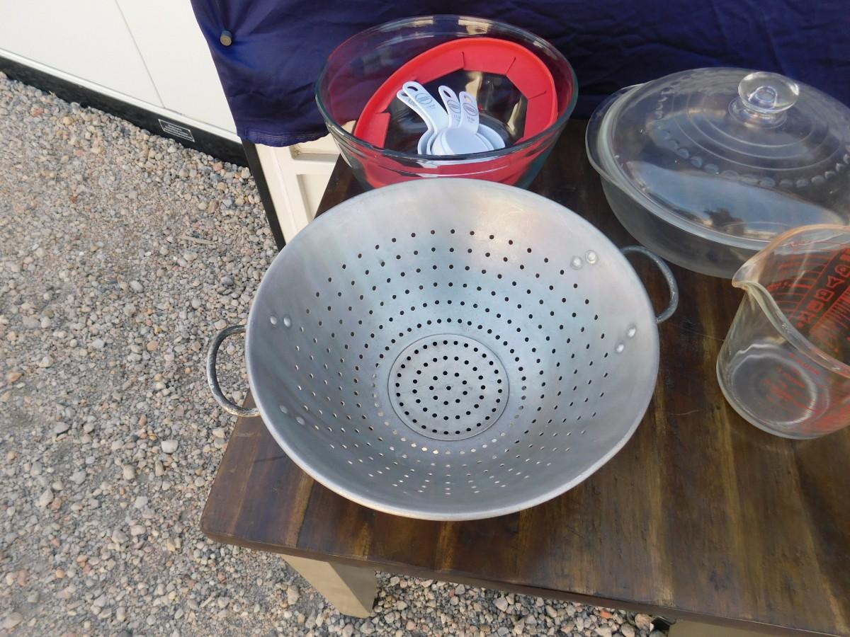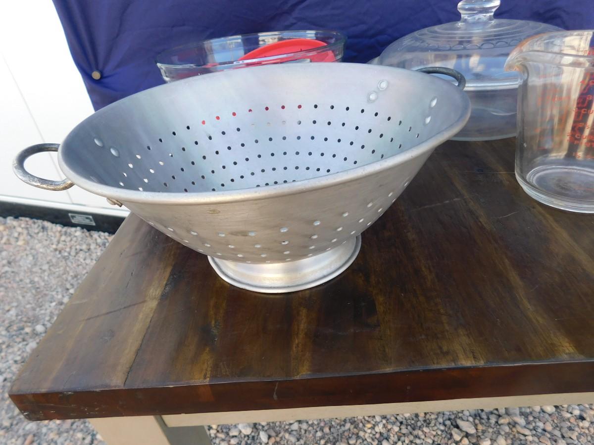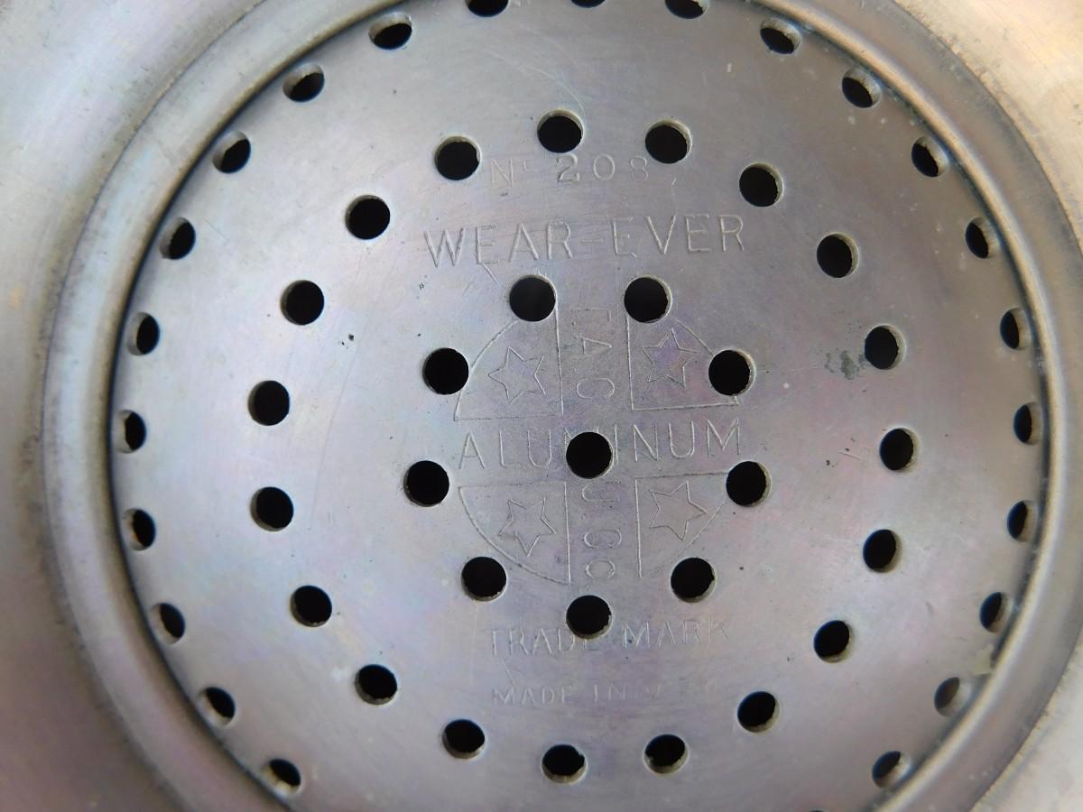 A NICE LARGE WEAR-EVER ALUMINUM STRAINER, THE MIXING BOWL HAS A CHIPPED EDGE BUT HAS BEEN SANDED SMOOTH FOR A NO CUT USE ˜ƒ