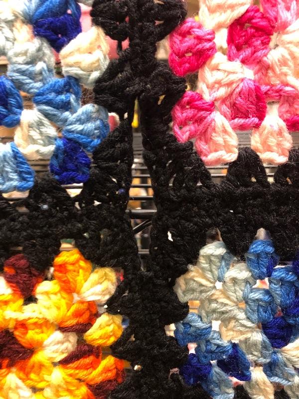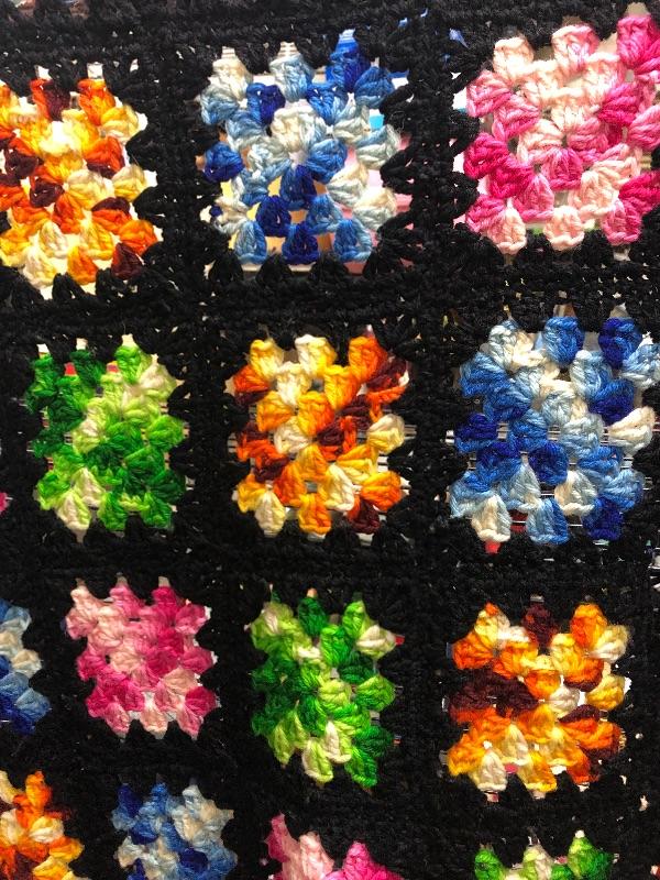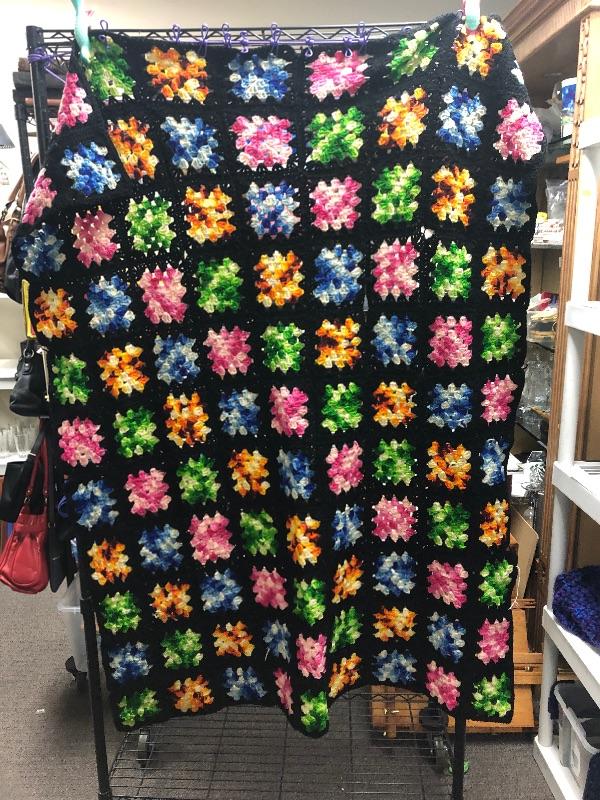 Large multicolored crochet blanket. About 5’x6’. Does have a spot where the squares need to be stitched together.