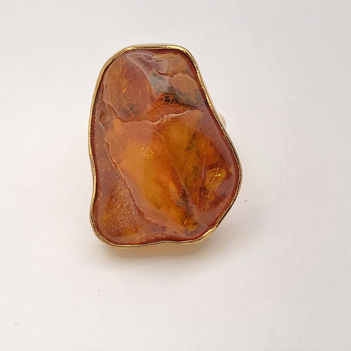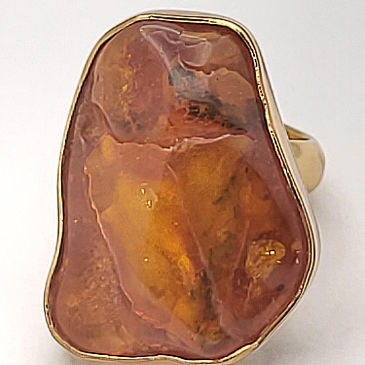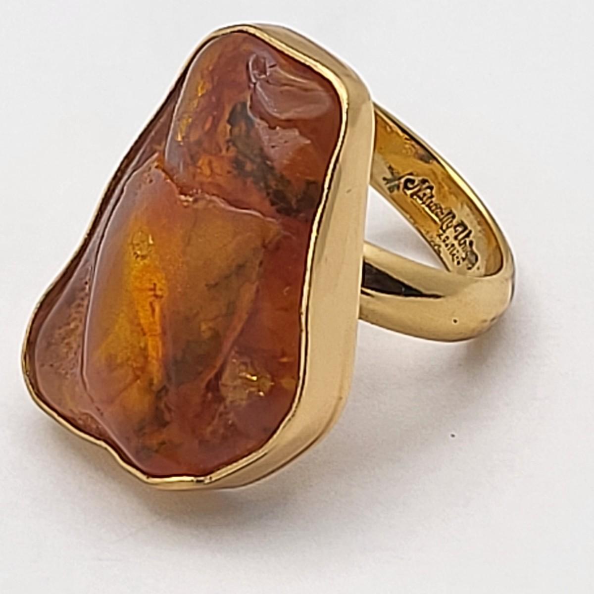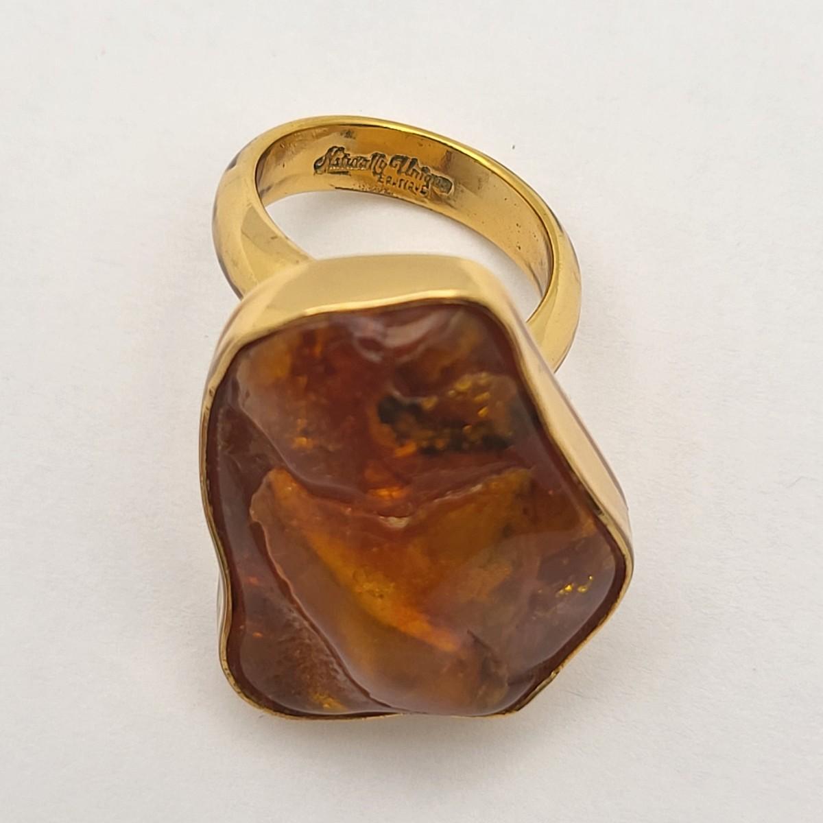 Stamped Naturally Unique. Freeform, modernist Amber ring. Gold tone band and setting. Size 8.