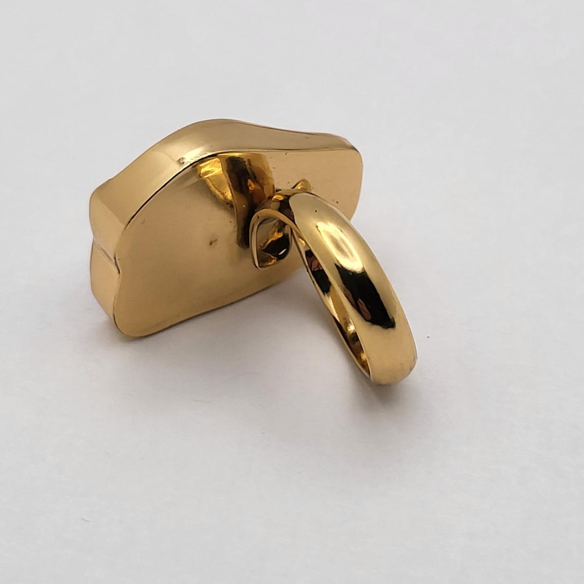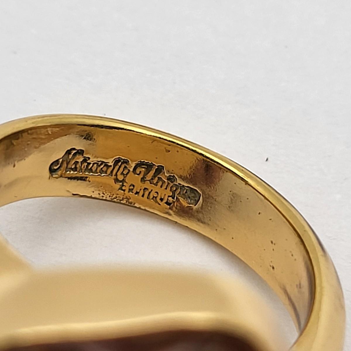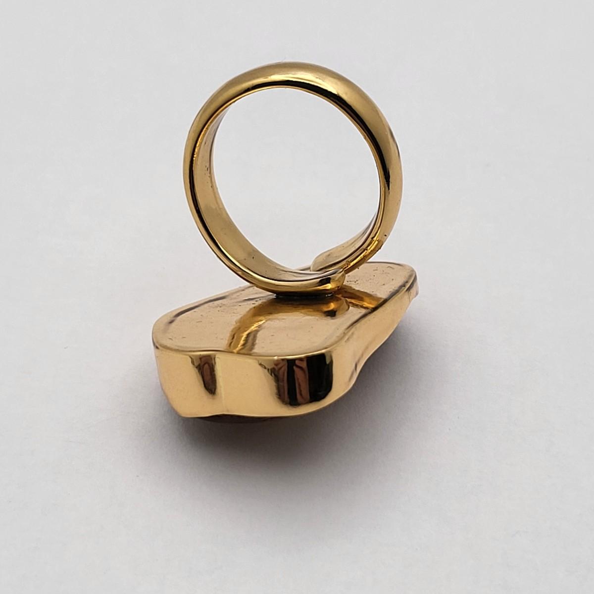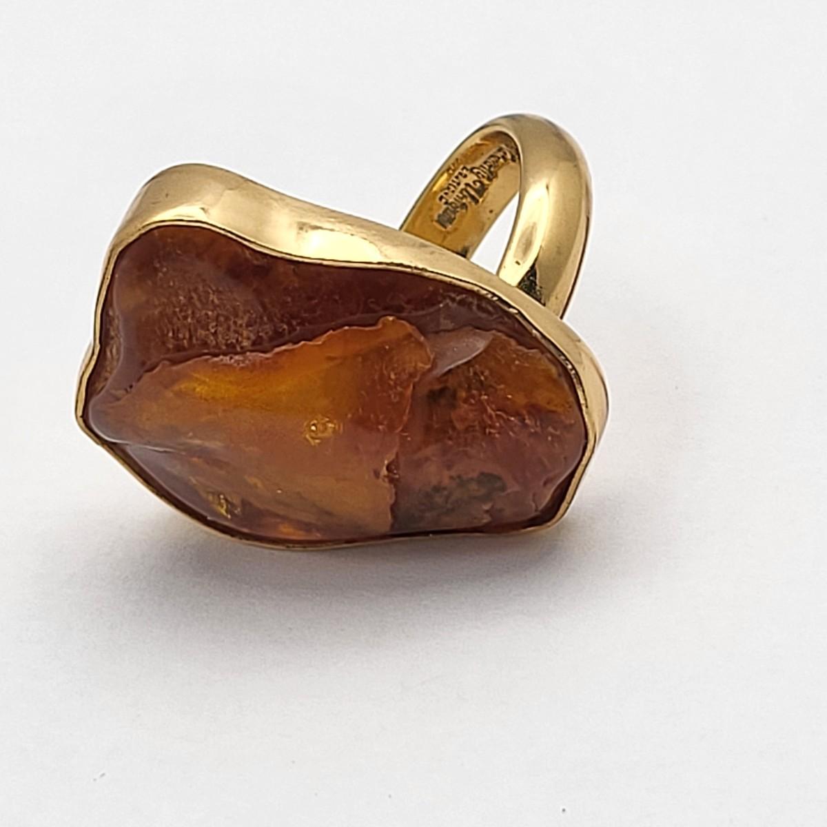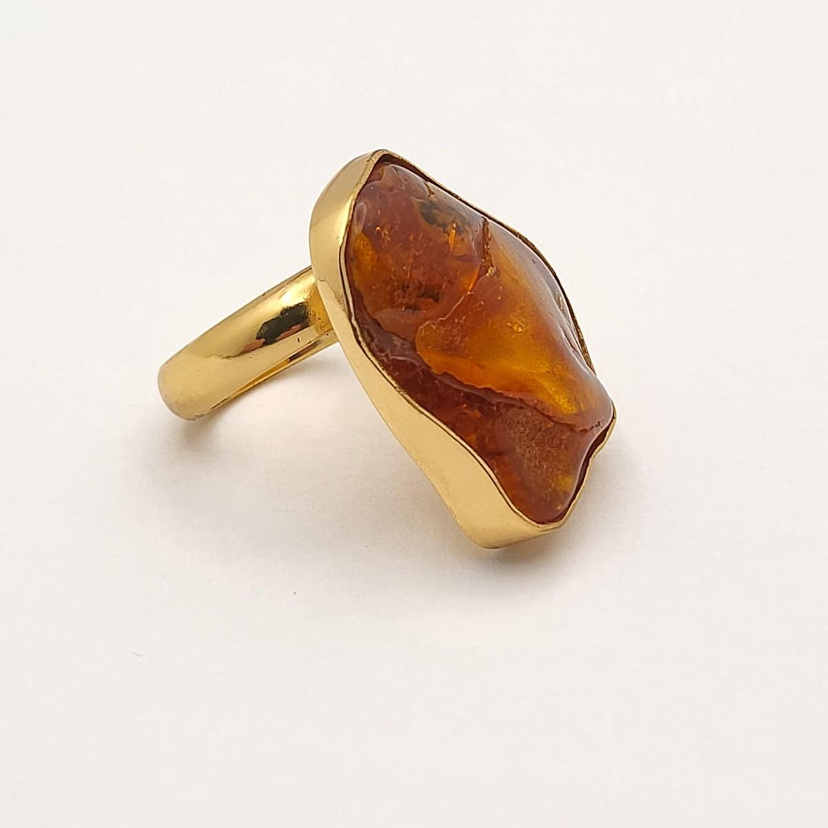 Stamped Naturally Unique. Freeform, modernist Amber ring. Gold tone band and setting. Size 8.