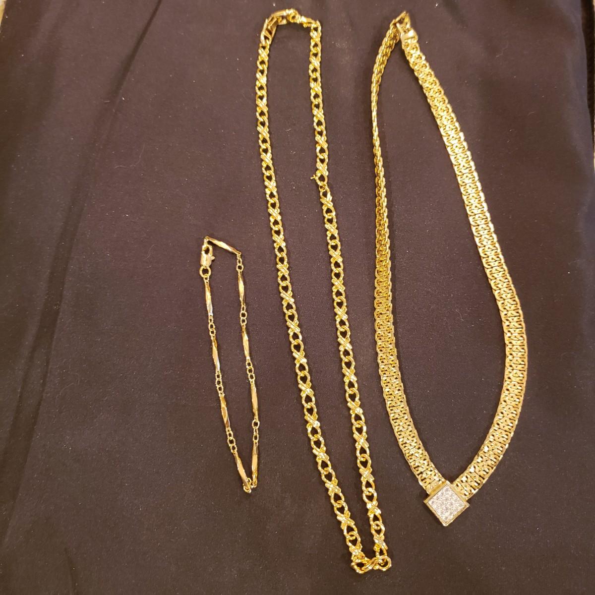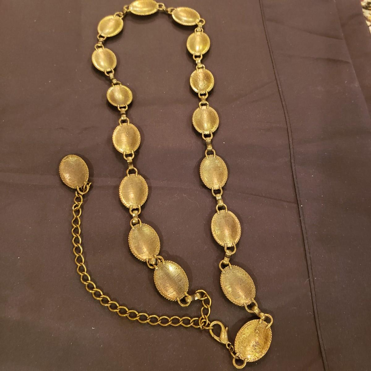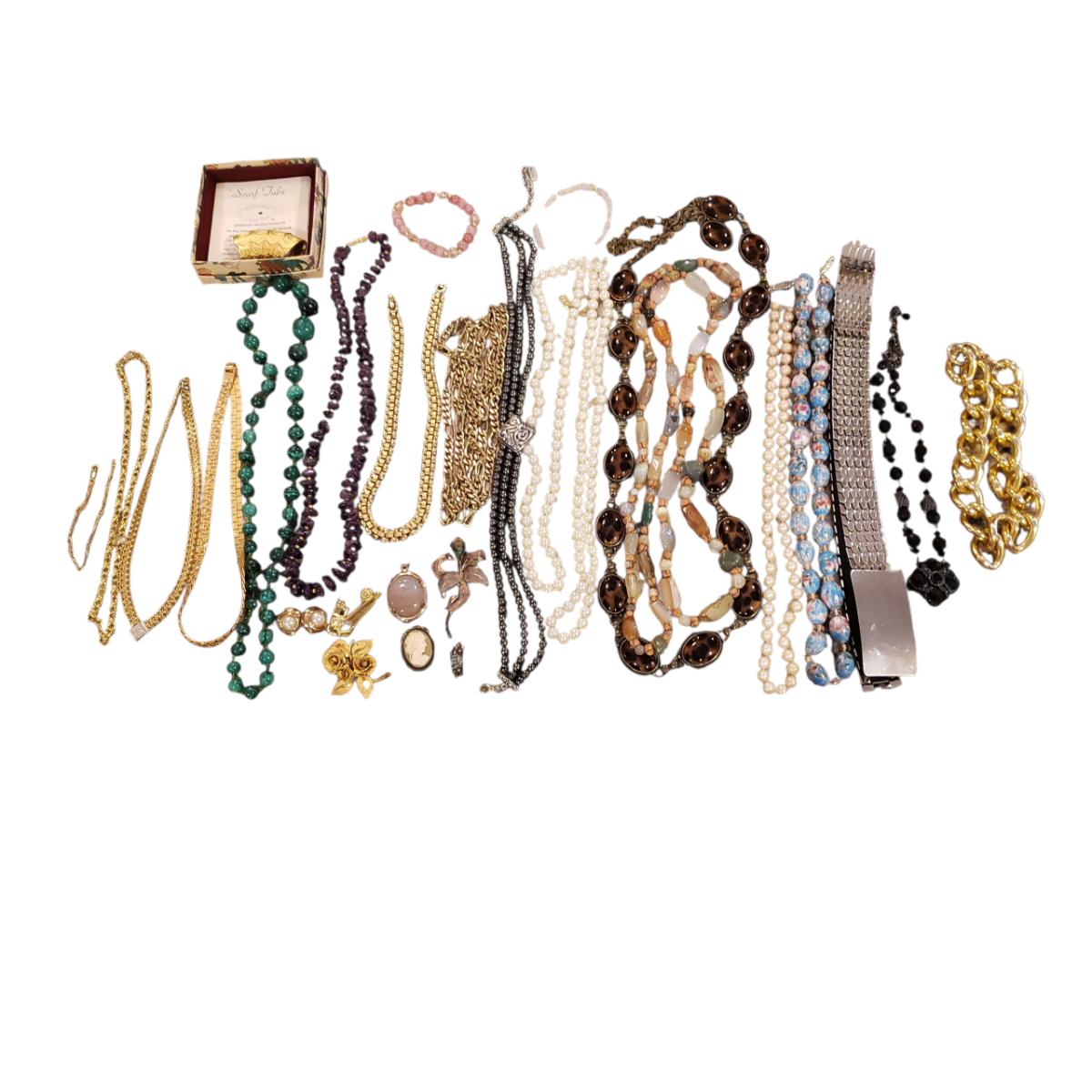 This large jewelry lot features gold like necklaces, pendants, a silver elastic belt, scarf cuff and a set of clip on earrings. See pictures for details. All sales are final. No returns or refunds. Please bid accordingly.
