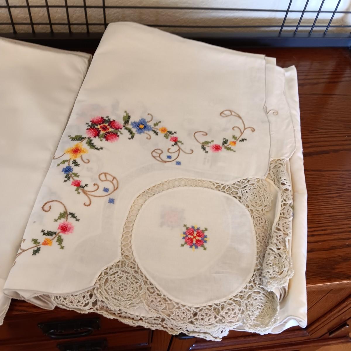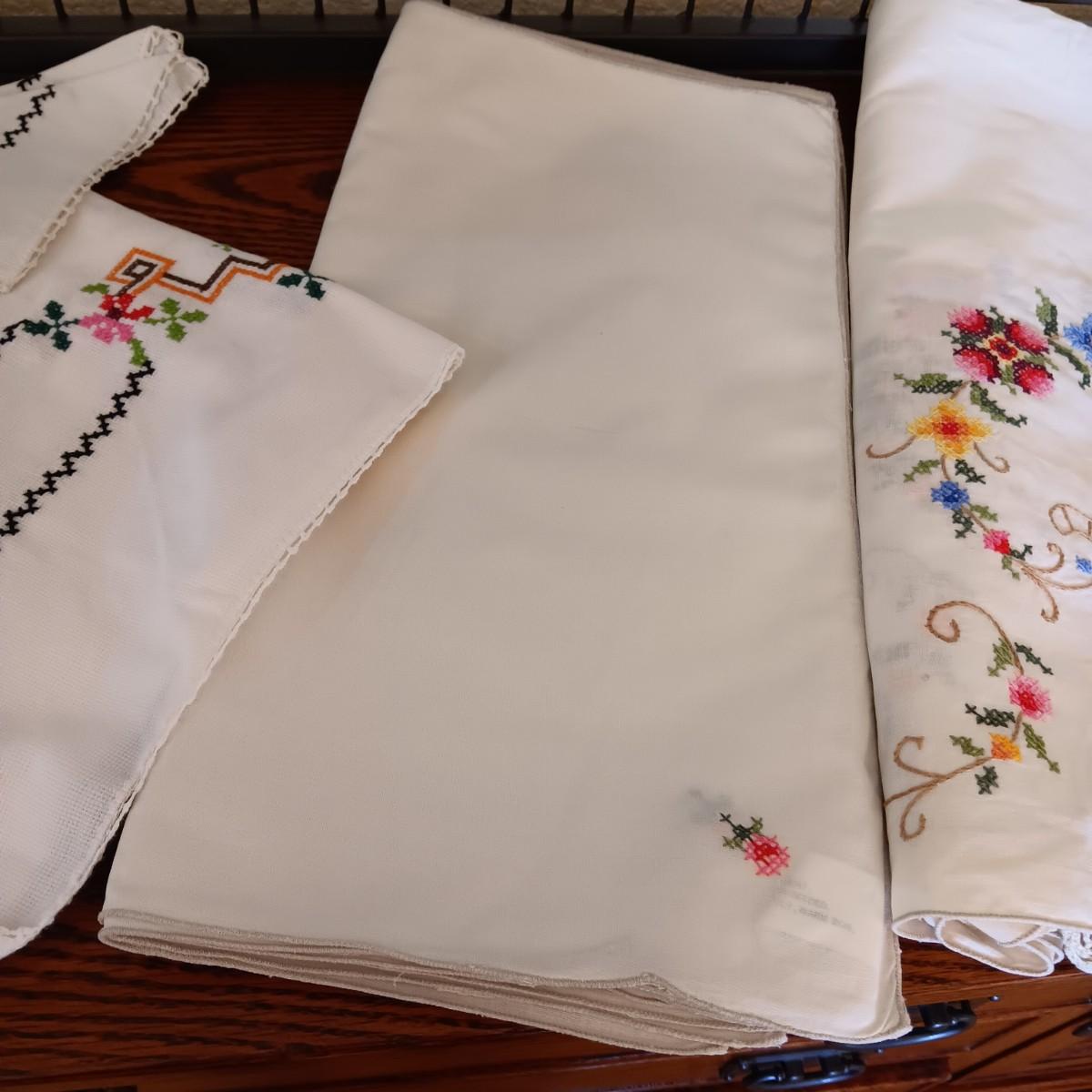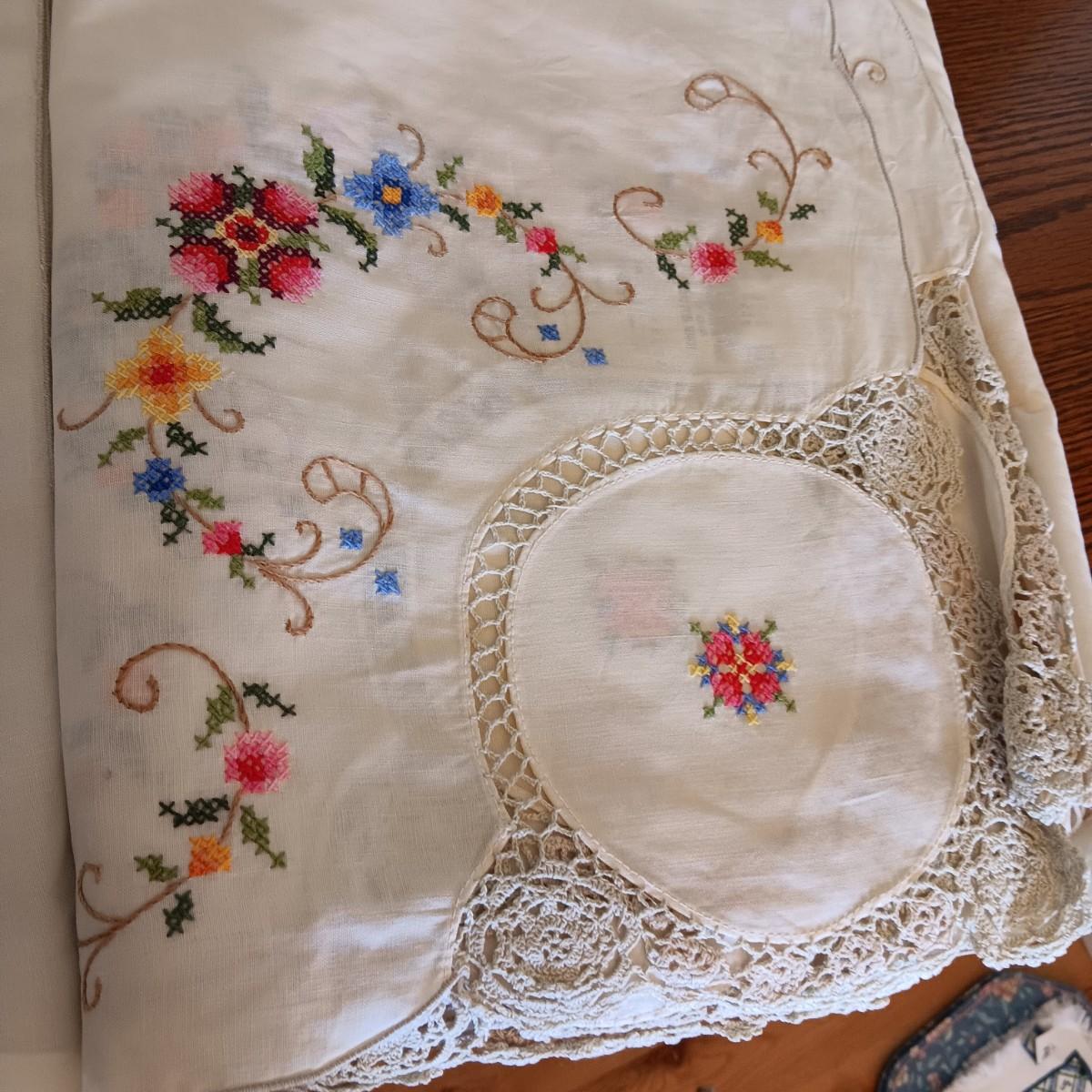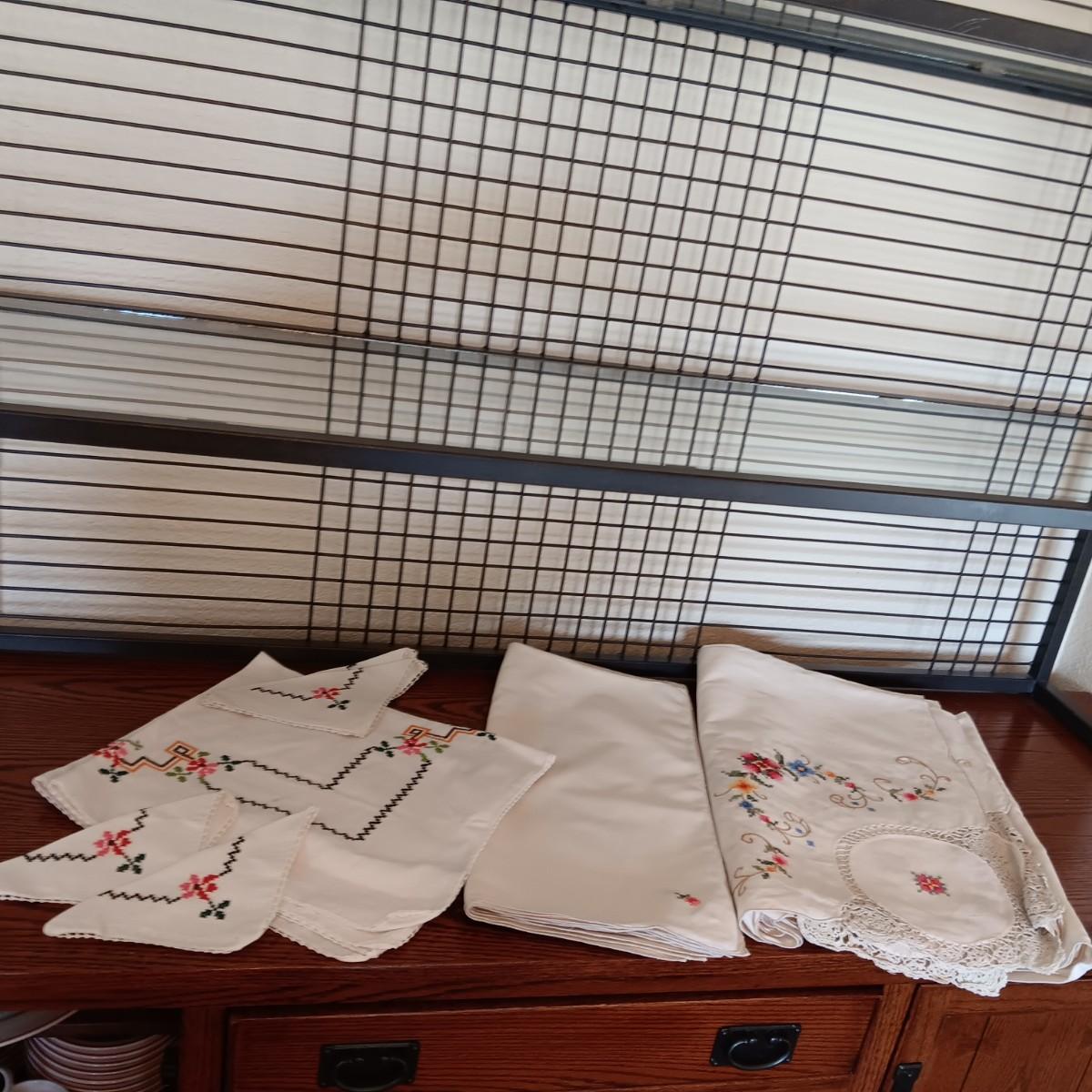 LARGE NEEDLEPOINT TABLECLOTH W/12 NAPKINS PLUS CARD TABLE SIZE TABLECLOTH