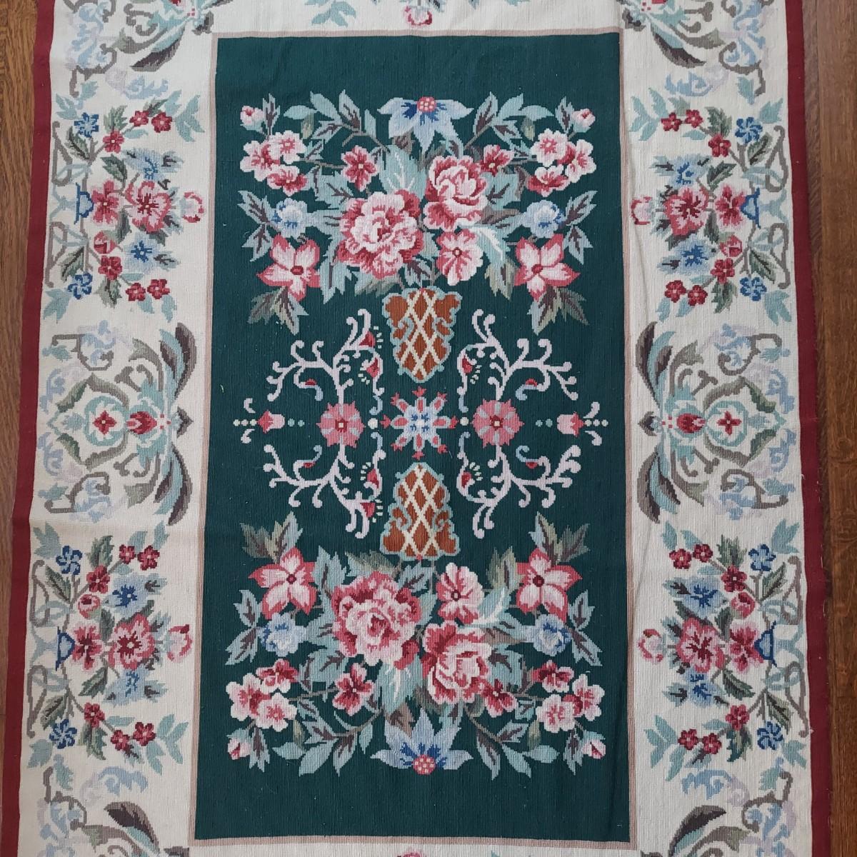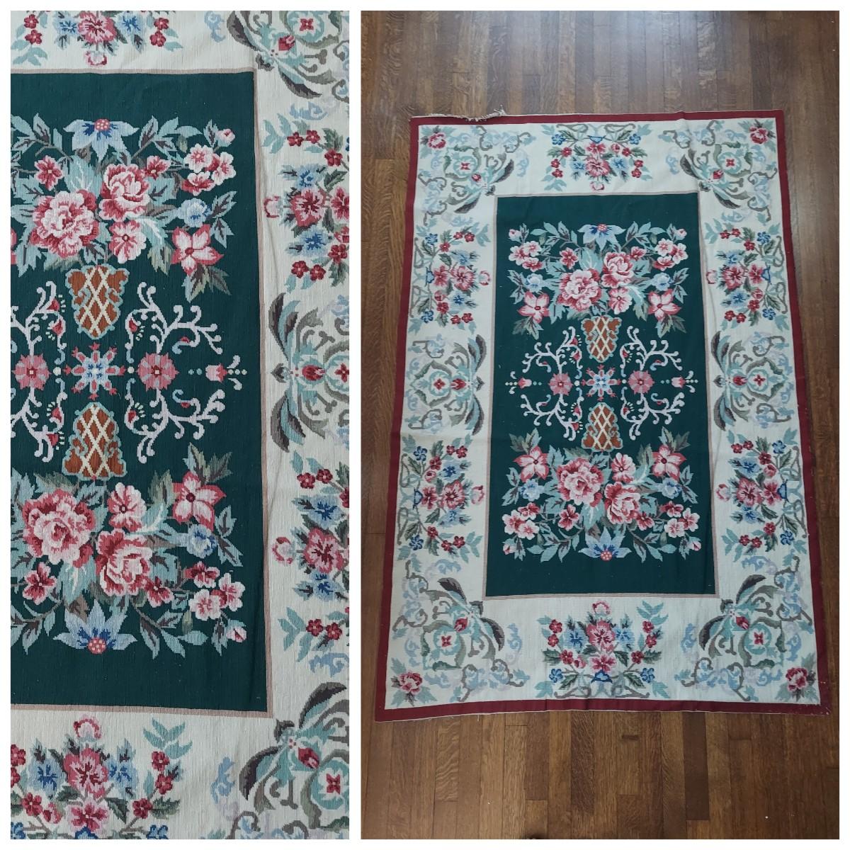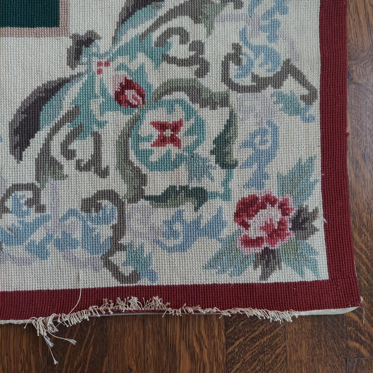 Large needlepointed tapestry with hand finished backing. Piece measures 47” x 71"H. Has a water spot on the back and some areas with condition issues on the front. Please see photos for details.