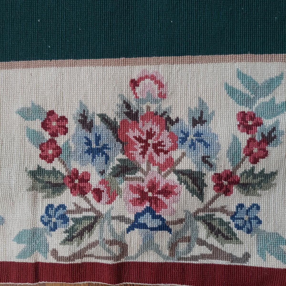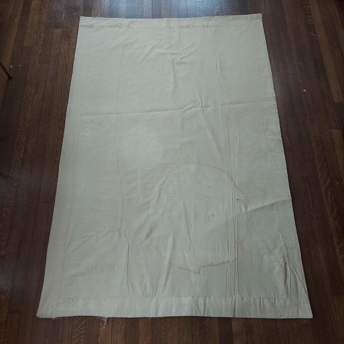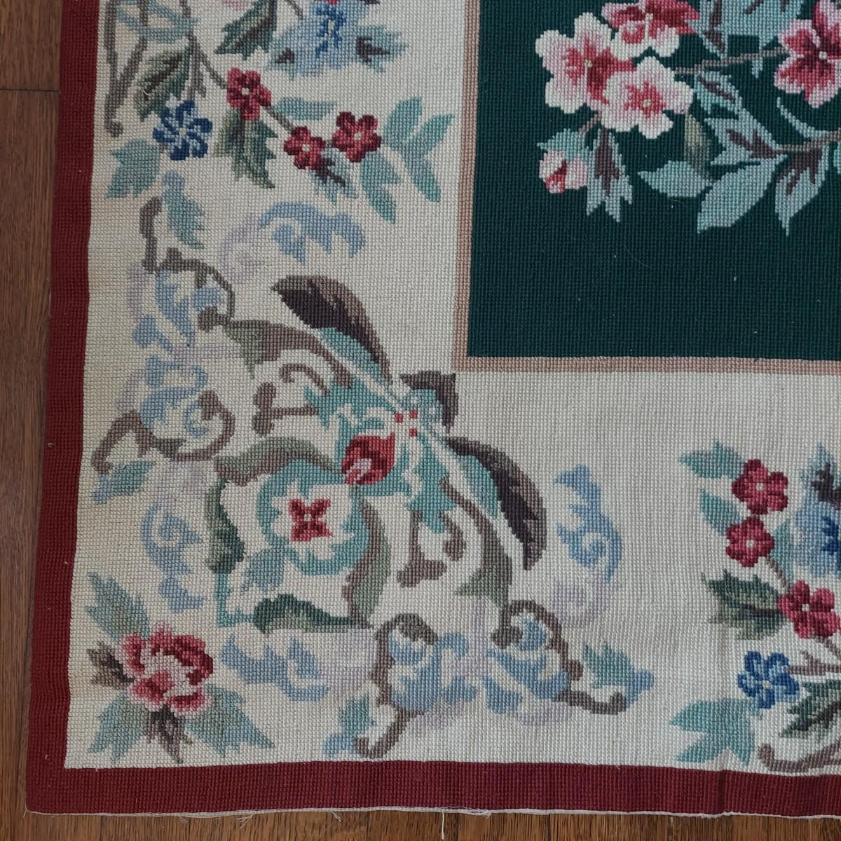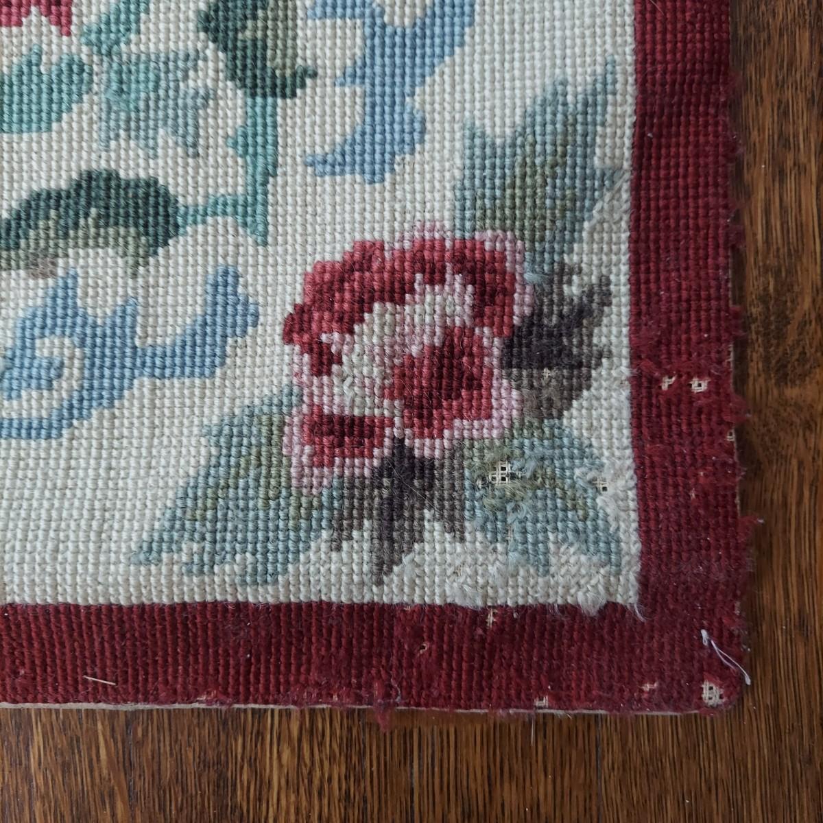 Large needlepointed tapestry with hand finished backing. Piece measures 47” x 71"H. Has a water spot on the back and some areas with condition issues on the front. Please see photos for details.