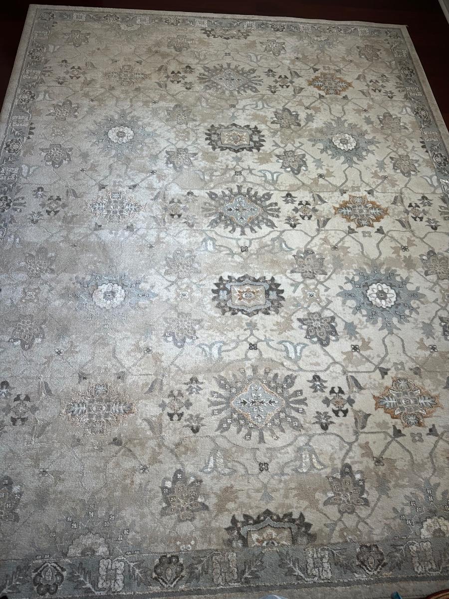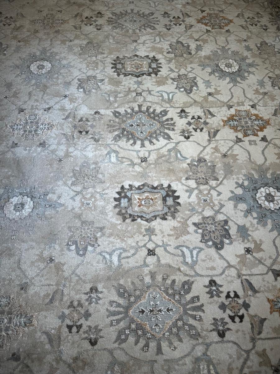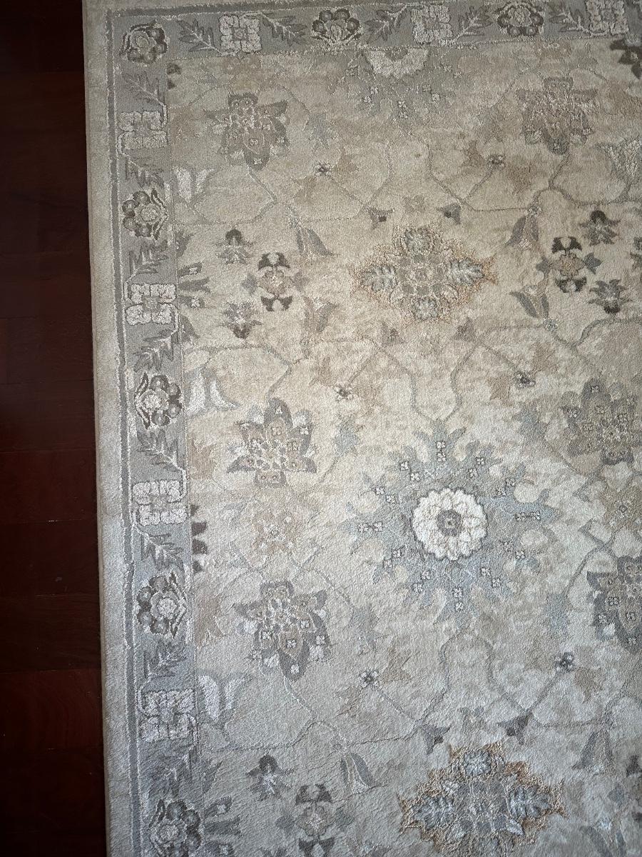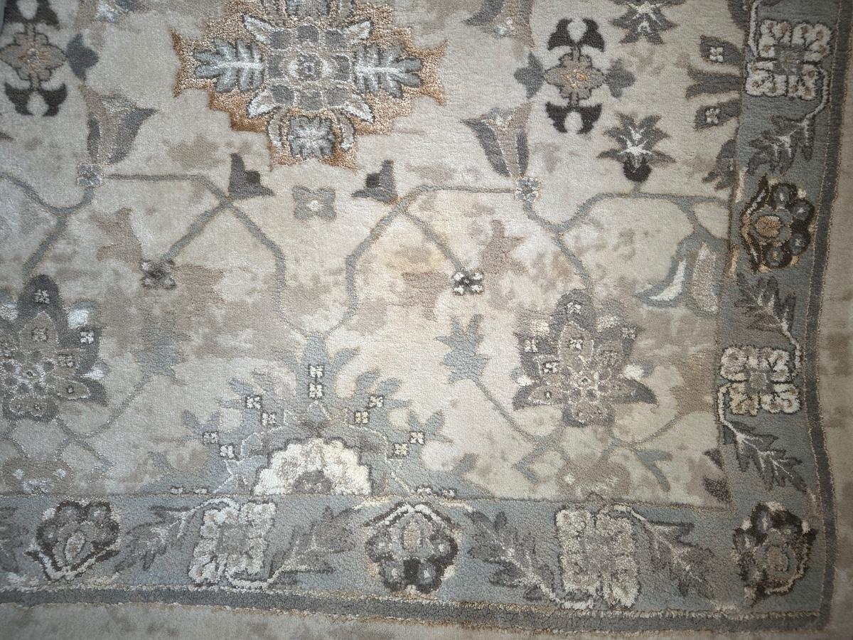 8 x 10 area rug with a floral and medallion pattern in soft beige, gray, and taupe tones.