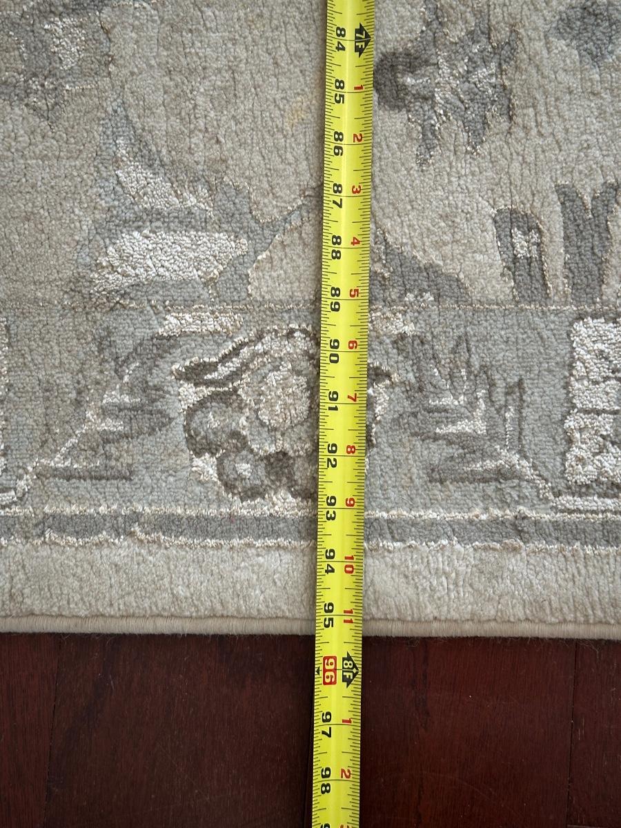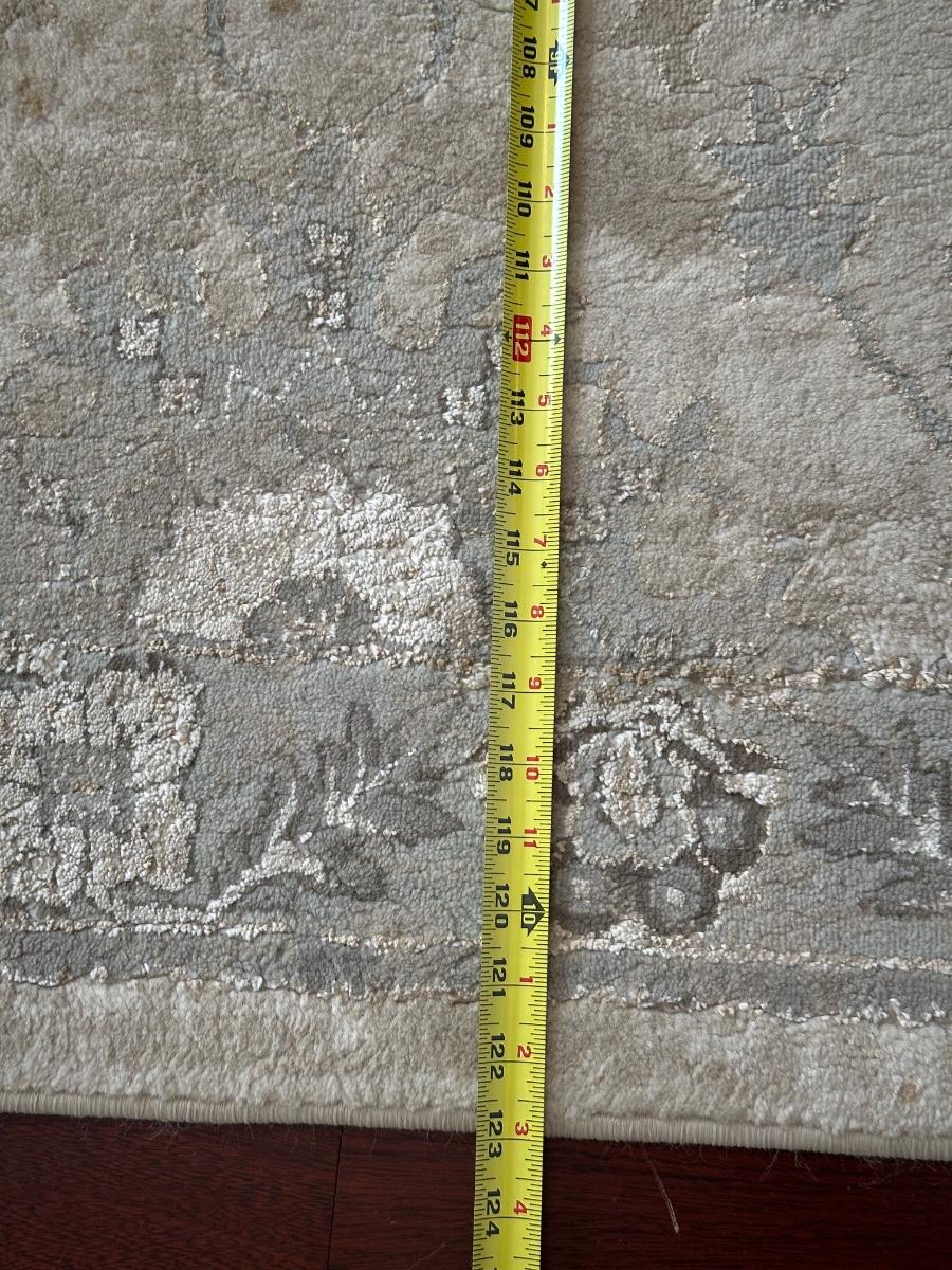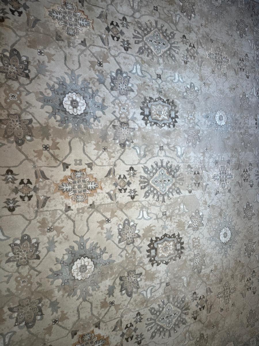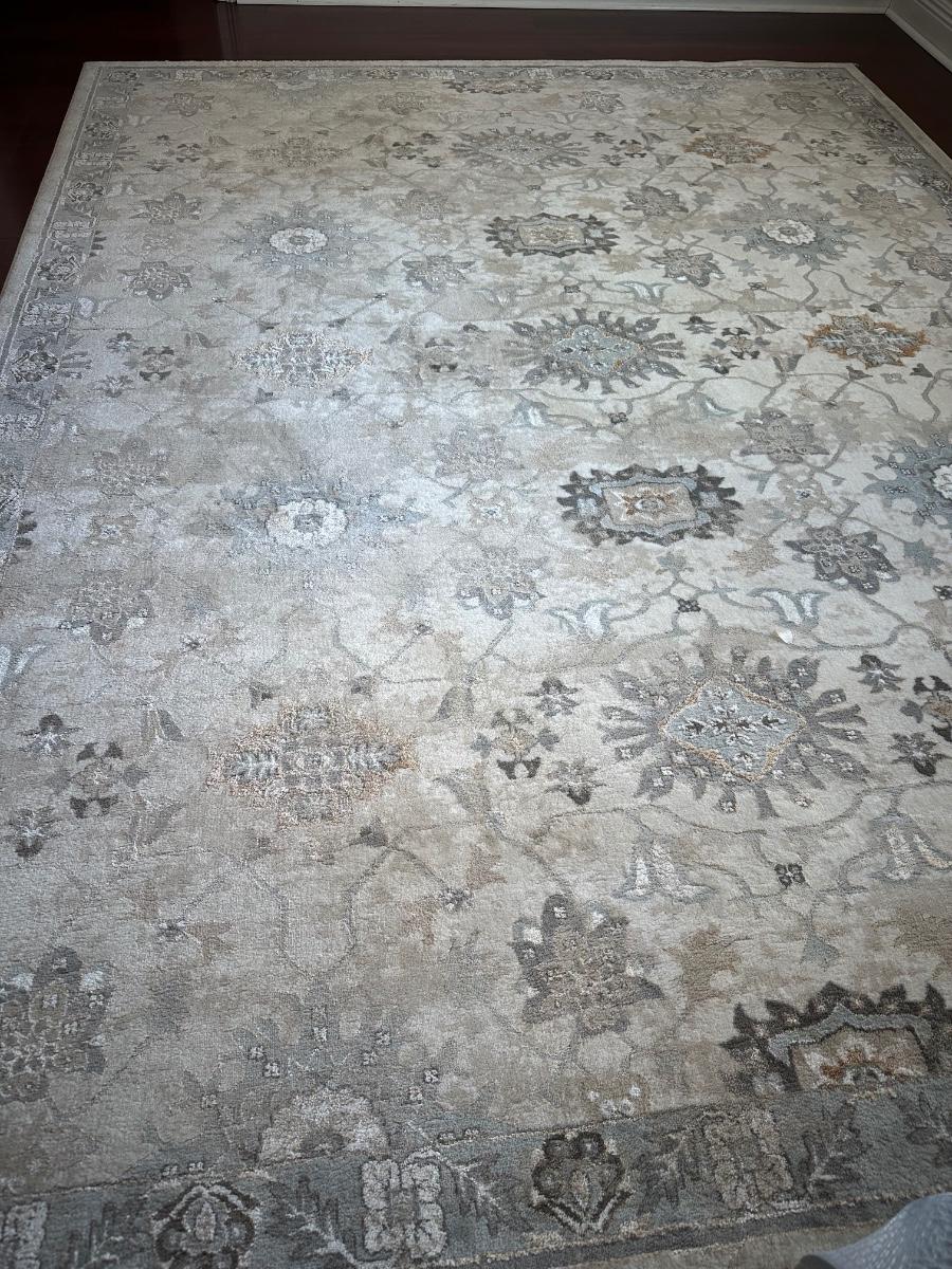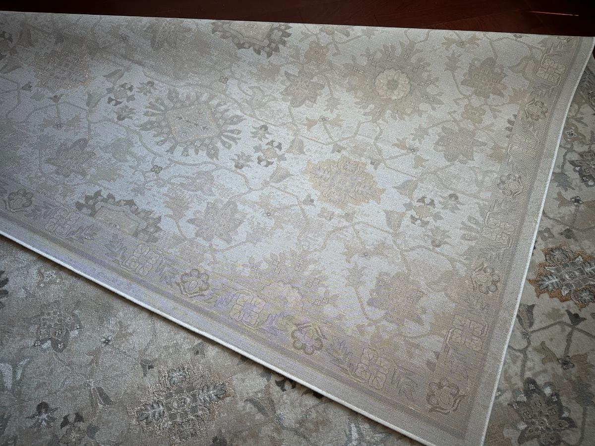 8 x 10 area rug with a floral and medallion pattern in soft beige, gray, and taupe tones.
