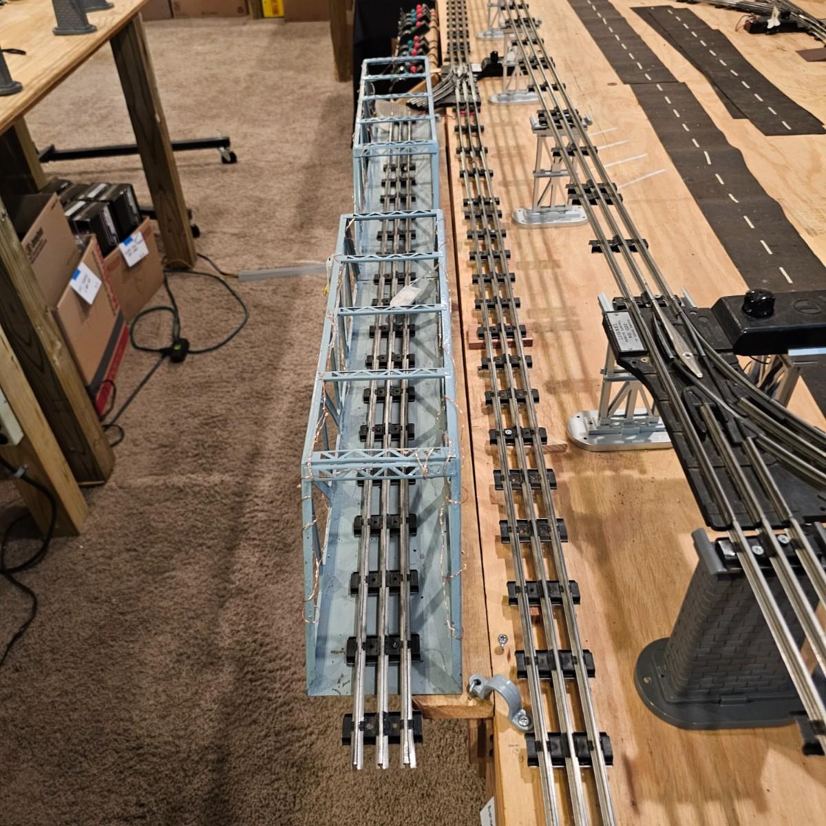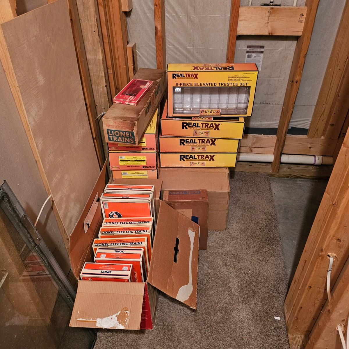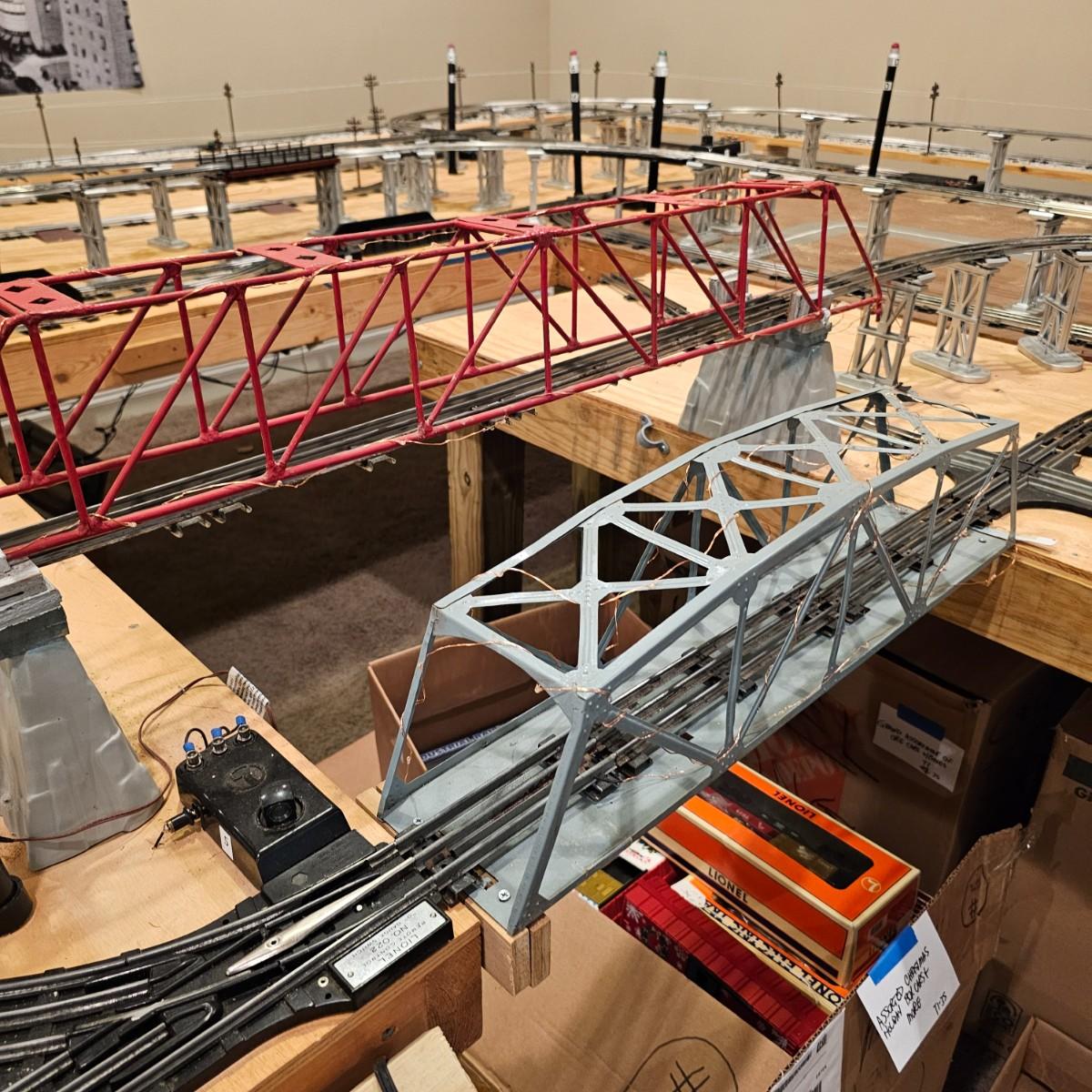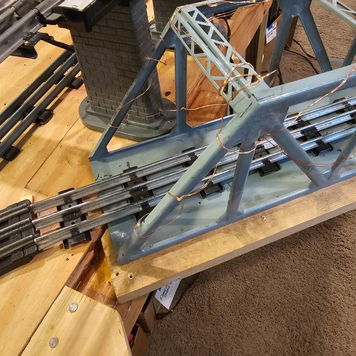 A complete O gauge layout with all the elements to go except rolling stock and power. Layout overall is approximately 13' x 32' with extra yard areas and an elevated section as well, mounted on trestle supports. There are over 40 switches and controllers and approximately 300' or more of track, both sectional pieces and long straights. The bench work is 36" in height, is composed of several separate sections mounted on 4" x 4" treated legs. Most of the benches are 48" x 96', some are 24" x 96" and some smaller. Also includes some original items used on layout, switches, bridges and trestle sets. All can be disassembled for removal. Winning buyer must coordinate pickup on Thursday August 28th, ideally taking everything but open to discussion. You must disassemble items yourself, bring tools, screwdrivers, drills, etc. Layout is located in basement of home but has outside access door. See photos for details. Local pickup only.