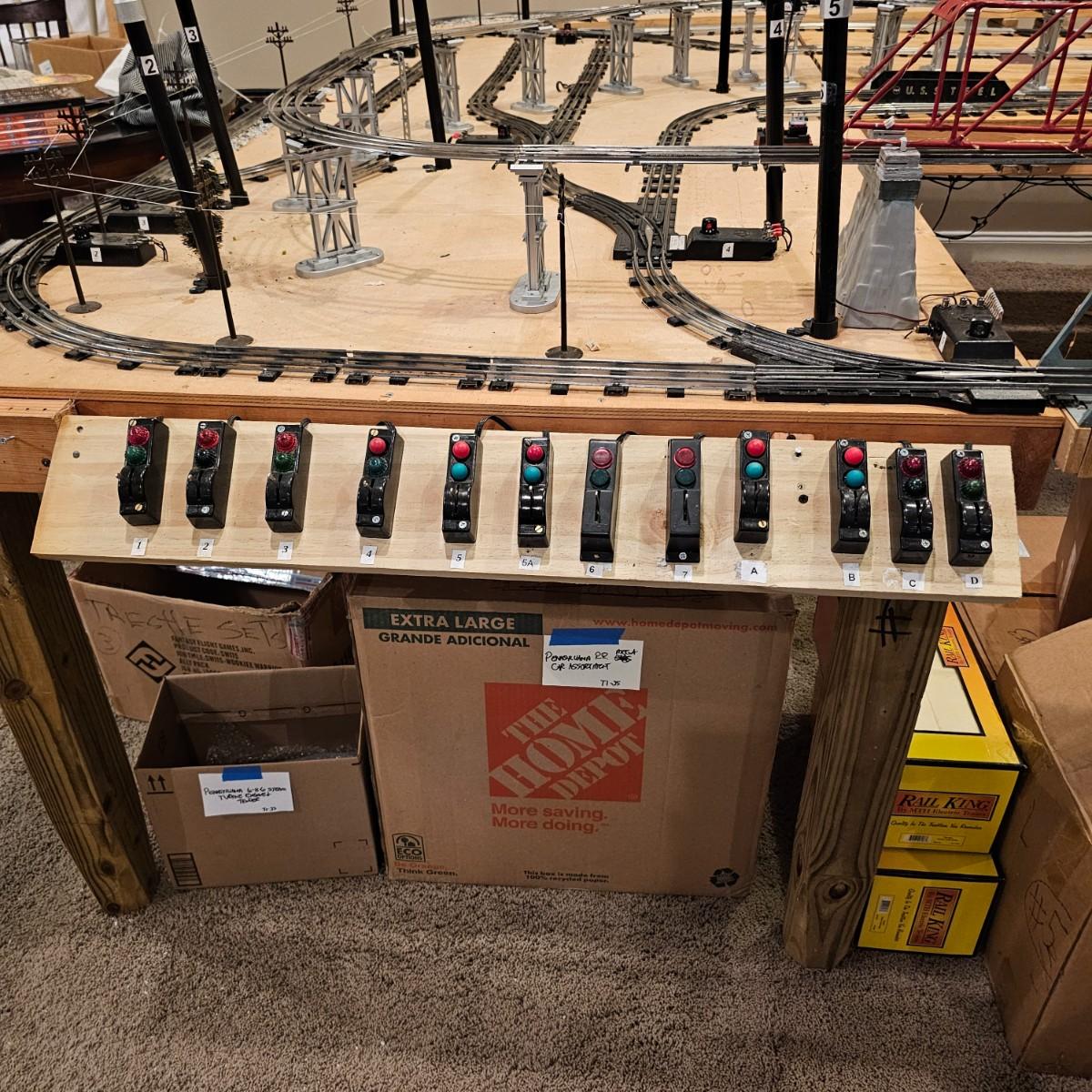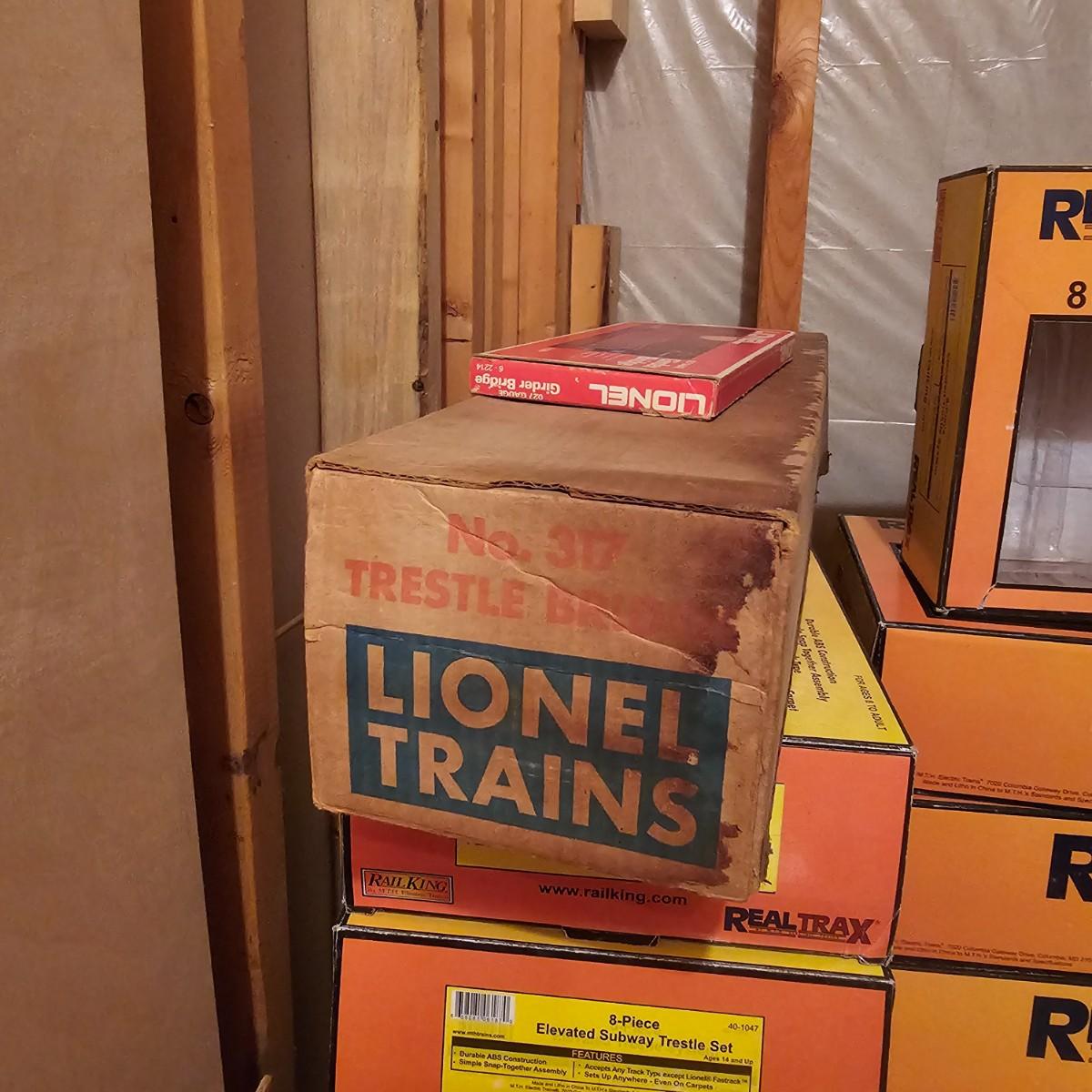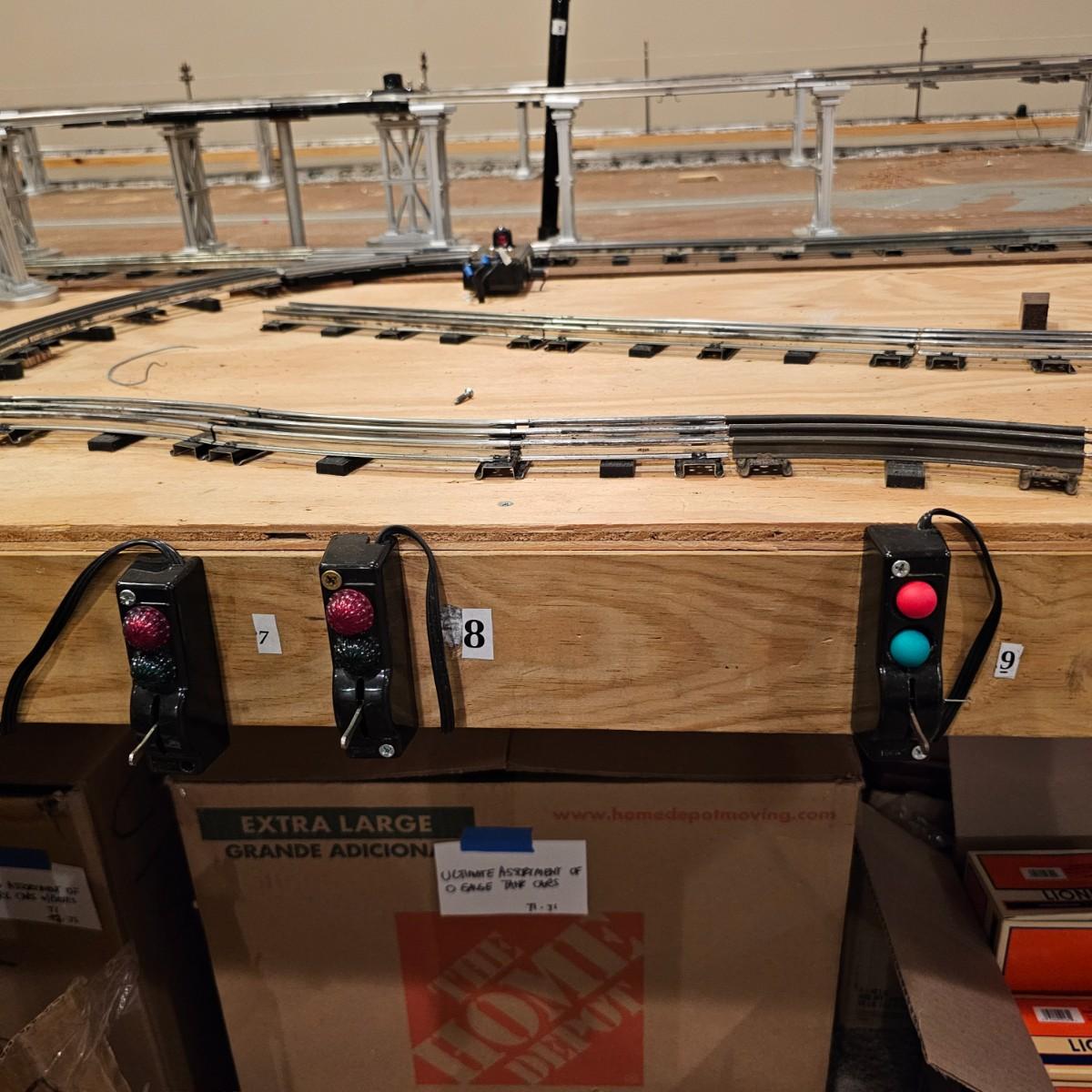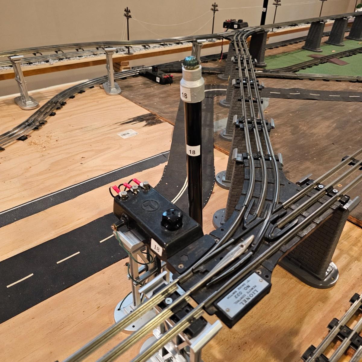 A complete O gauge layout with all the elements to go except rolling stock and power. Layout overall is approximately 13' x 32' with extra yard areas and an elevated section as well, mounted on trestle supports. There are over 40 switches and controllers and approximately 300' or more of track, both sectional pieces and long straights. The bench work is 36" in height, is composed of several separate sections mounted on 4" x 4" treated legs. Most of the benches are 48" x 96', some are 24" x 96" and some smaller. Also includes some original items used on layout, switches, bridges and trestle sets. All can be disassembled for removal. Winning buyer must coordinate pickup on Thursday August 28th, ideally taking everything but open to discussion. You must disassemble items yourself, bring tools, screwdrivers, drills, etc. Layout is located in basement of home but has outside access door. See photos for details. Local pickup only.