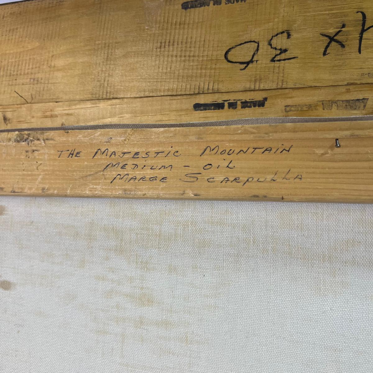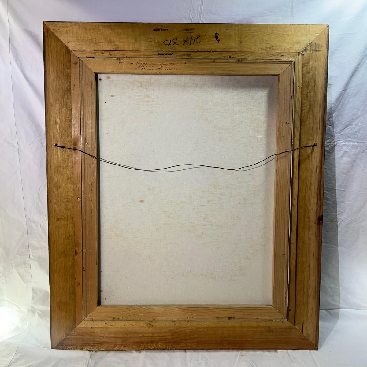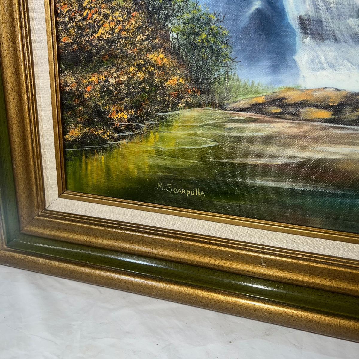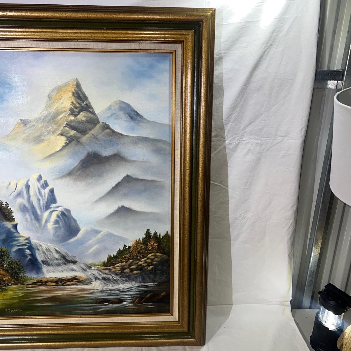 Beautiful Large Oil Painting of Mountains & Waterfall with a wooden Golden frame accented by a nature green border and and tan fabric. Artist signed M. Scarpulla. Minor dings on wood frame near top. Dimensions are 32 1/4" x 38 1/2"
