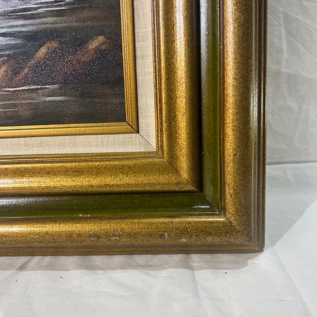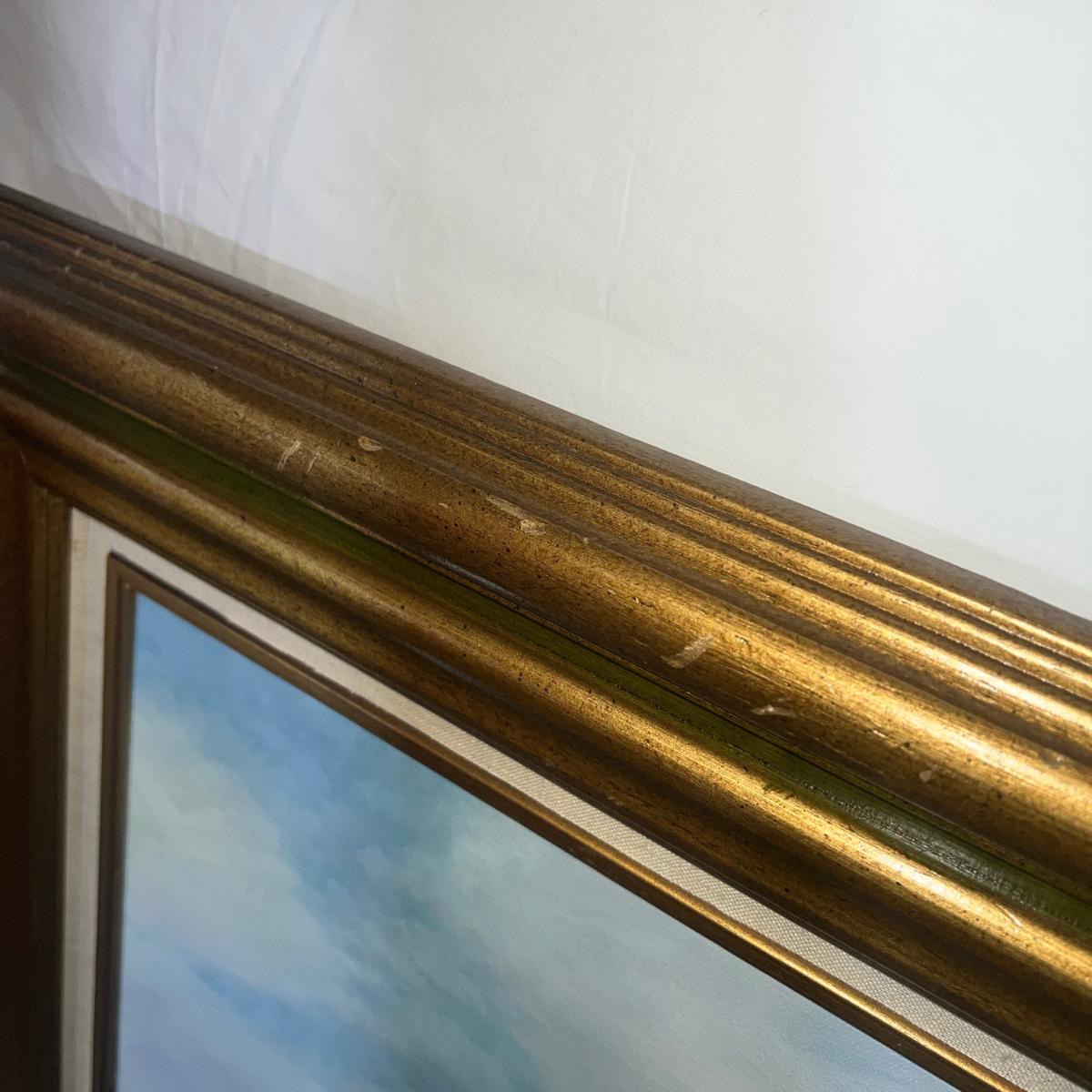 Large Oil Painting of Mountains & Waterfall with a wooden Golden frame.