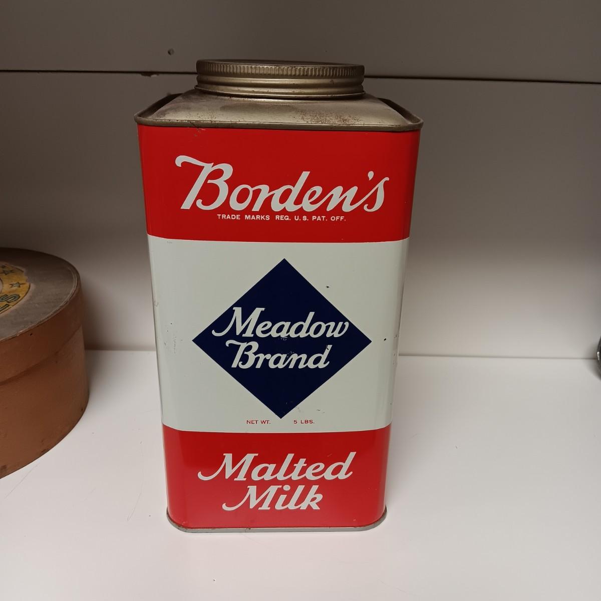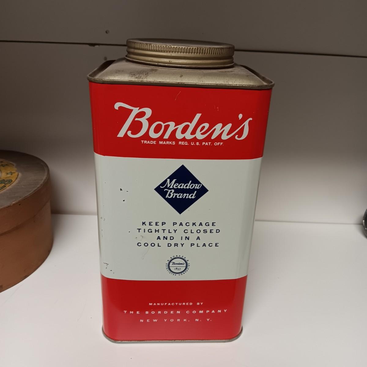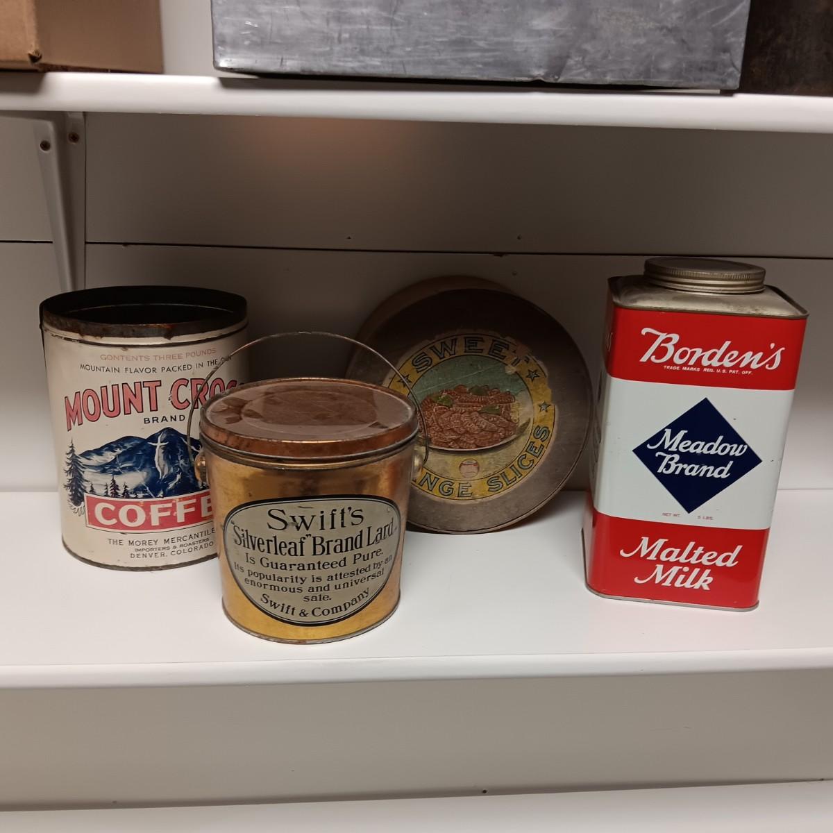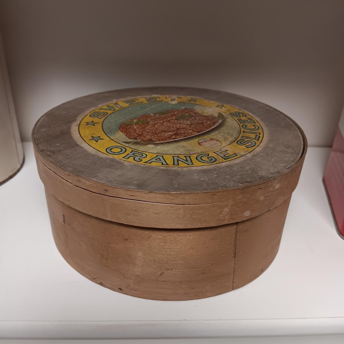 LARGE OLD TINS AND A WOODEN ROUND CONTAINER