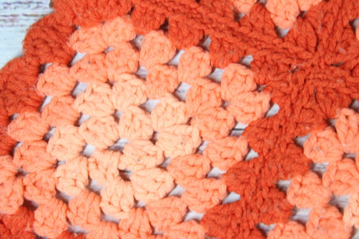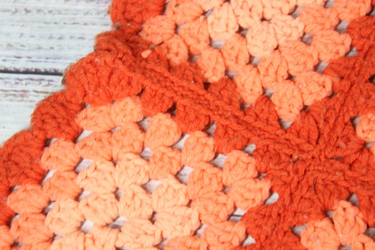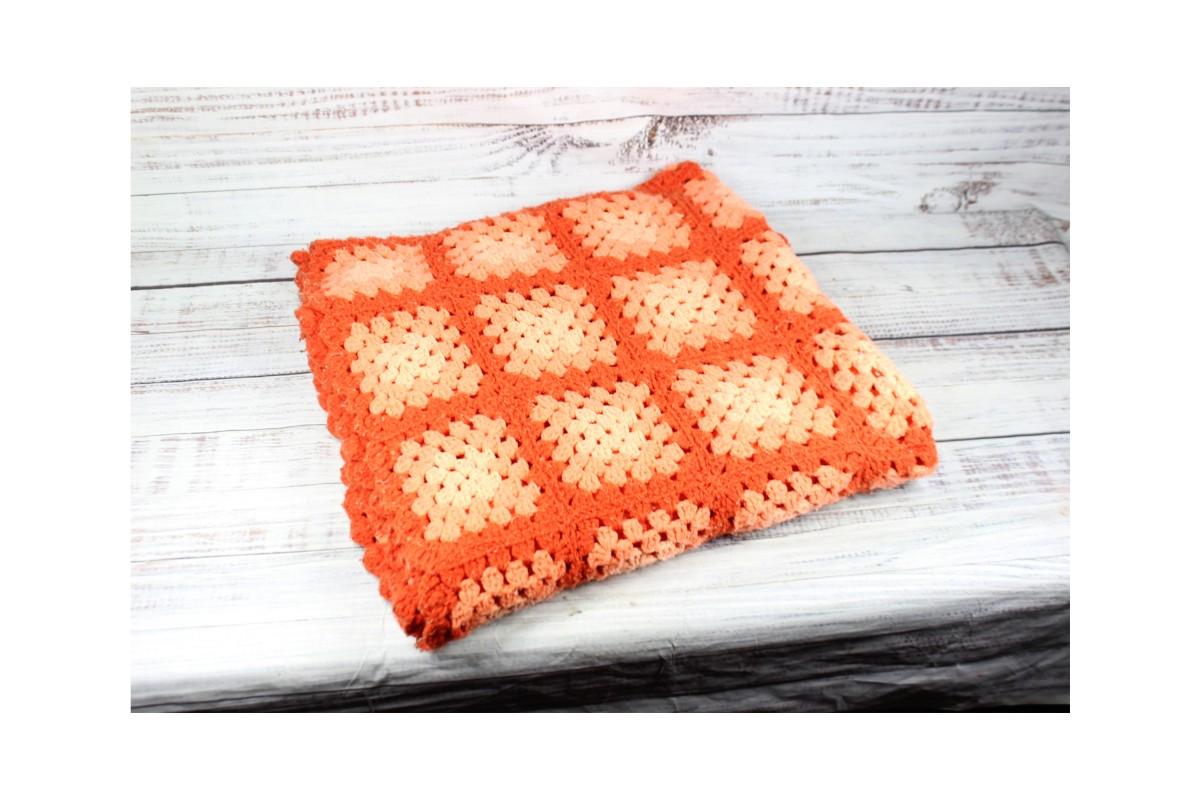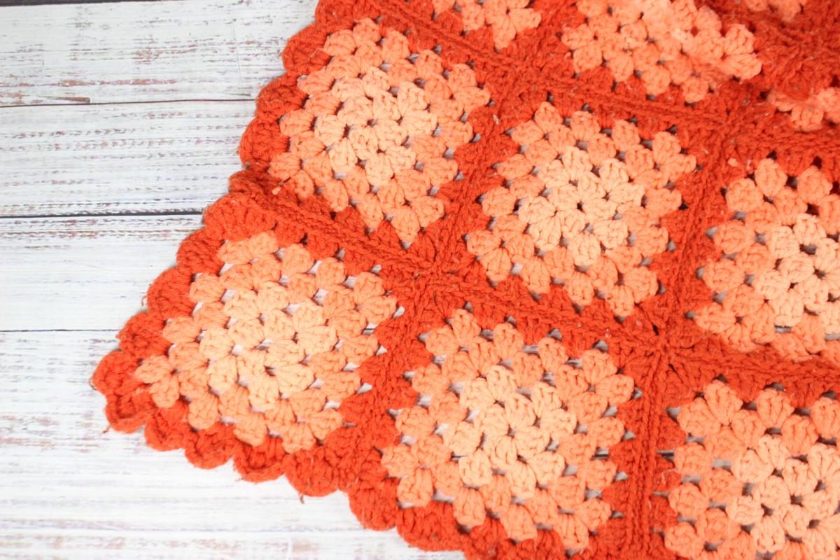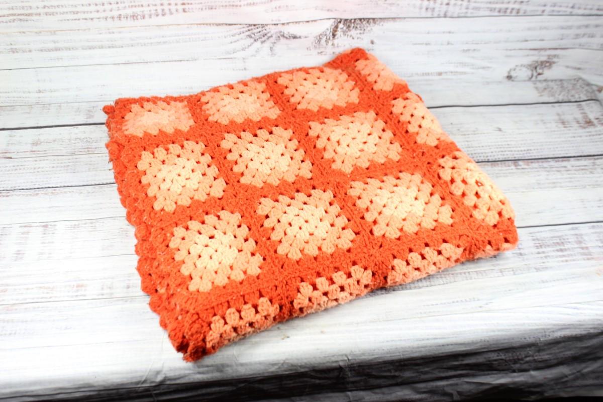 Large Orange Knitted Blanket, there are no significant rips or tears to the blanket and is in good useable condition. Check pictures for more details. The blanket measures to about 6 feet long and 3 1/2 feet wide.