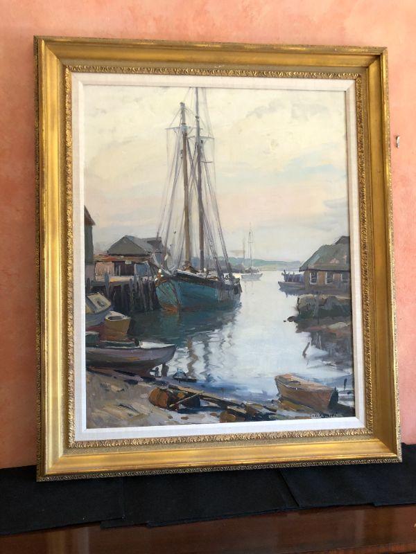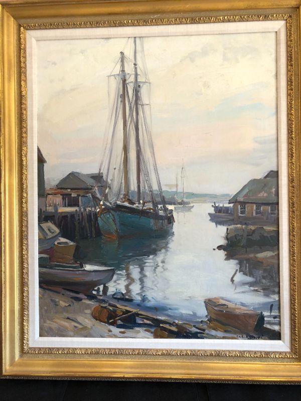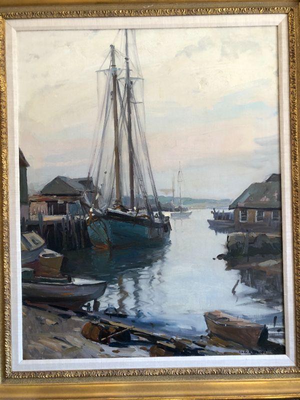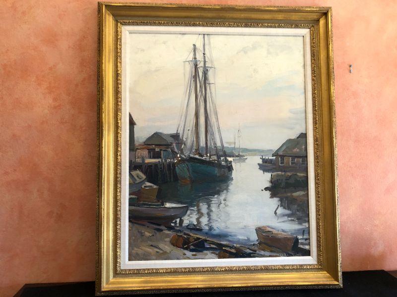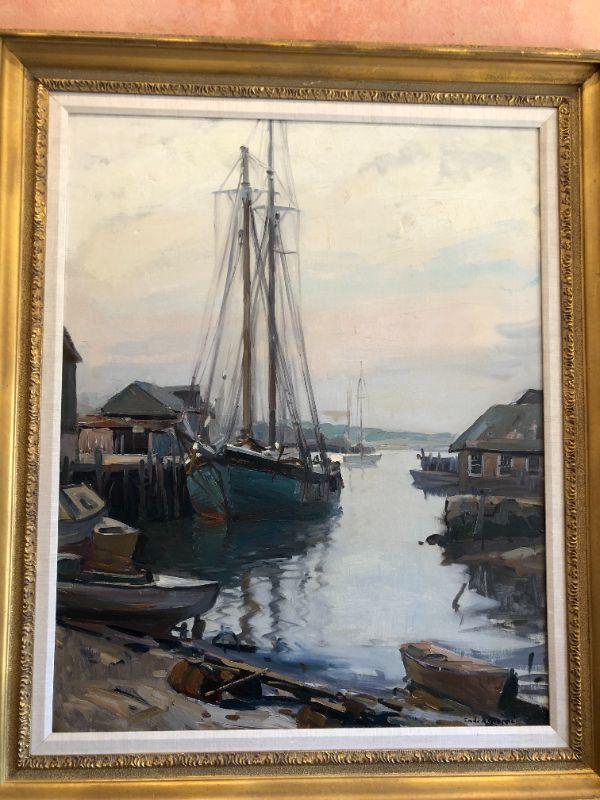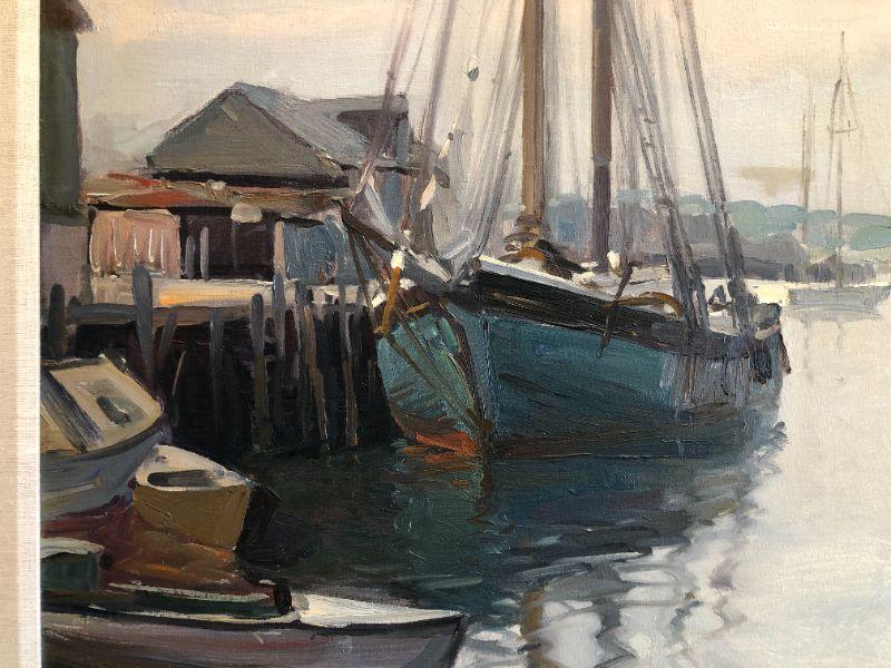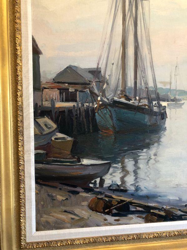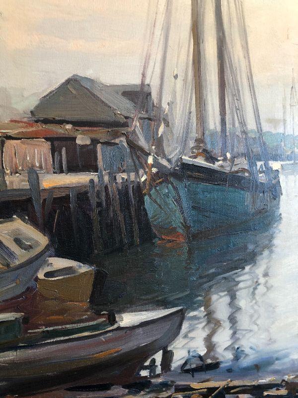 A beautiful large original oil painting by Emile Albert Gruppe (1896-1978). A tranquil scene of a sailboat docked in a calm harbor port (potentially Gloucester Massachusetts). Everything in the painting feels quiet and calm, as if it's still very early and the busy dock work has not yet begun. When you look into the painting, you feel as if you are transported back decades in time, walking along a New England harbor boardwalk in the early hours just after dawn, smelling the salt of the sea as you inhale the brisk air, and looking up at a beautiful sailboat docked nearby.. the morning light increasingly illuminating the partly cloudy skies, slowly revealing faint patches of blue sky, and casting dark shadows along the glass-like water. Wonderful details.