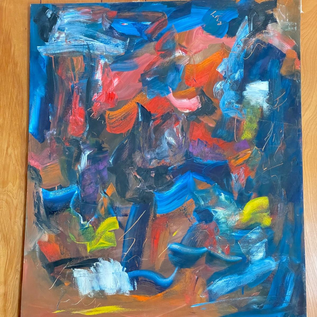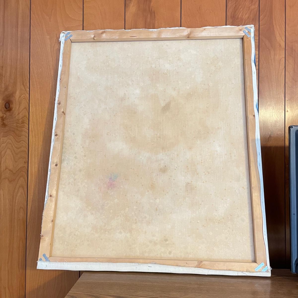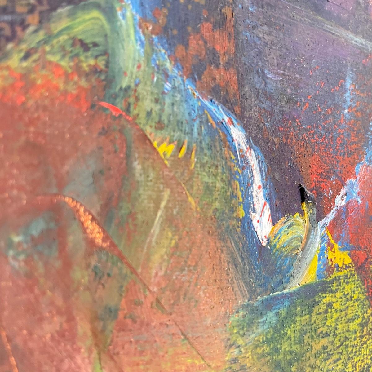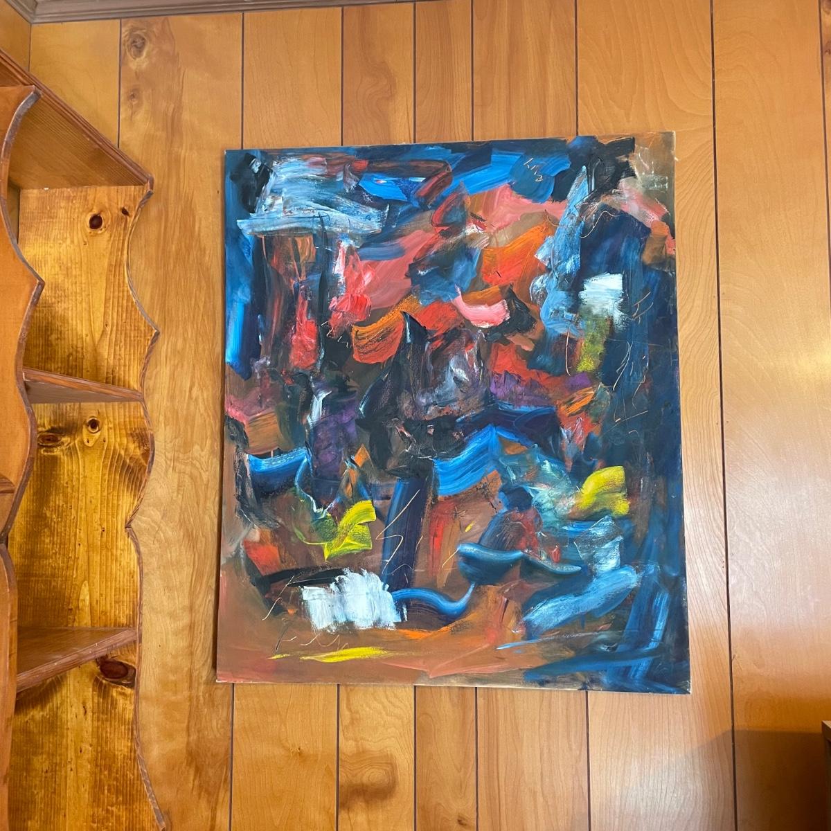 Large colorful original painting on canvas mounted onto wood frame. Piece measures 30” x 35.75”. See images. Shipping available. Shipping art can be costly. We suggest calling our local UPS with dimensions and getting an estimate before bidding: (828) 252-6930.
