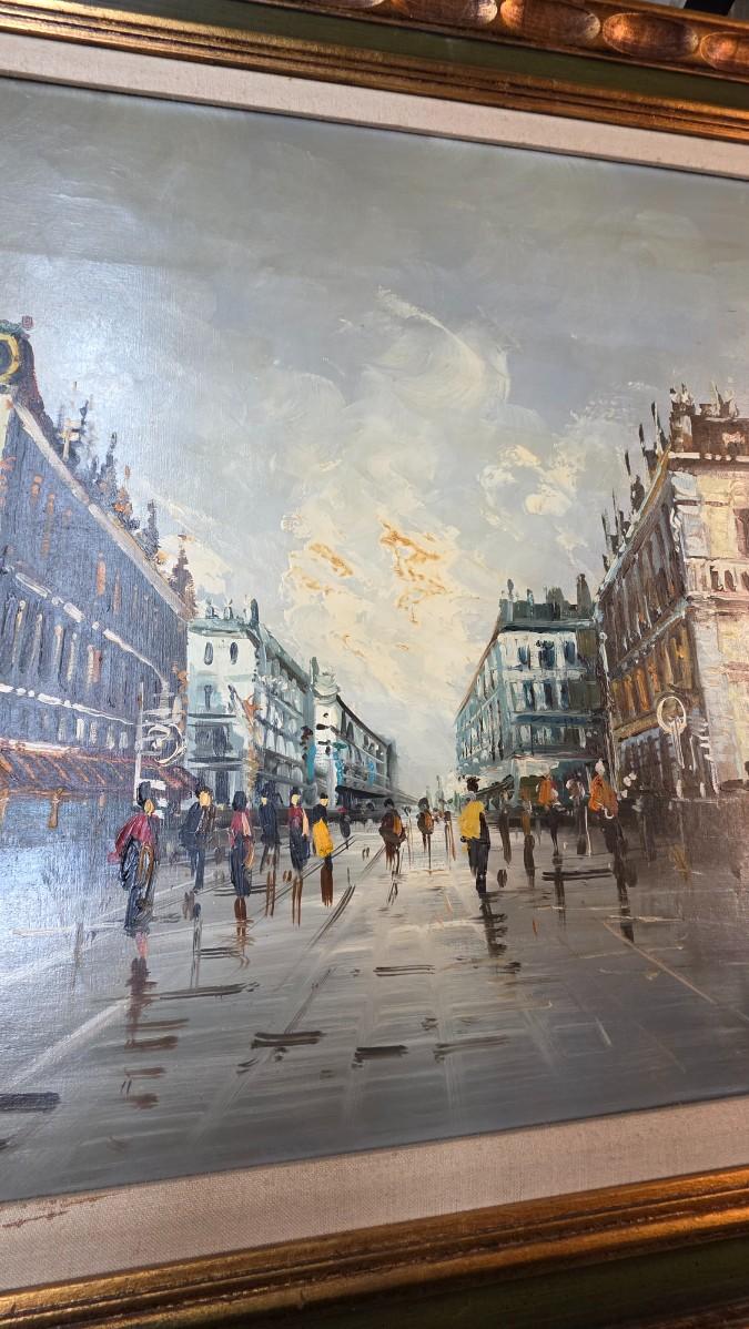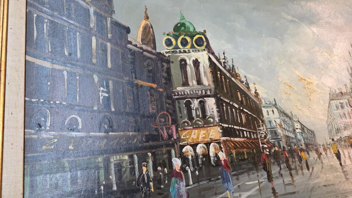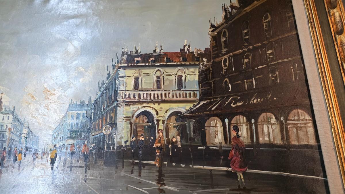 This commanding original oil painting presents a timeless Parisian street scene rendered with depth, movement, and atmospheric elegance. The composition draws the viewer into a rain-washed boulevard near the Opera district, where historic façades, glowing cafés, and strolling figures are reflected across the pavement beneath a softly illuminated sky. The scene balances architectural grandeur with human presence, capturing the quiet rhythm and romance that define Paris at dusk.