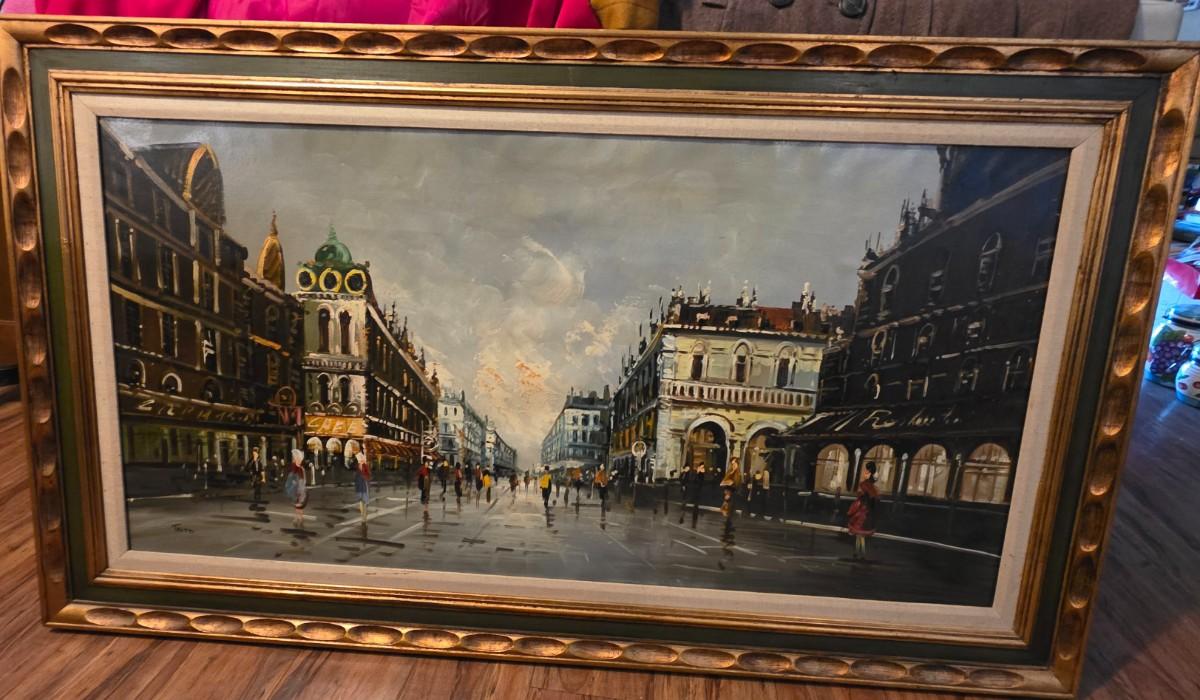 Large Original Paris Street Scene Oil Painting, Signed “Tritti” – Framed European Cityscape, 56” x 32”