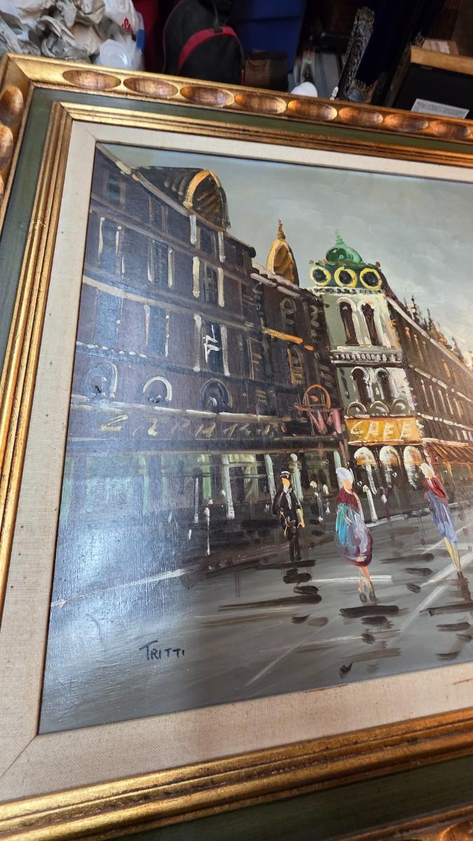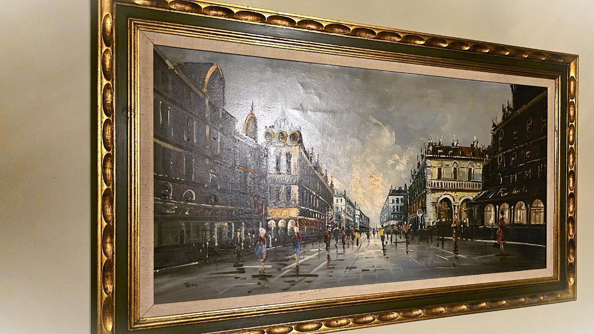 Executed in oil on canvas, the work displays confident brushwork and layered texture throughout, with expressive handling of light and perspective that gives the scene both scale and dimension. The painting is signed “Tritti” in the lower left, consistent with European decorative fine art produced in the latter half of the twentieth century. This is a hand-painted original, not a print or reproduction, and the surface exhibits the natural character and depth expected of oil on canvas.