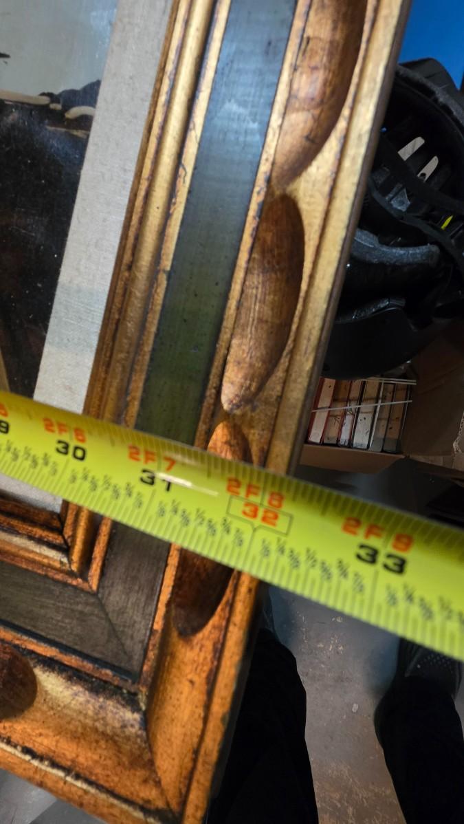 Measuring approximately 56 inches wide by 32 inches high, the painting is presented in an impressive, professionally crafted frame featuring carved detailing, gilded accents, and a linen liner. The frame enhances the artwork’s visual impact and transforms it into a true statement piece suitable for anchoring a refined living space, office, or curated collection.