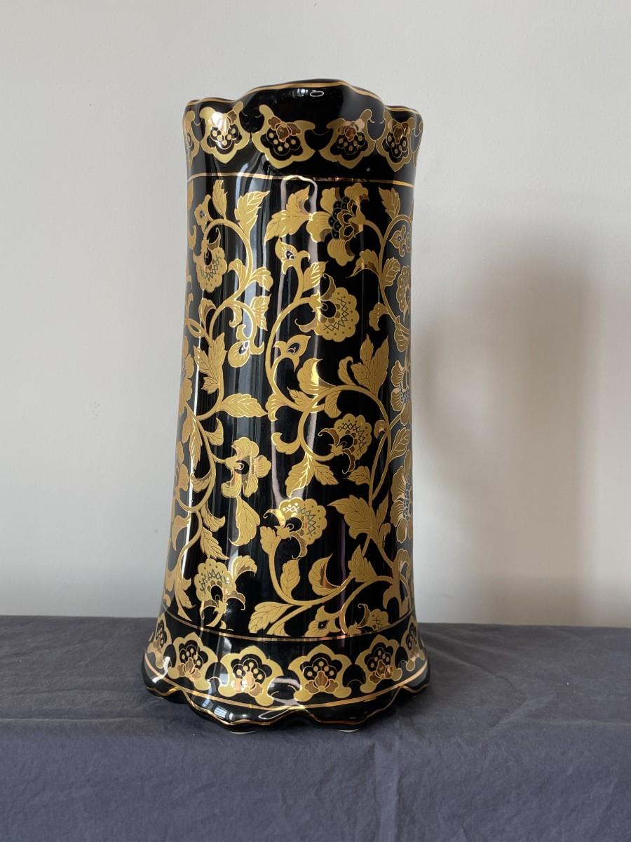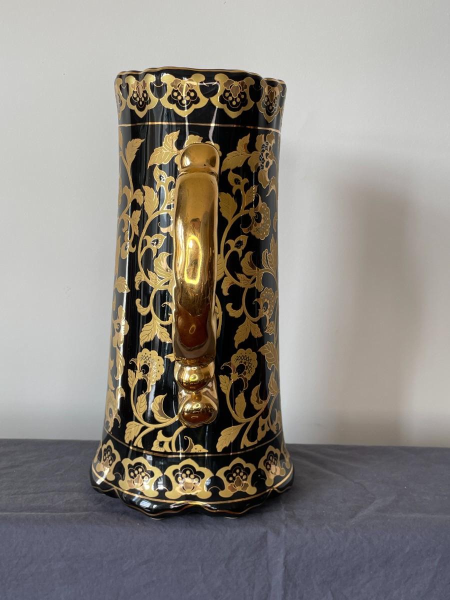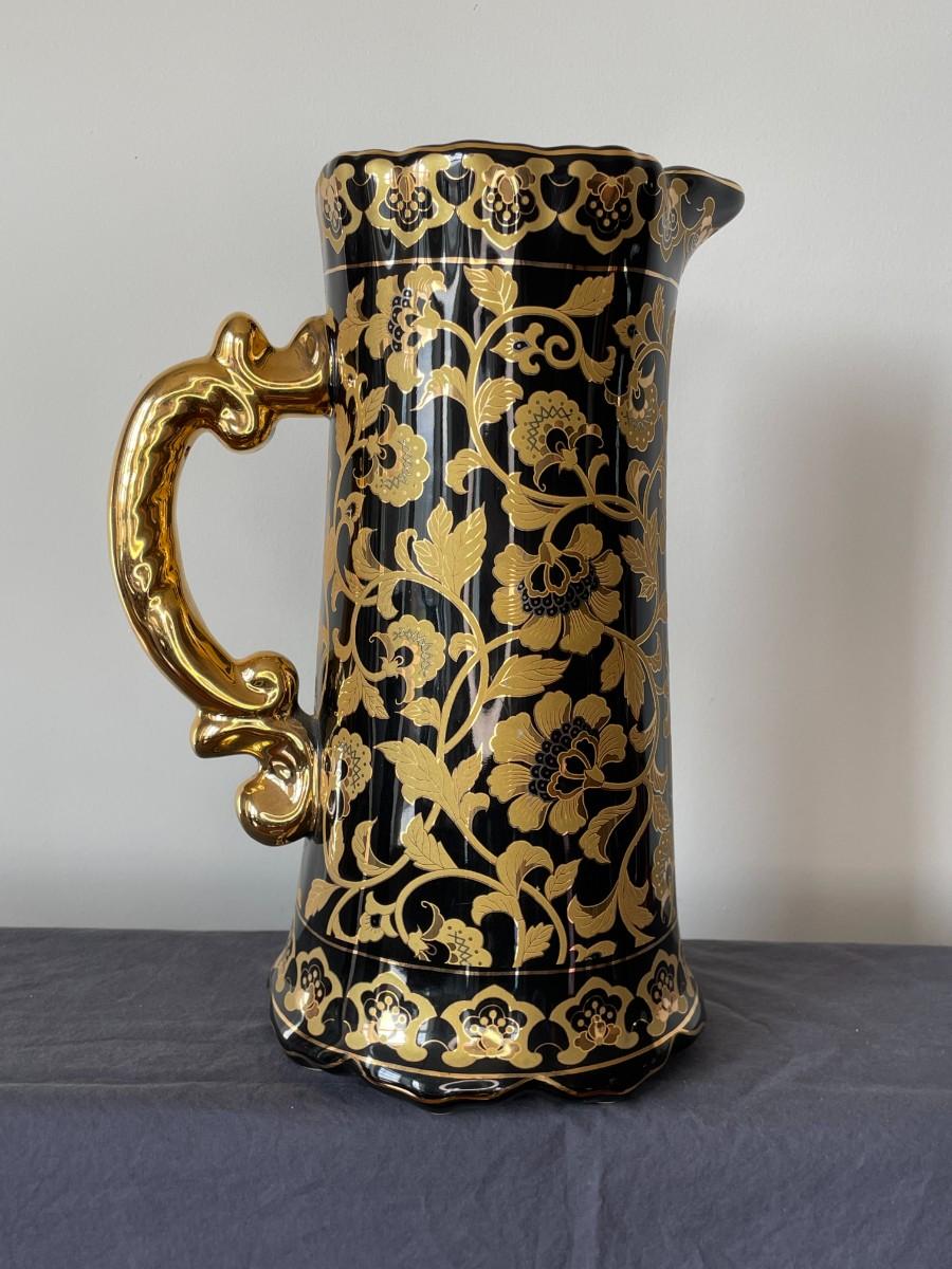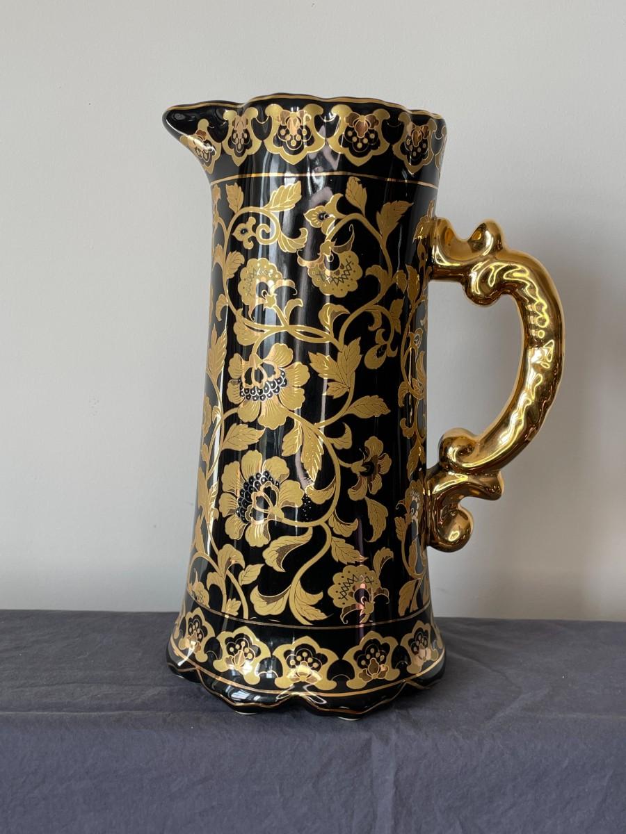 Black and Gold ceramic water pitcher with floral leaf design. 12"H x 7"W