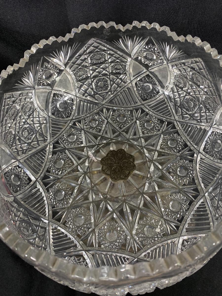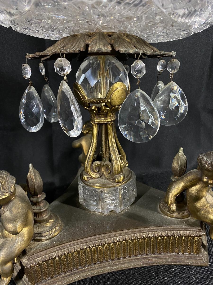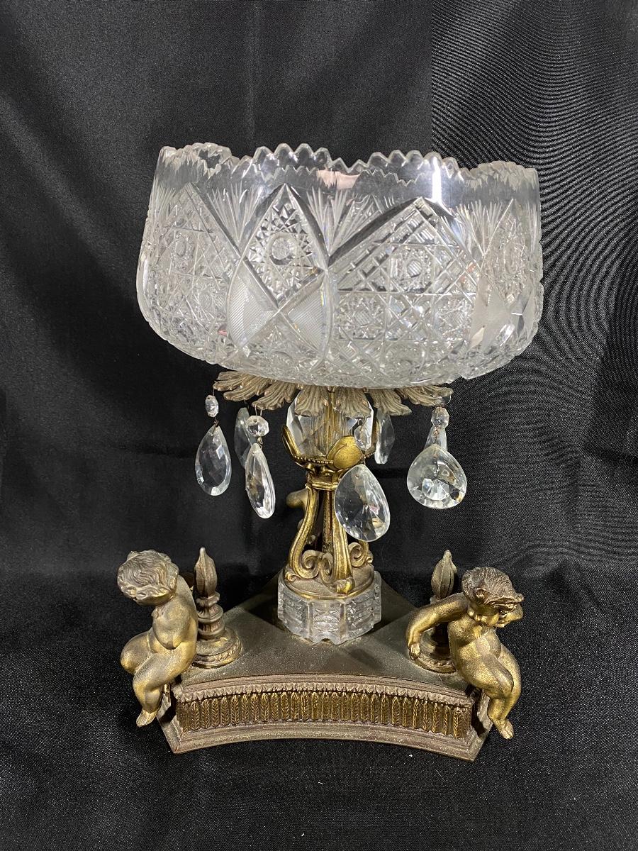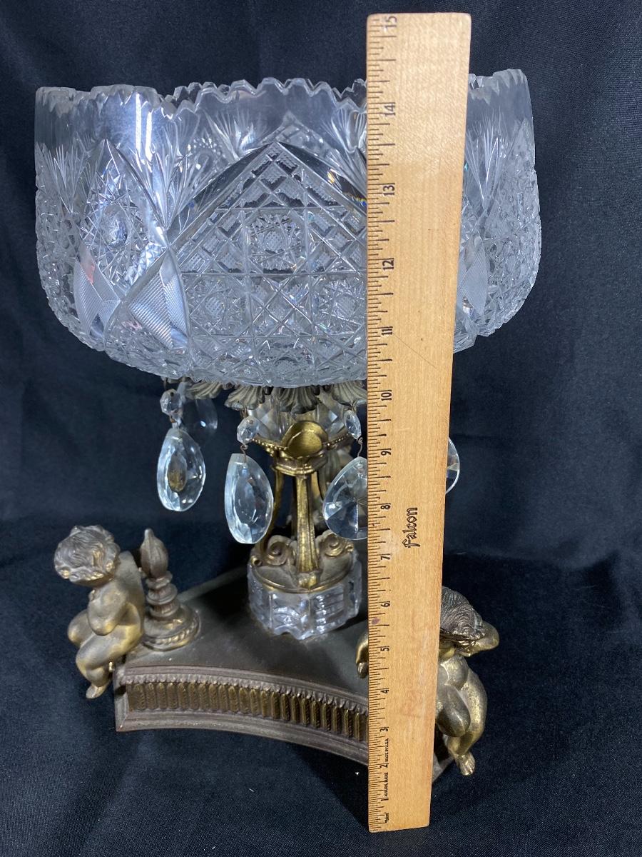 Large Ornate ABP Brass Regency Cherub Pedestal Cut Crystal Bowl