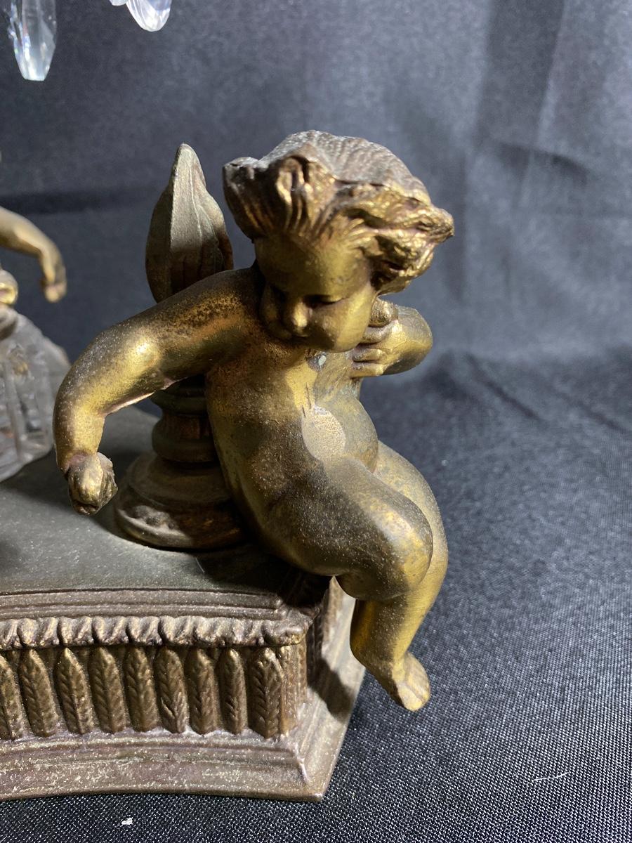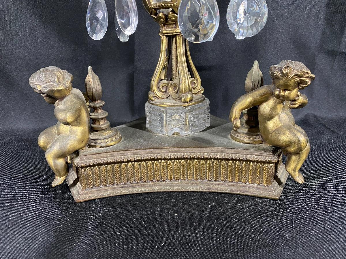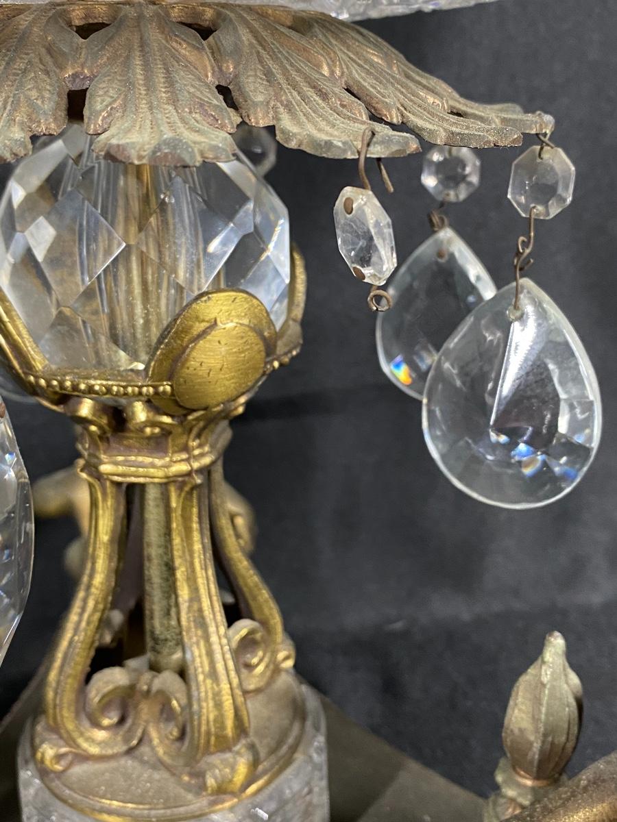 Cut crystal atop a metal base. The base is quite oxidized and one of the dangling crystals is missing. Extremely heavy; see pictures.