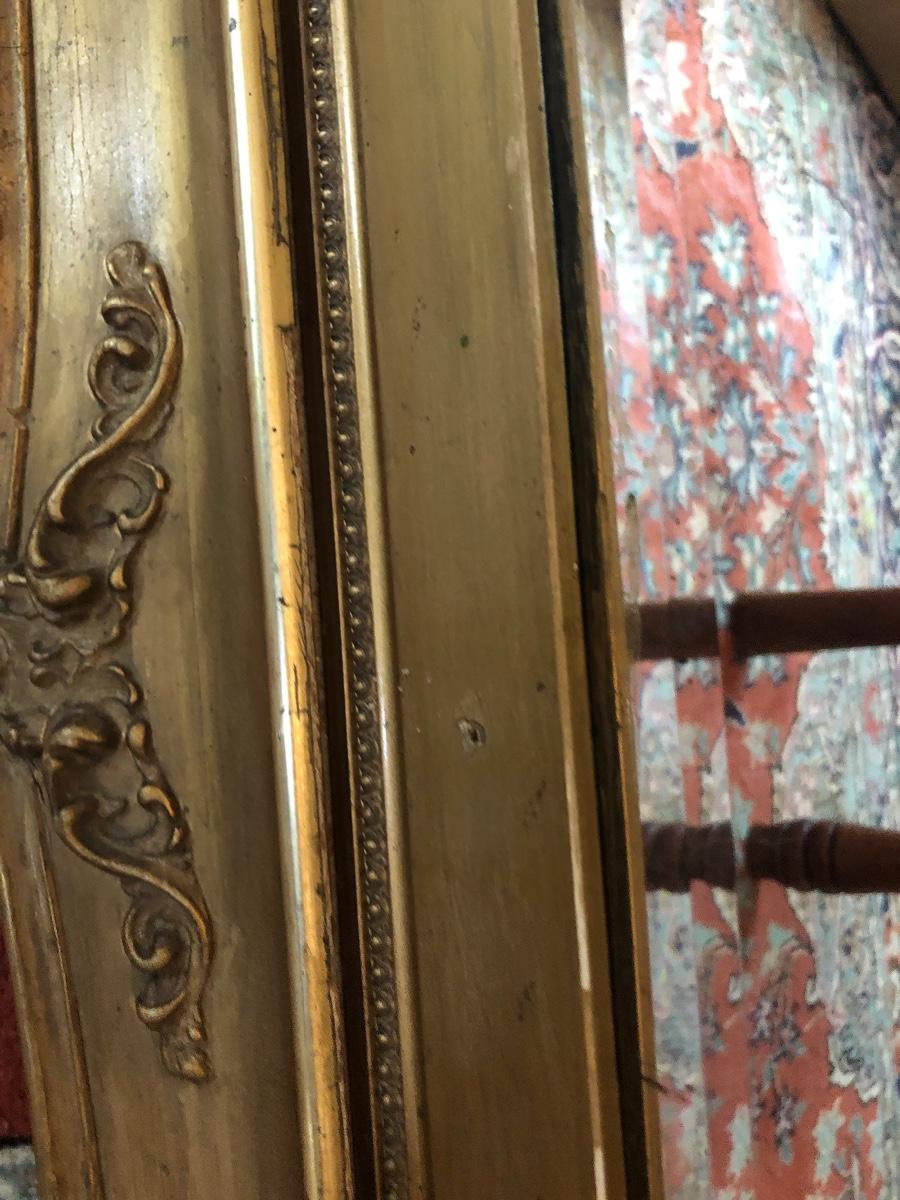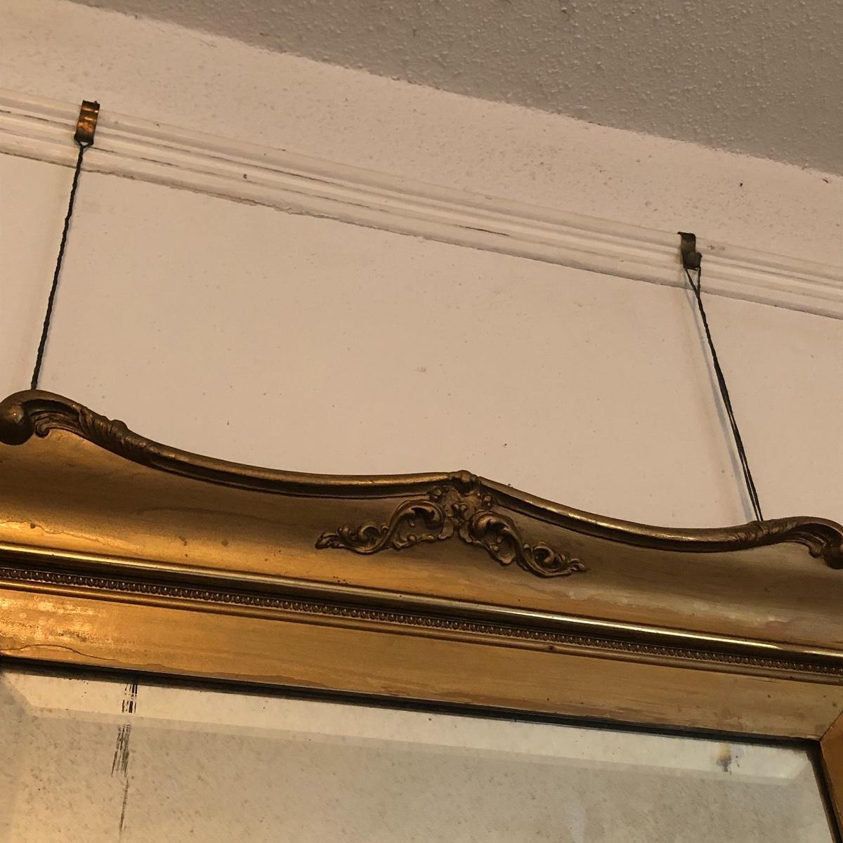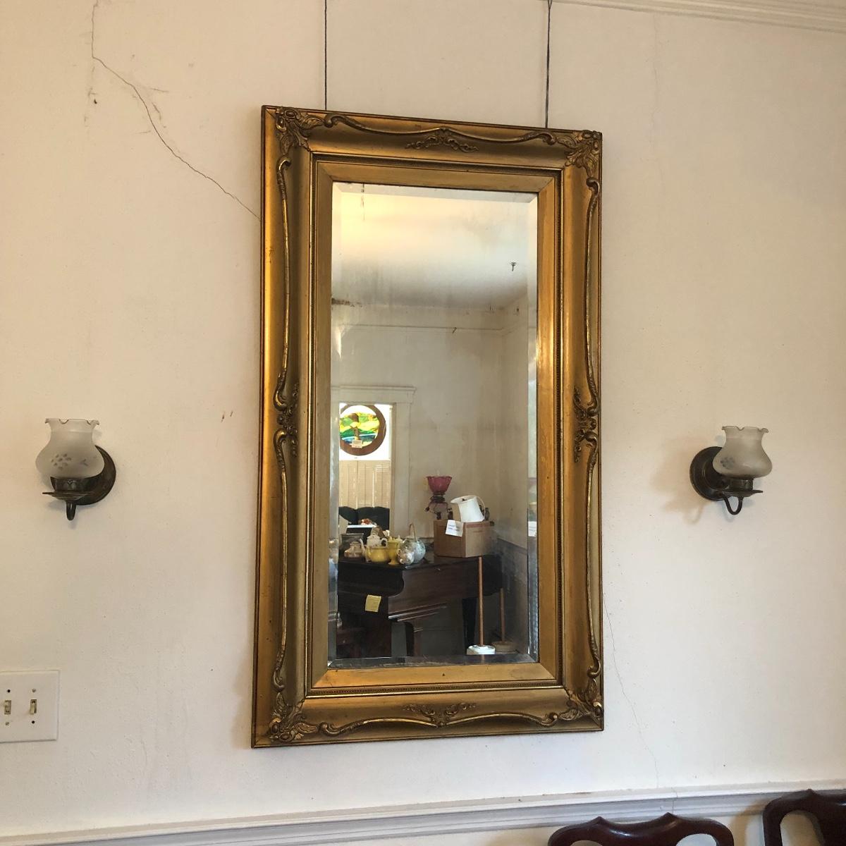 This beveled mirror measures 30” x 51”. It’s very ornate frame appears to be a gilded light wood. There are age signs in the lead glass and a few blemishes see images.