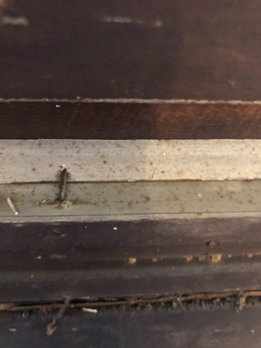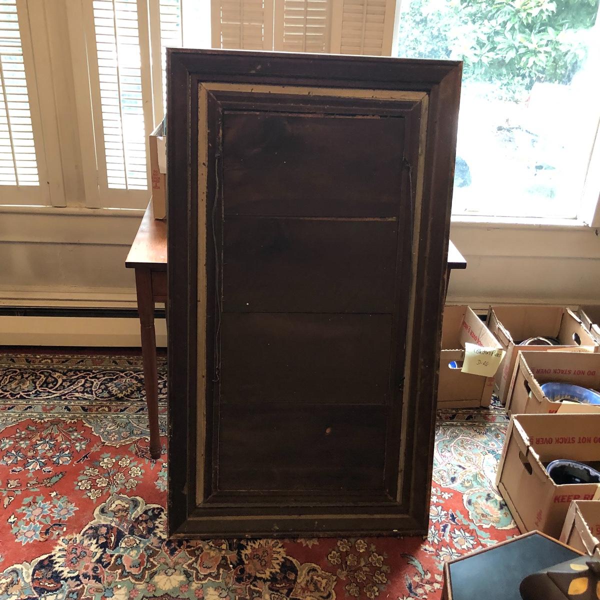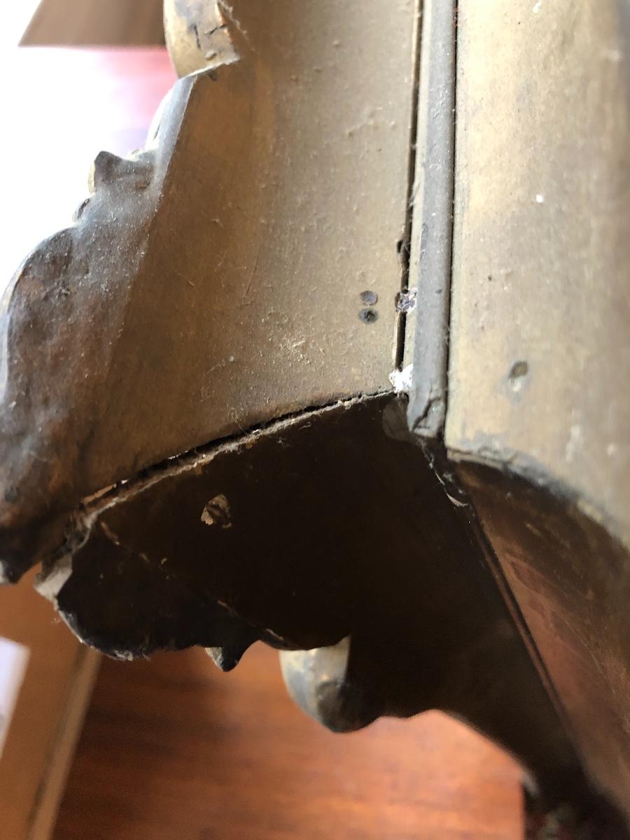 This beveled mirror measures 30” x 51”. It’s very ornate frame appears to be a gilded light wood. There are age signs in the lead glass and a few blemishes see images.