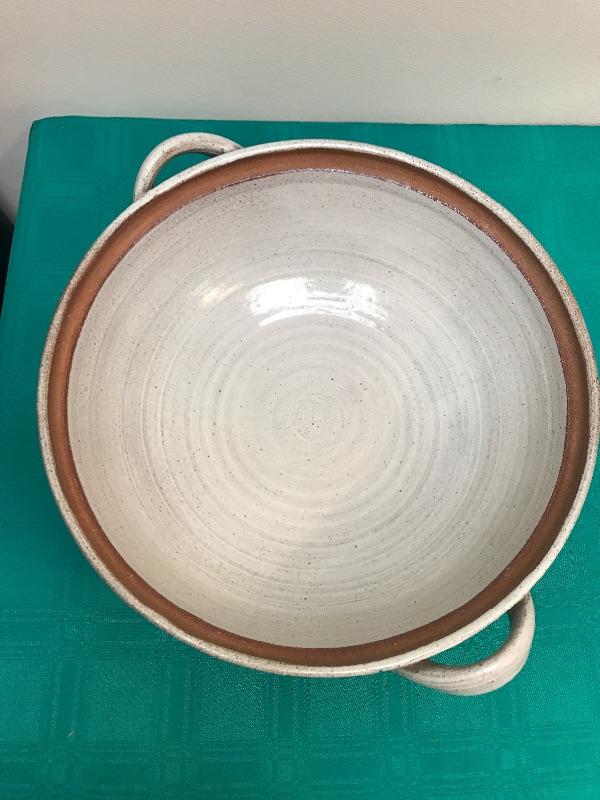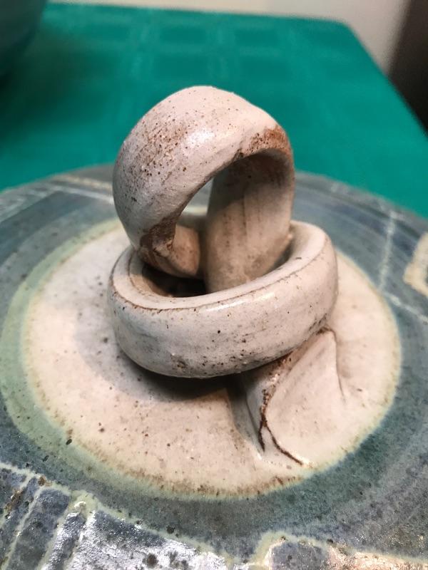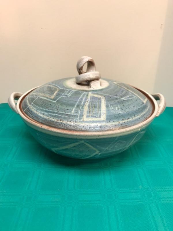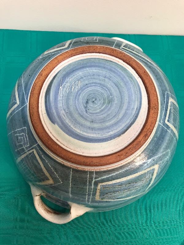 Excellent condition there are no visible cracks, or chips on the bowl or the lid. The ball is unmarked other than the inscription, “Kim” on the bottom.