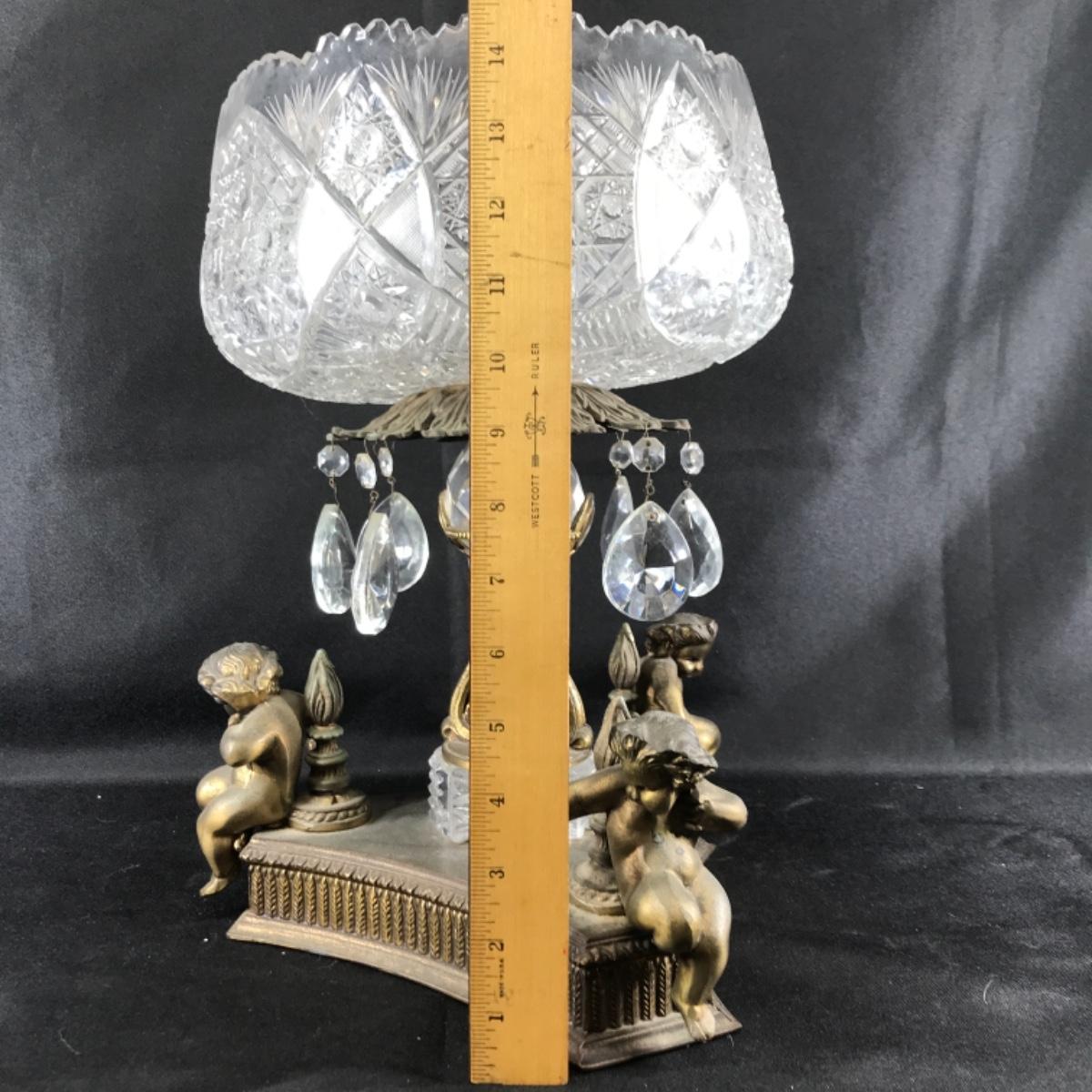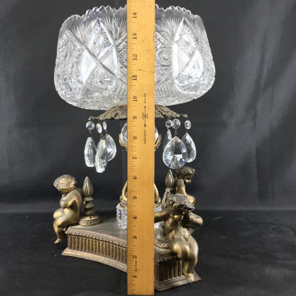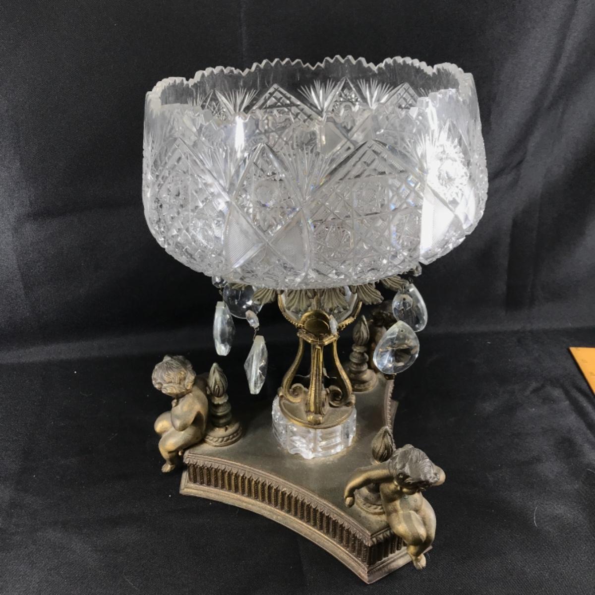 Large Ornate ABP Brass Cherub Pedestal Cut Crystal Bowl