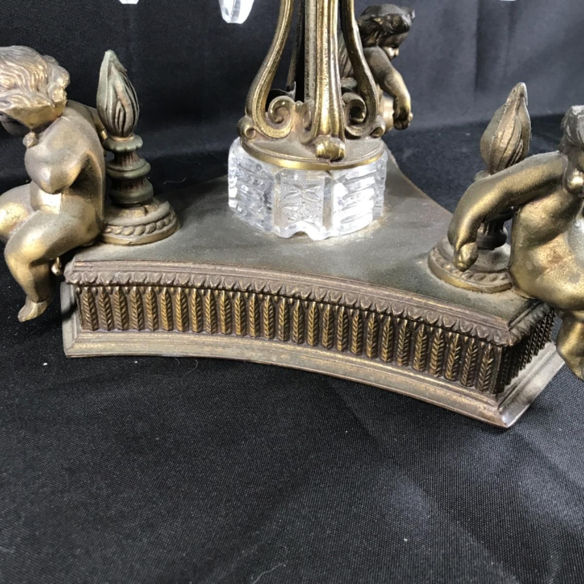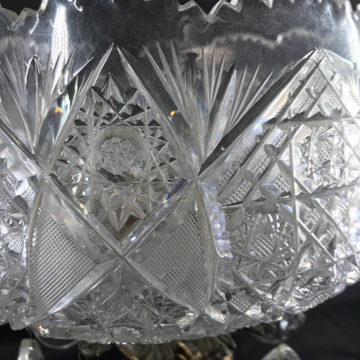 Cut crystal atop a metal base. The base is quite oxidized and one of the dangling crystals is missing. Extremely heavy; see pictures.