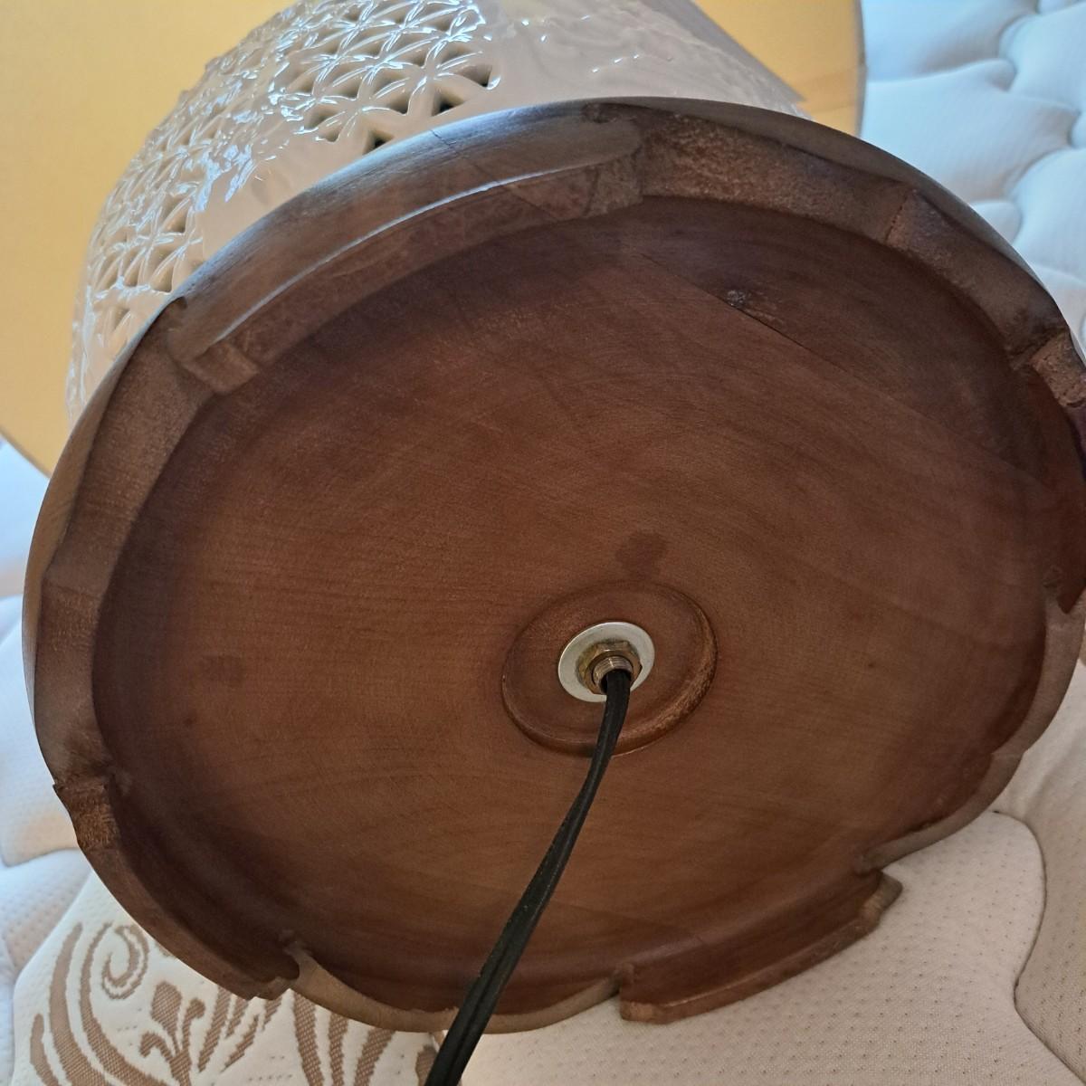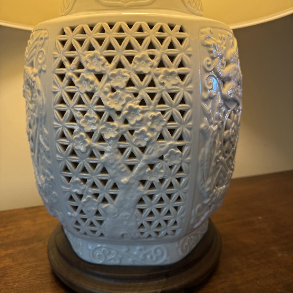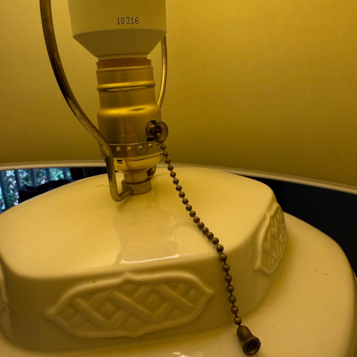 This lot contains a large ornate what appears to be porcelain lamp. The lamp is white with a wooden base and has some stunning designs of birds with trees and flowers. The base has a 10”D and the lamp sits about 25”H. It comes with an off white lamp shade and does turn on with a chain pull and is a one way switch. Shipping available. Shipping can be costly. We suggest contacting our preferred local shipping provider, Postage Express, with dimensions and getting an estimate before bidding: (828) 255-9250 or shipping@postageexpressnc.com.
