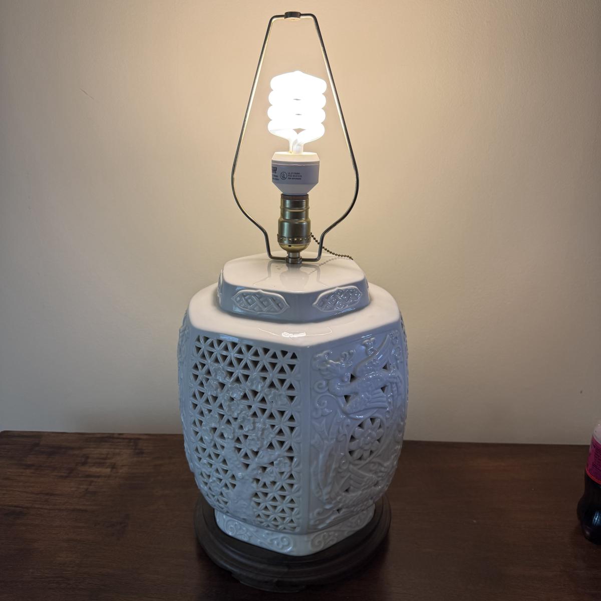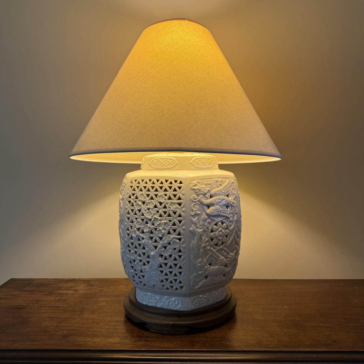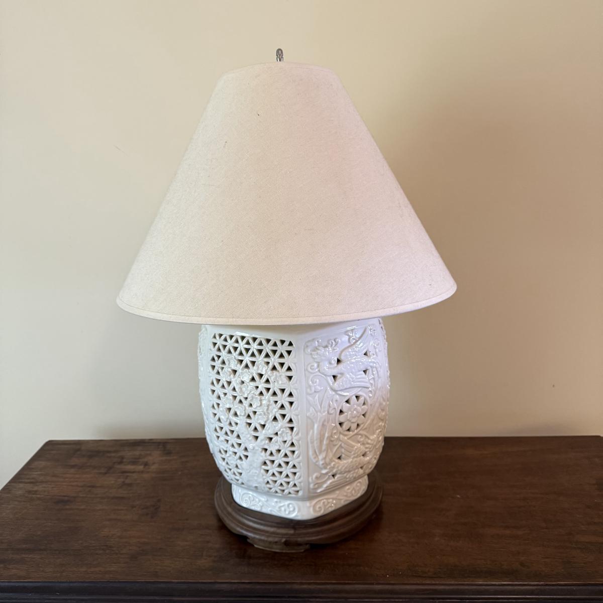 This lot contains a large ornate what appears to be porcelain lamp. The lamp is white with a wooden base and has some stunning designs of birds with trees and flowers. The base has a 10”D and the lamp sits about 25”H. It comes with an off white lamp shade and does turn on with a chain pull and is a one way switch. Shipping available. Shipping can be costly. We suggest contacting our preferred local shipping provider, Postage Express, with dimensions and getting an estimate before bidding: (828) 255-9250 or shipping@postageexpressnc.com.