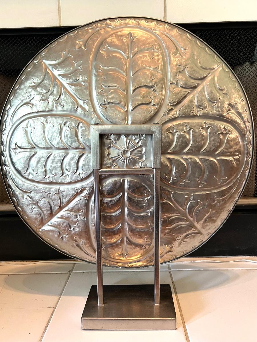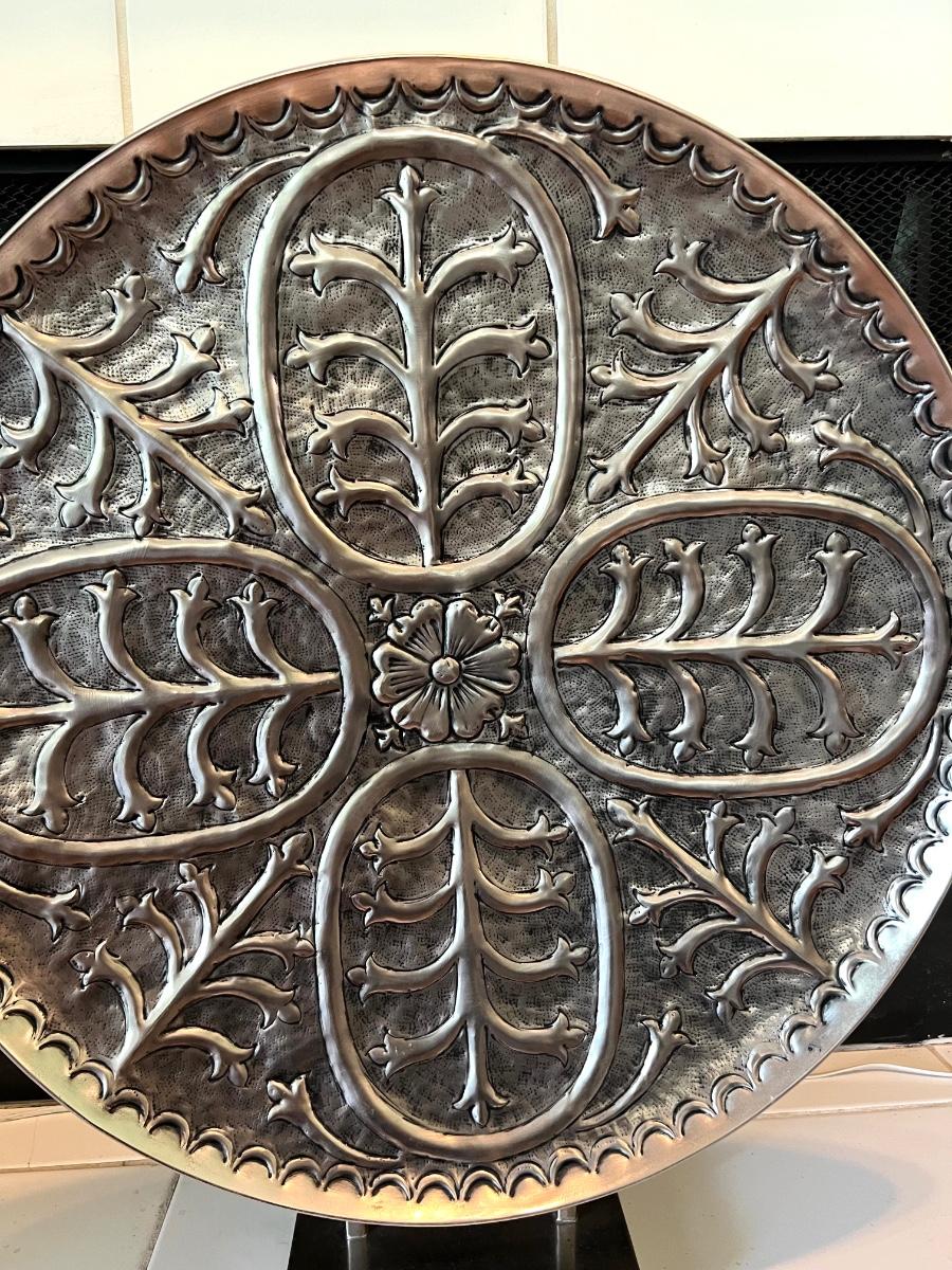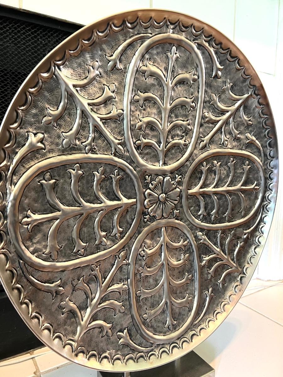 Ornate Silver Home Decor on a stand measures 27 inches tall and 24 inches round.