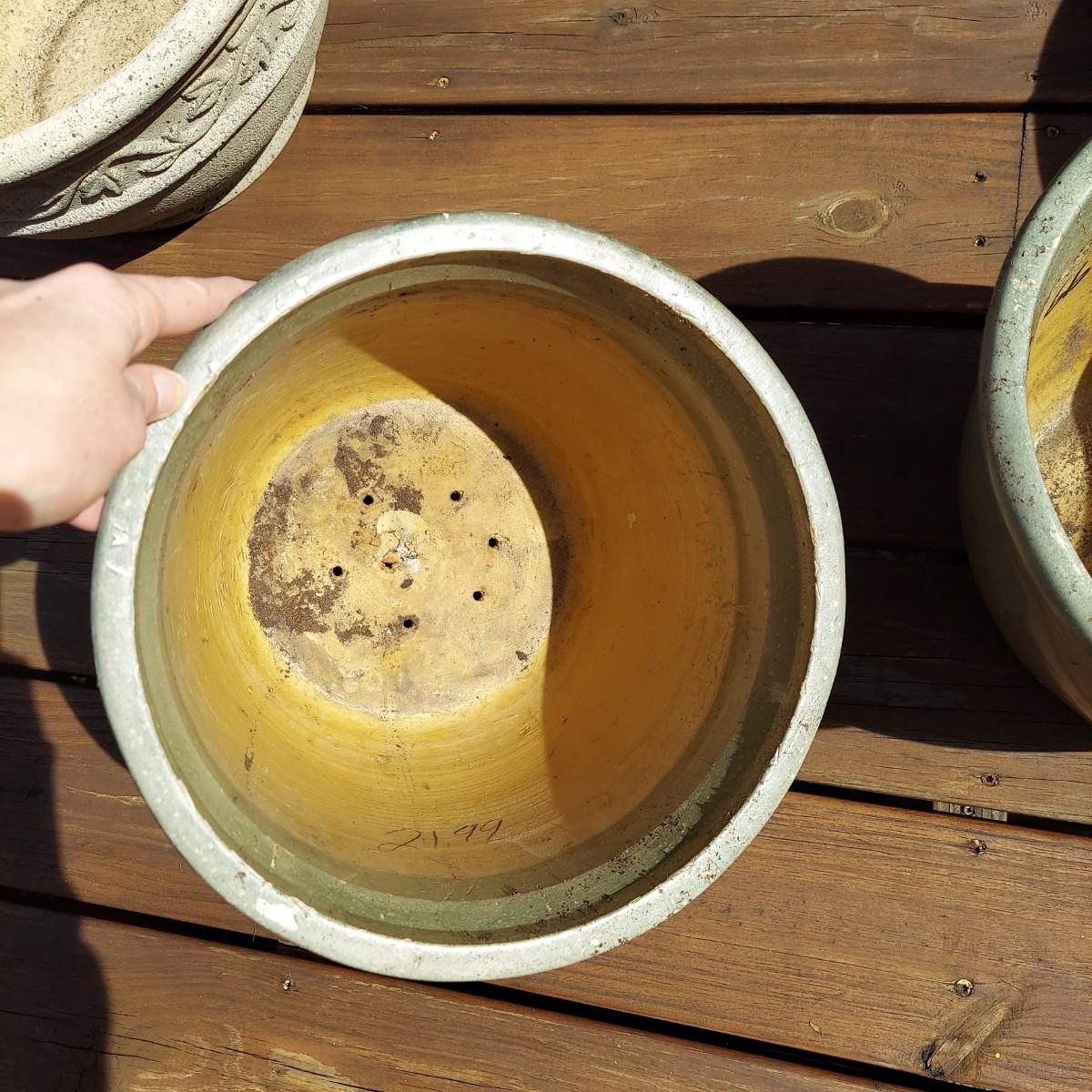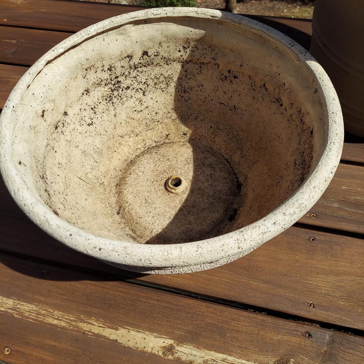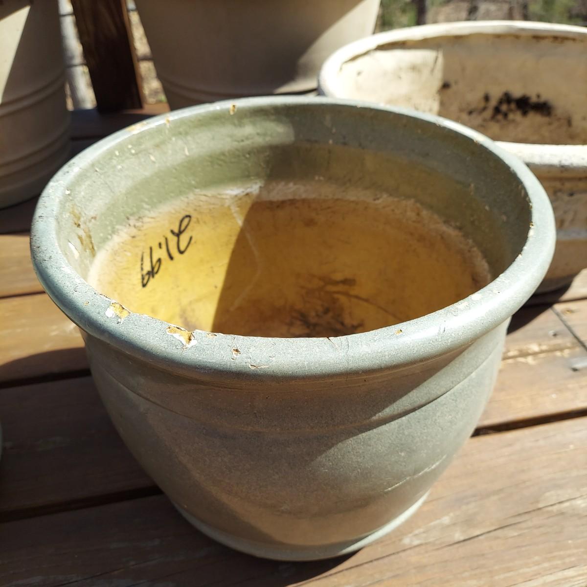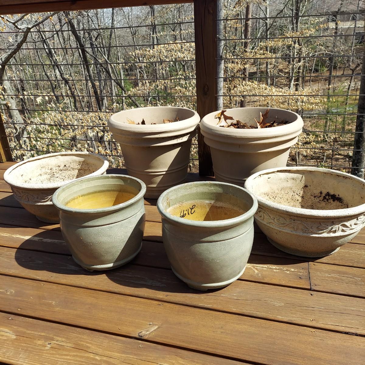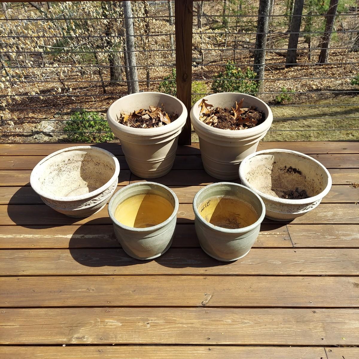 Lot includes six large outdoor pots that are made to look like ceramic or cement but are lightweight composite. The two largest pots have dirt in them. These were left as there may be something growing. Please discuss with a staff member should you choose to dump them. These pots measure 15"H x 16"D. Some chips on the green pots. Please see photos for details. Local Pickup Only