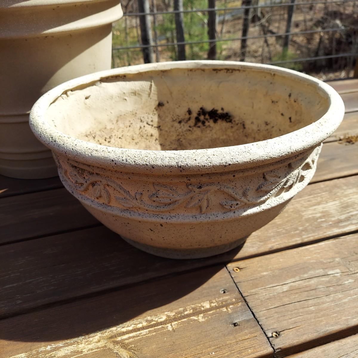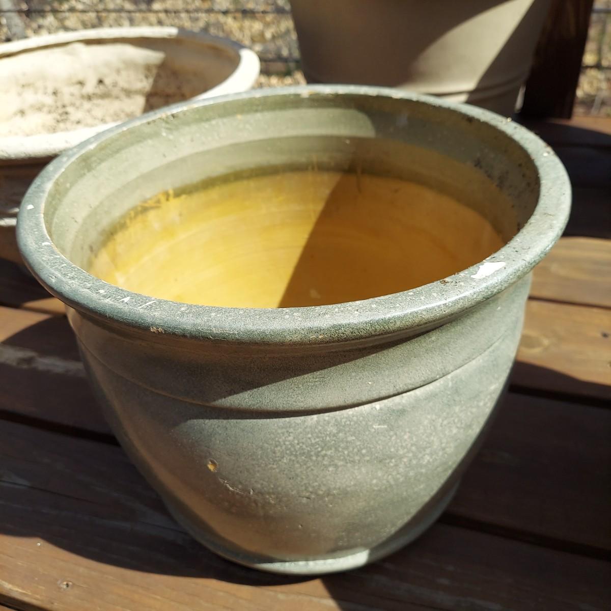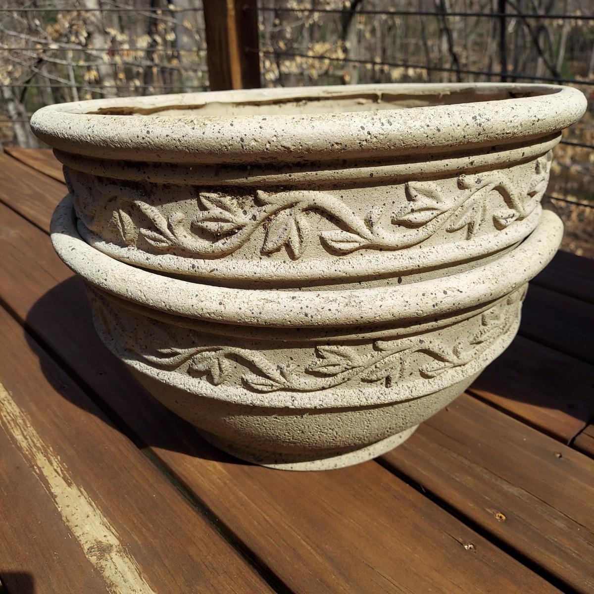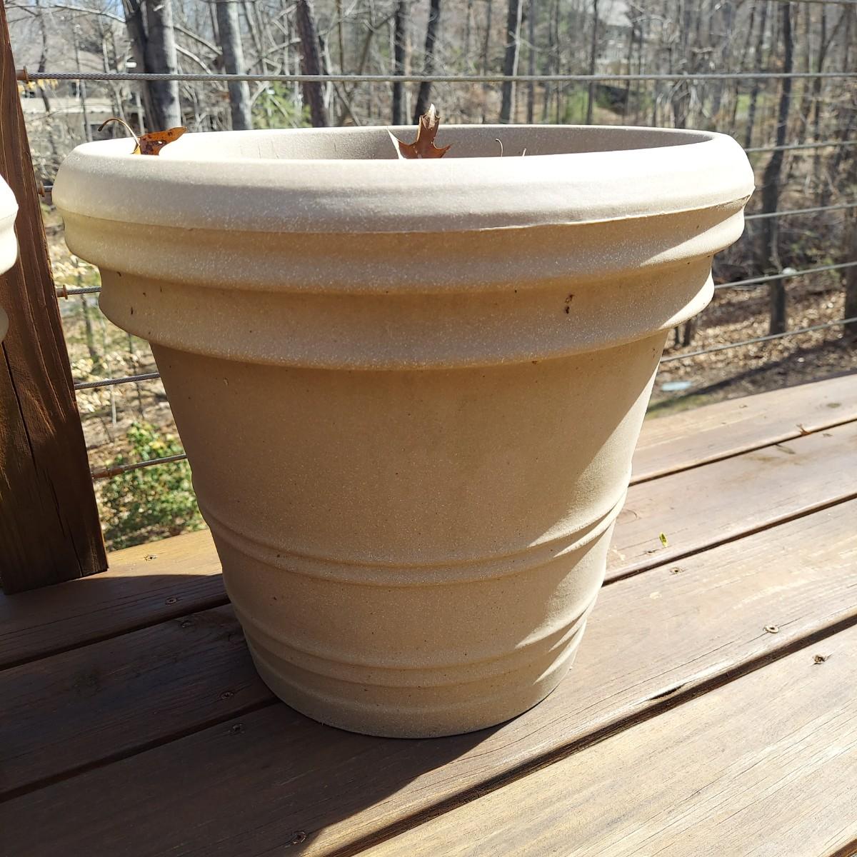 Lot includes six large outdoor pots that are made to look like ceramic or cement but are lightweight composite. The two largest pots have dirt in them. These were left as there may be something growing. Please discuss with a staff member should you choose to dump them. These pots measure 15"H x 16"D. Some chips on the green pots. Please see photos for details. Local Pickup Only
