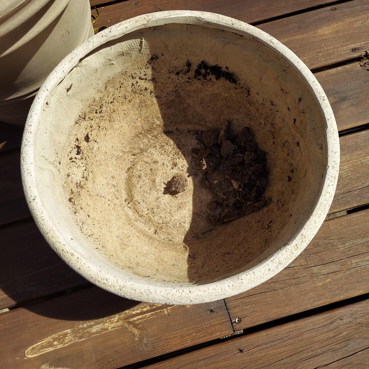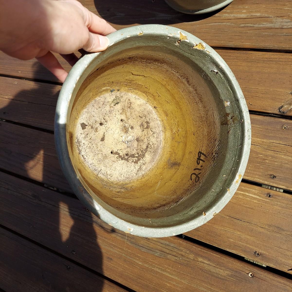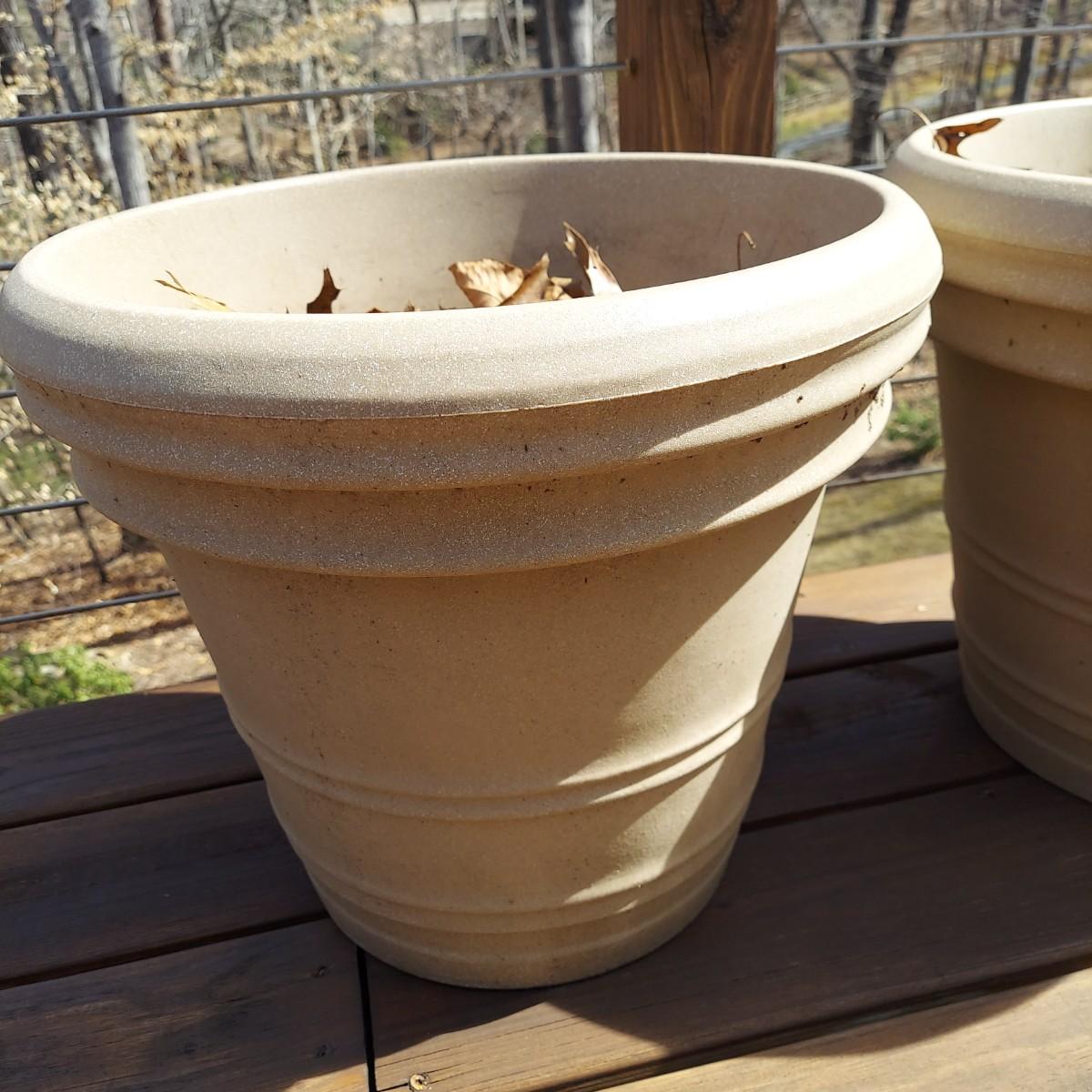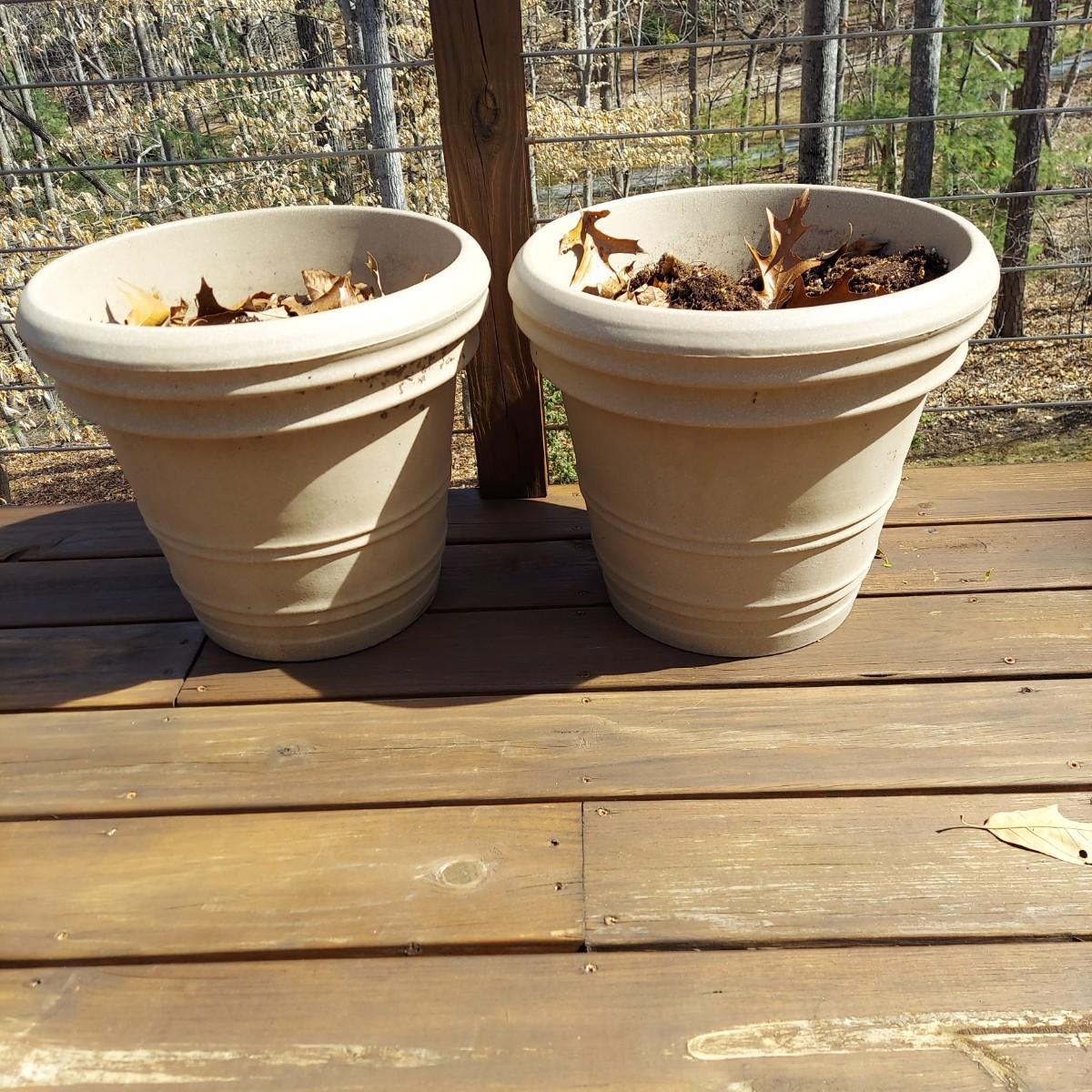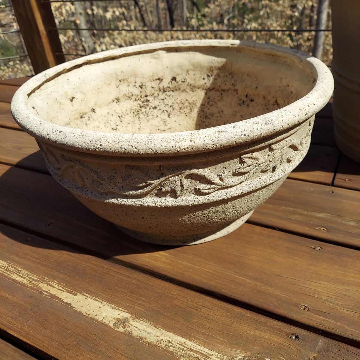 Lot includes six large outdoor pots that are made to look like ceramic or cement but are lightweight composite. The two largest pots have dirt in them. These were left as there may be something growing. Please discuss with a staff member should you choose to dump them. These pots measure 15"H x 16"D. Some chips on the green pots. Please see photos for details. Local Pickup Only
