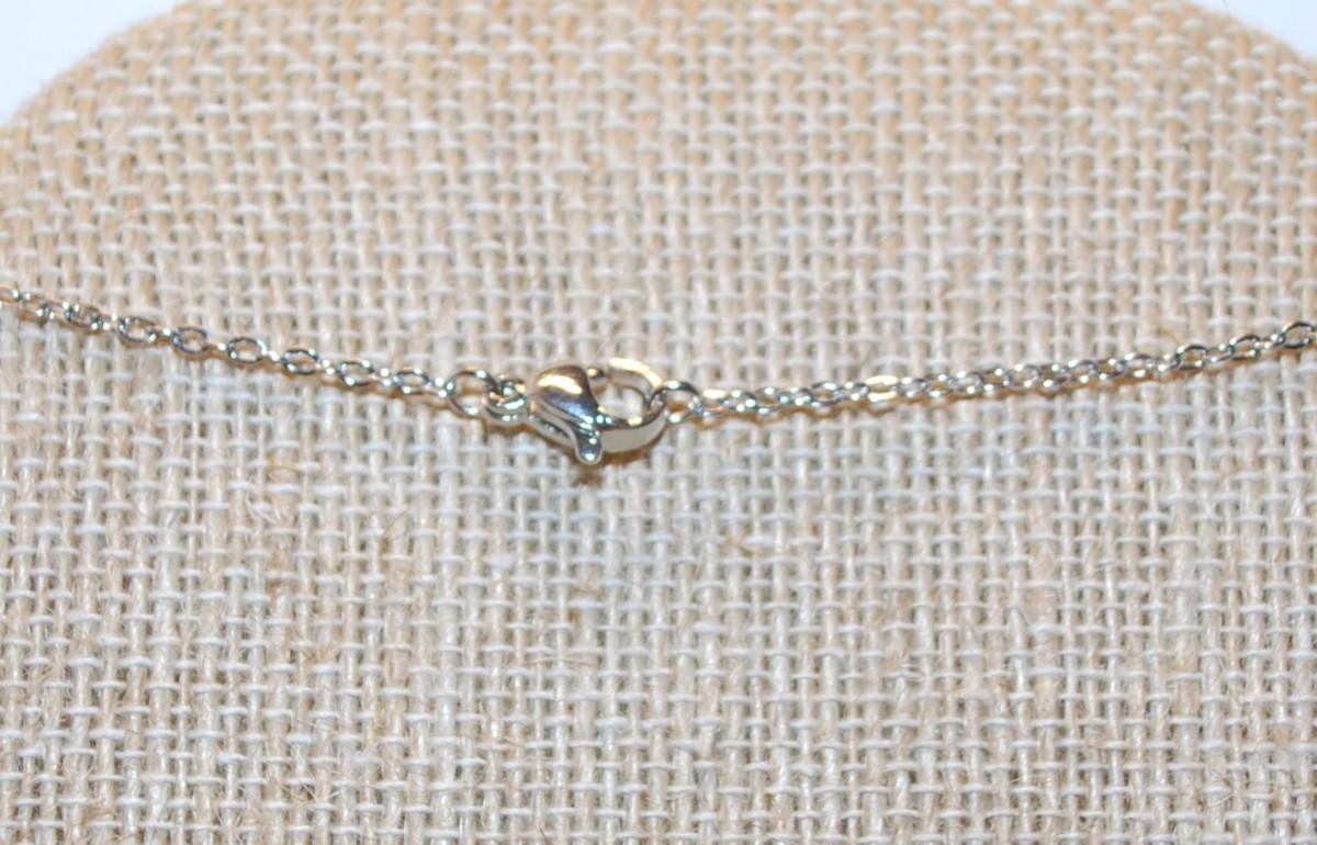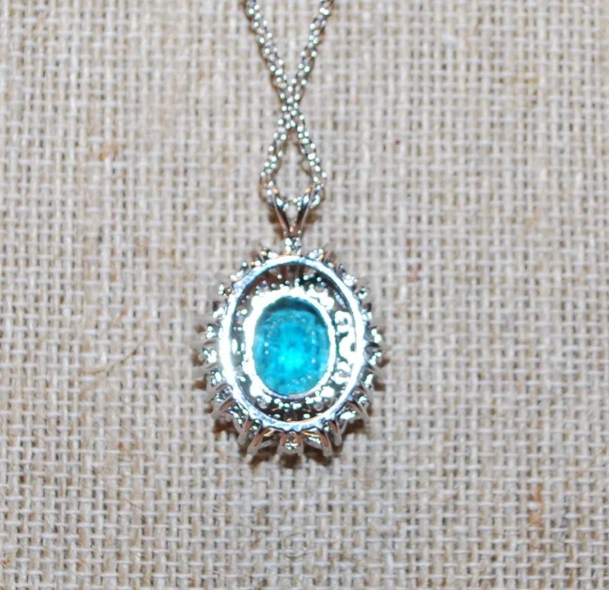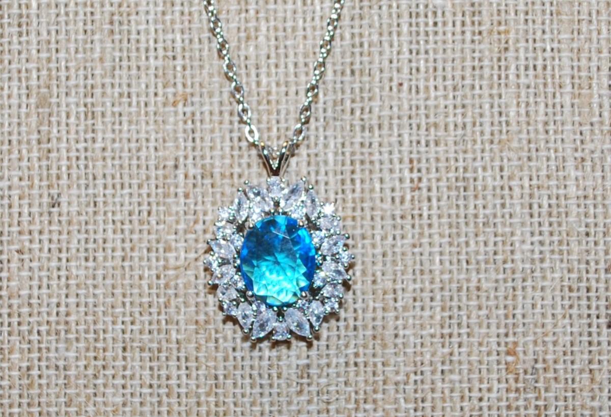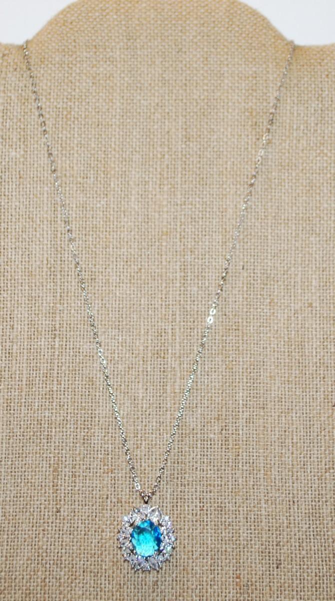 Large Oval Blue Stone PENDANT (1" x ¾") with Full Bright Surrounds on a Silver Tone Necklace Chain 17" L