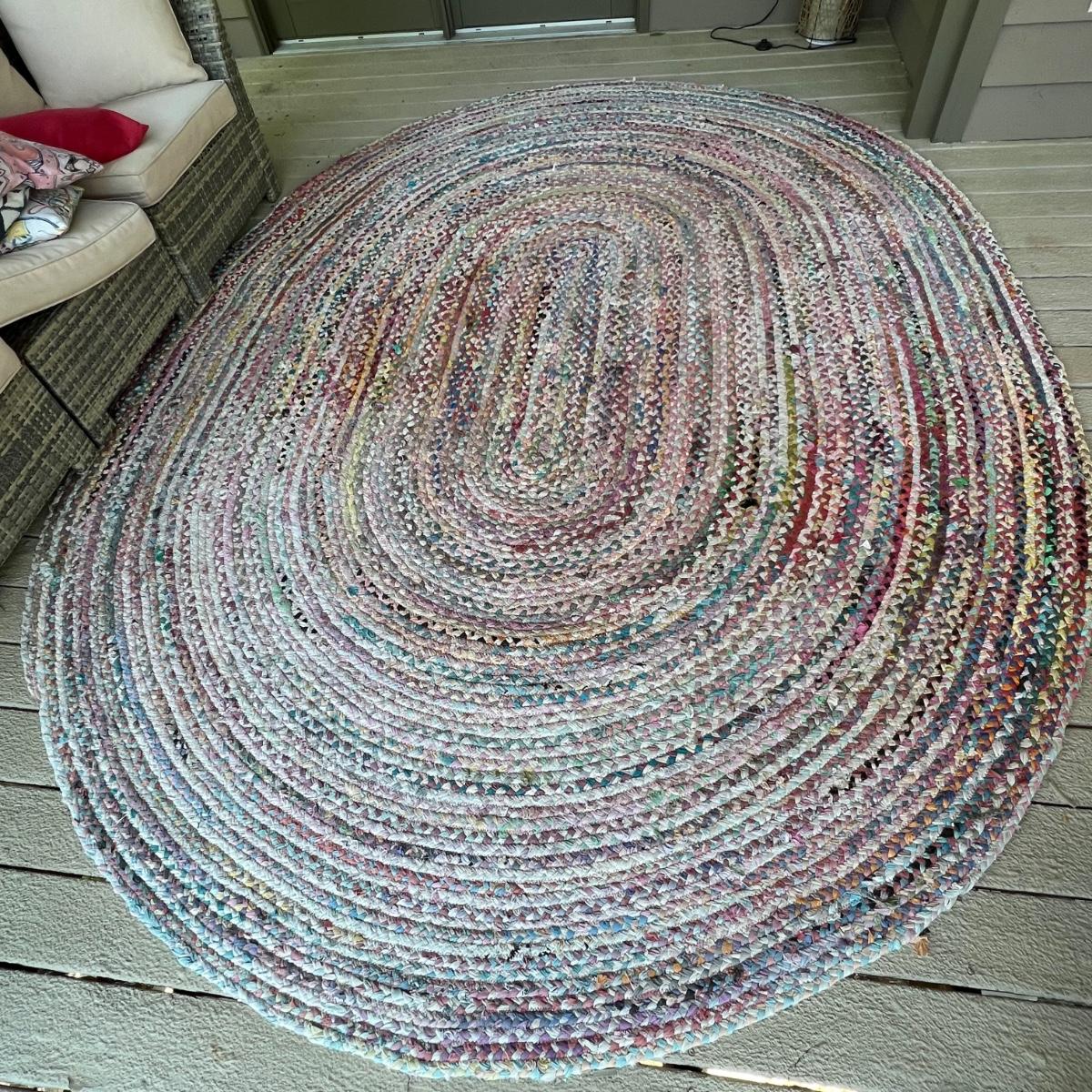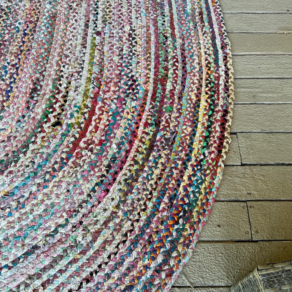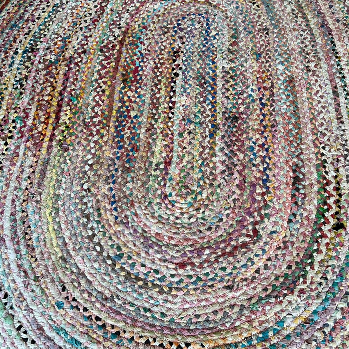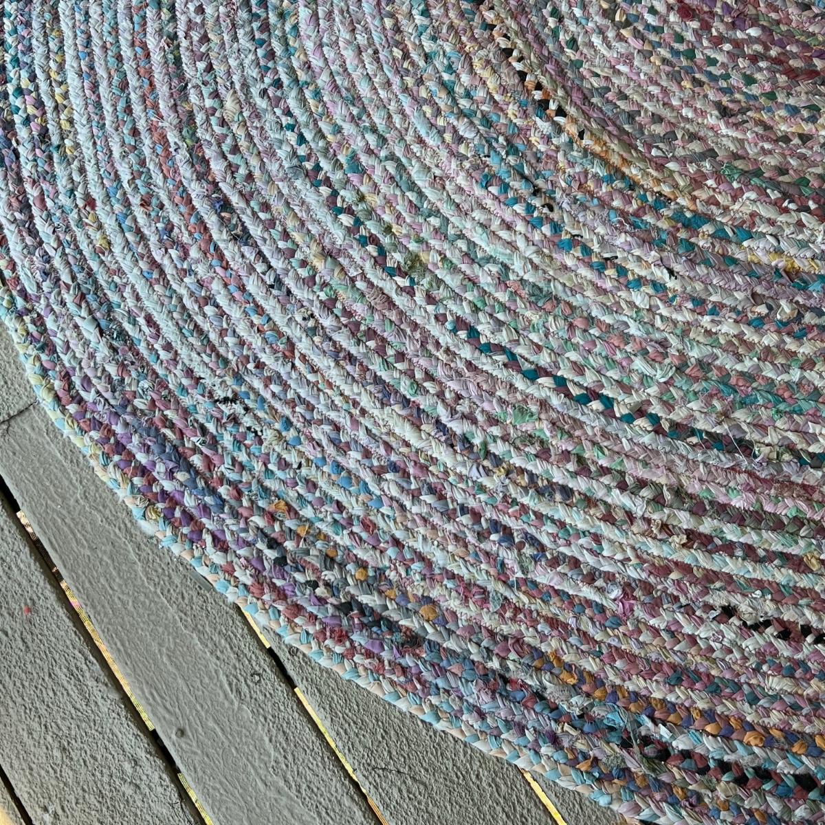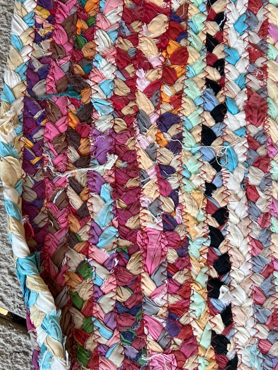 This large braided rug has some sun bleaching but as it’s reversible, the colors on the underside are more vibrant giving you two choices. Some very minor fraying, see images.